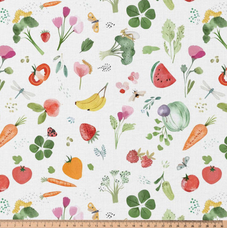 Dieser hochwertige Baumwollstoff Popeline aus 100 % Baumwolle überzeugt mit dem exklusiven französischen Digitaldruck „Vitam“. Das fröhliche Dessin zeigt eine liebevoll illustrierte Vielfalt aus Früchten, Gemüse, Blüten und kleinen Naturmotiven auf weißem Grund. Die bunten, harmonisch abgestimmten Farben wirken lebendig, modern und zugleich angenehm ruhig – perfekt für kreative Projekte rund um Kinder, Alltag und Wohnen.