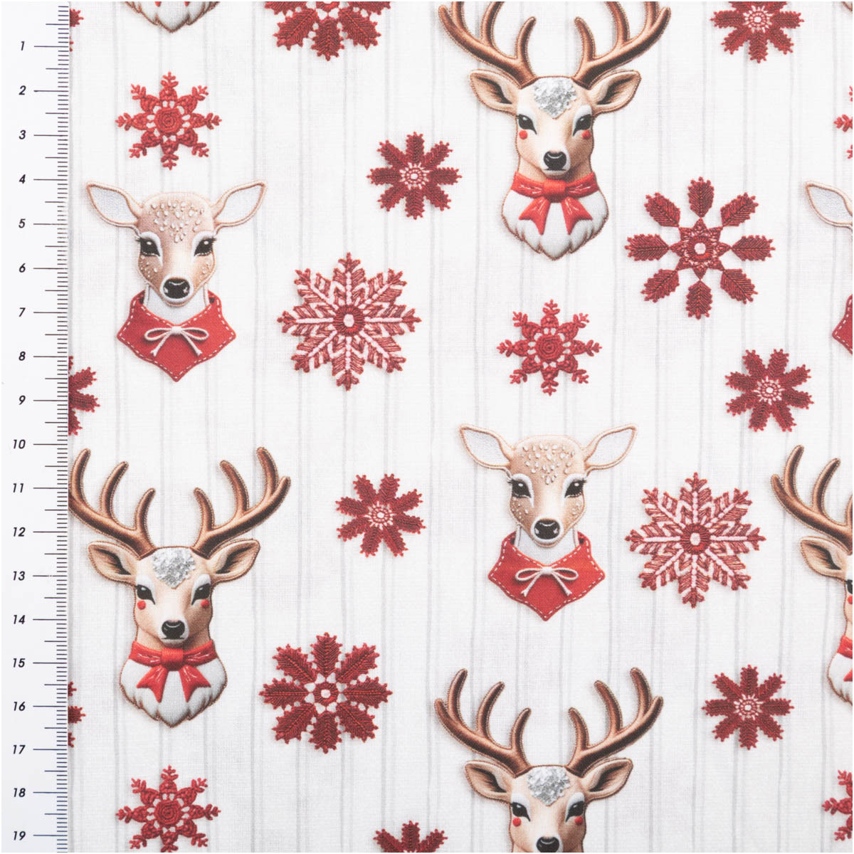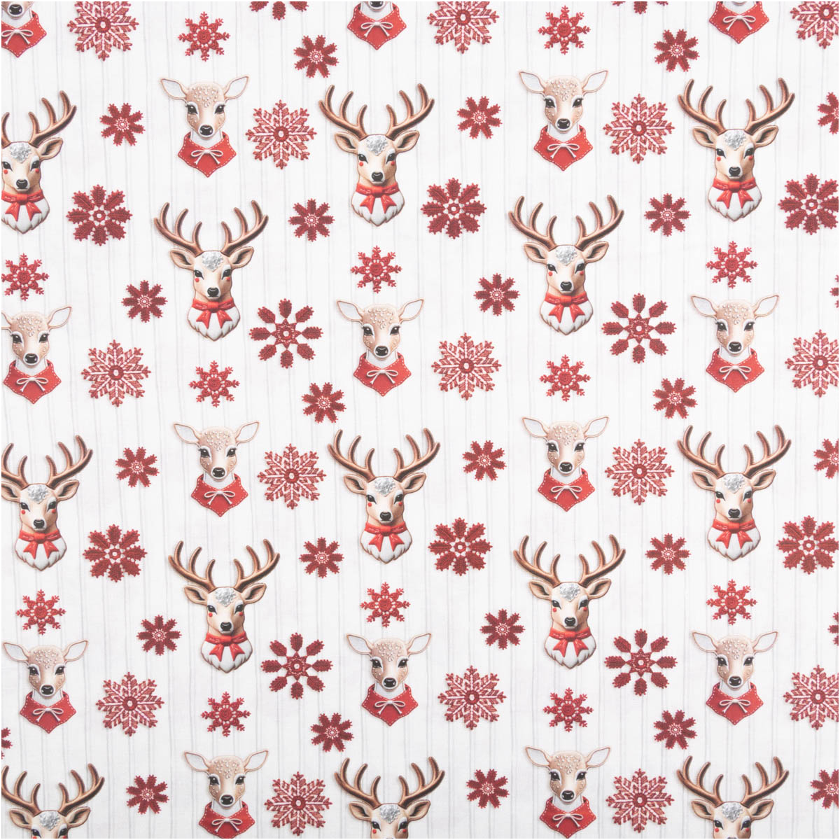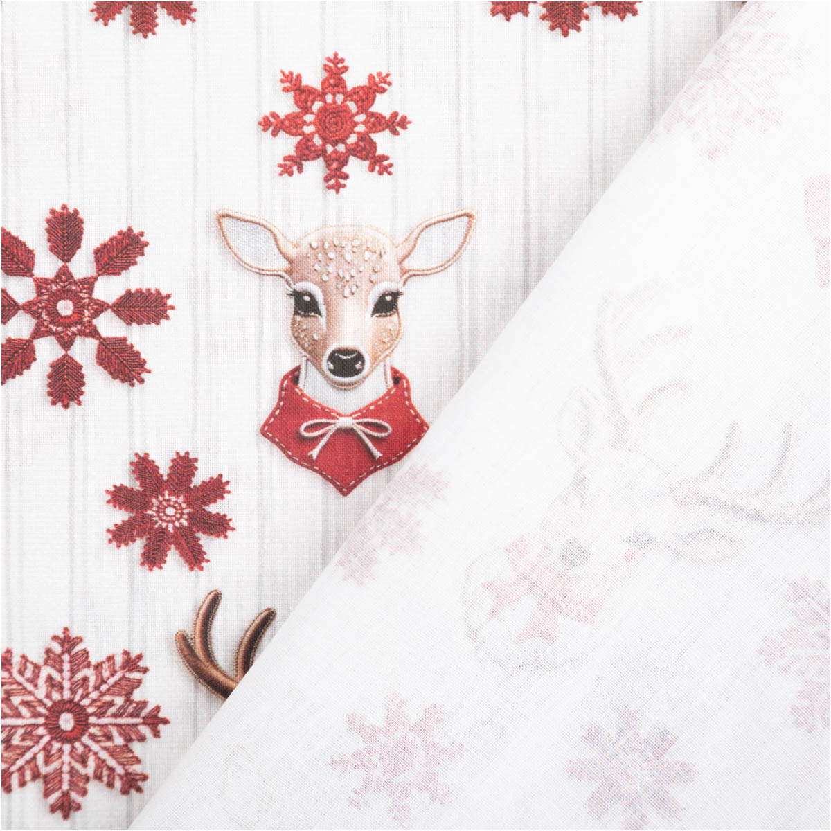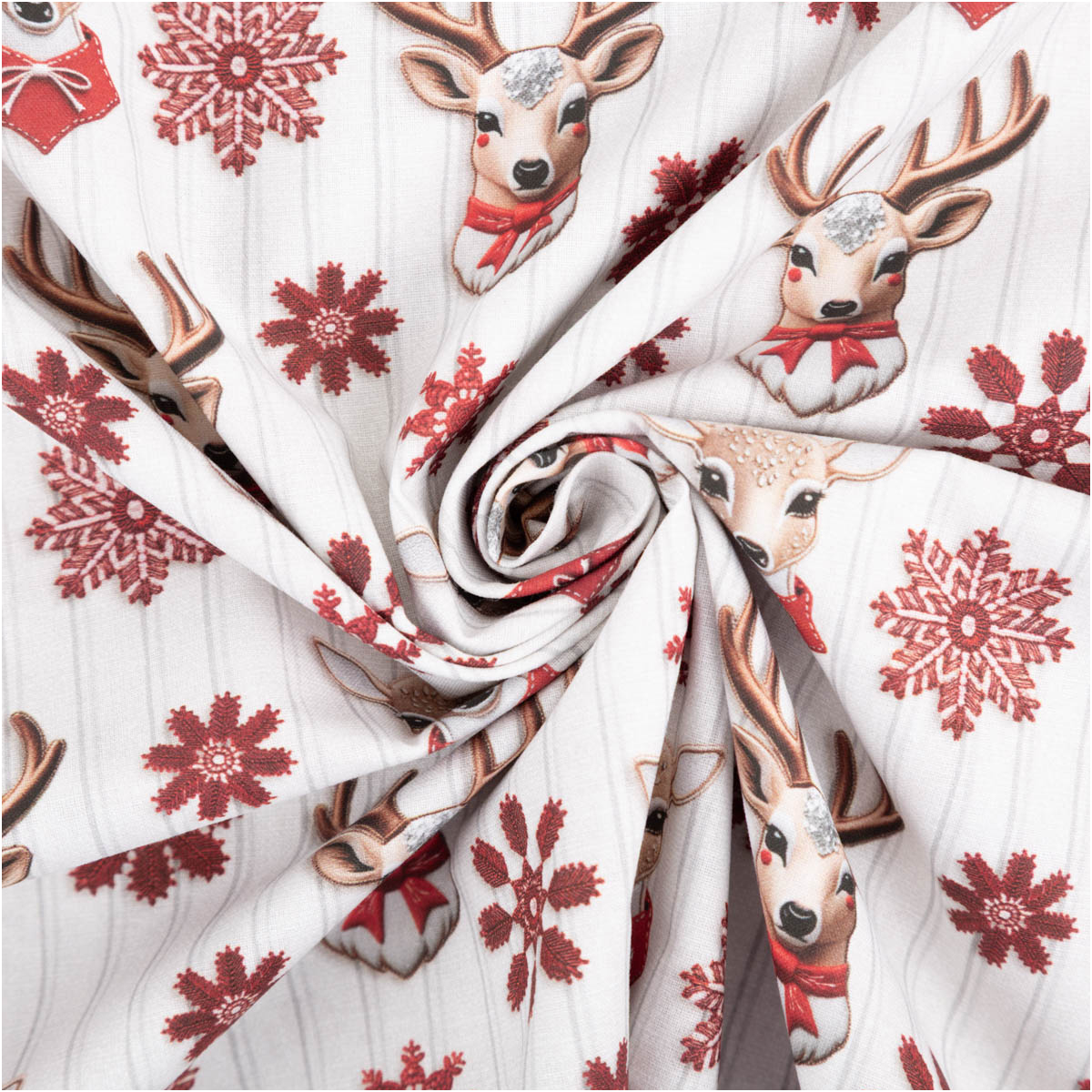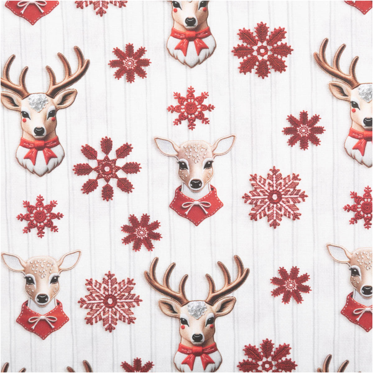 Der Baumwollstoff Popeline Cerbiche Hirsche bringt mit seinem exklusiven französischen Weihnachtsdessin festliche Stimmung in dein Zuhause. Auf ecrufarbenem Hintergrund reihen sich liebevoll gestaltete Hirschmotive mit roten Details, kombiniert mit stilisierten Schneeflocken – ein stimmungsvolles Muster, das Tradition und Gemütlichkeit perfekt verbindet.