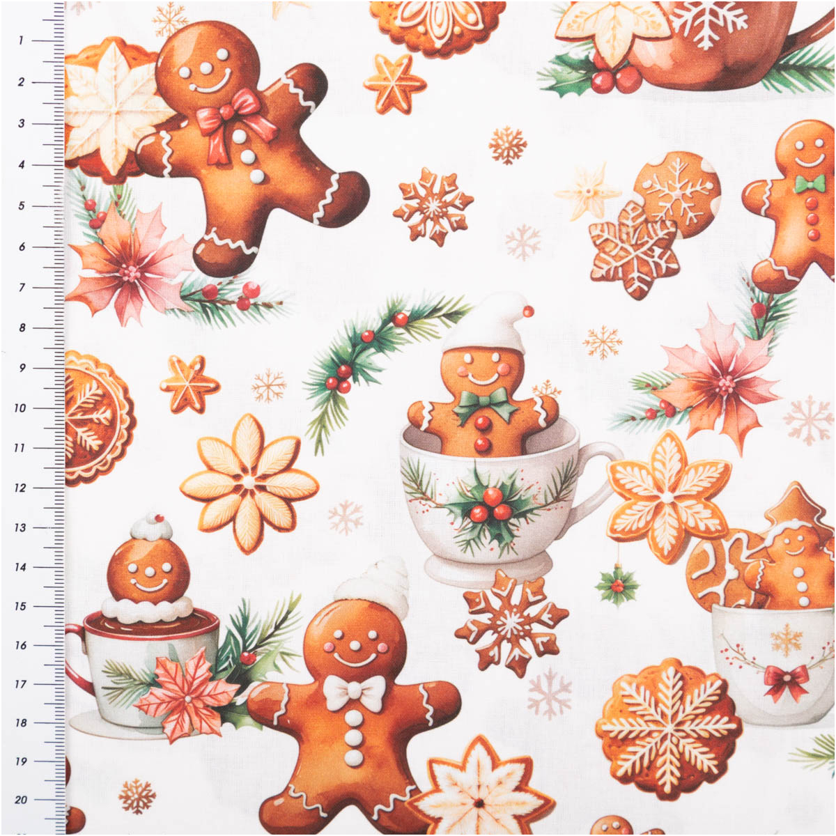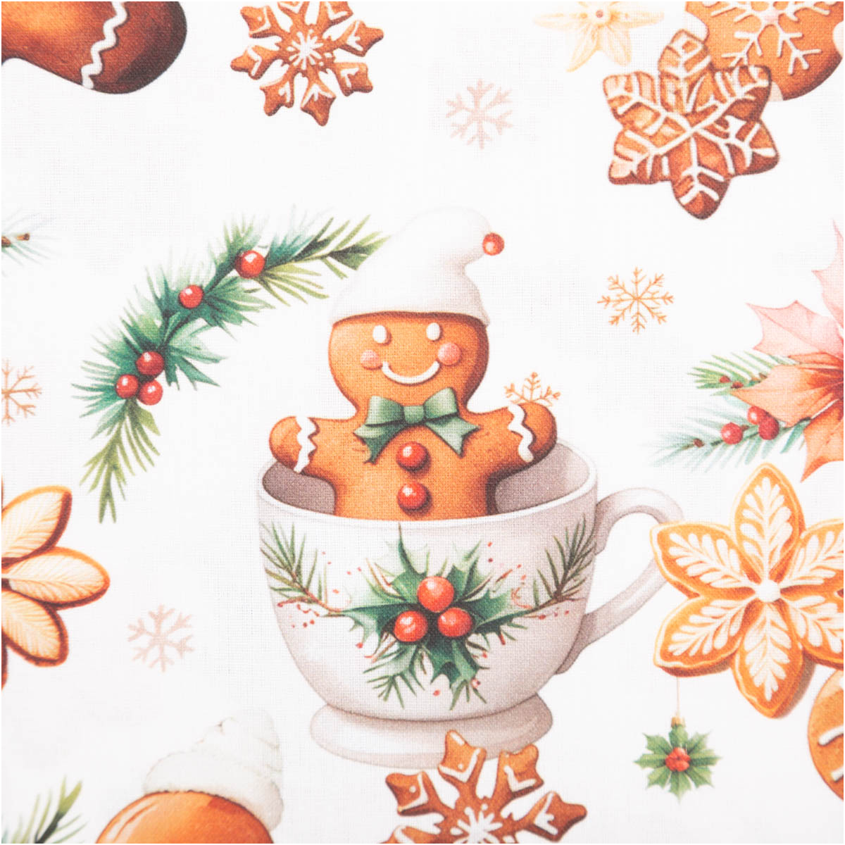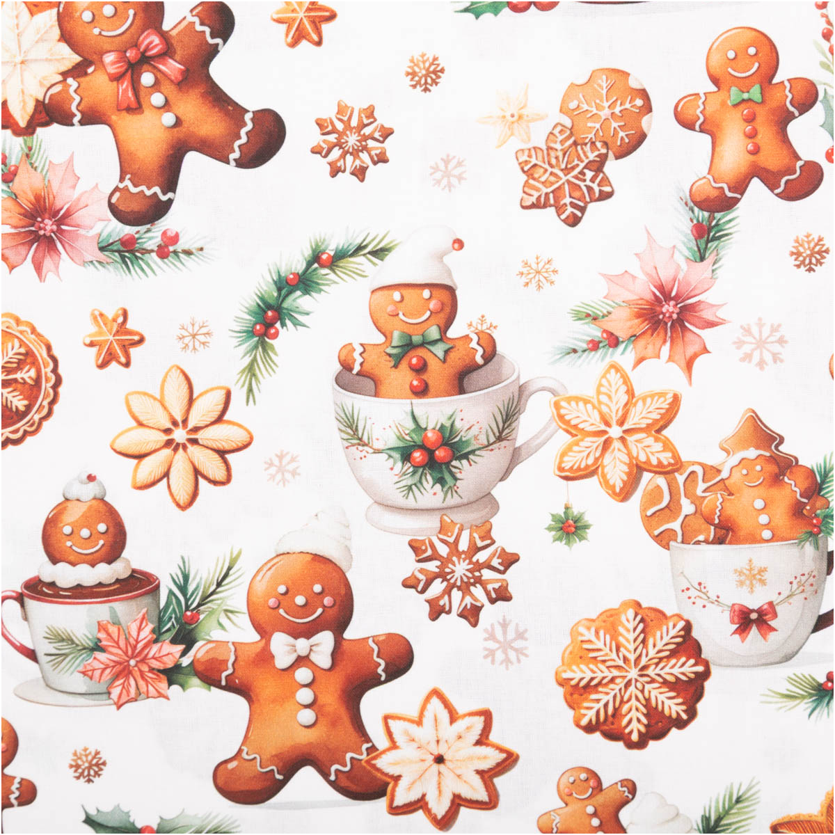 Das exklusive Weihnachtsdessin aus Frankreich bringt die süße Welt der Lebkuchenmänner und Plätzchen direkt auf deinen Nähtisch. Dank des hochwertigen Digitaldrucks wirken die Motive besonders detailreich und lebendig: fröhliche Lebkuchenfiguren, Tassen mit Kakao, weihnachtliche Sterne und winterliche Zweige.