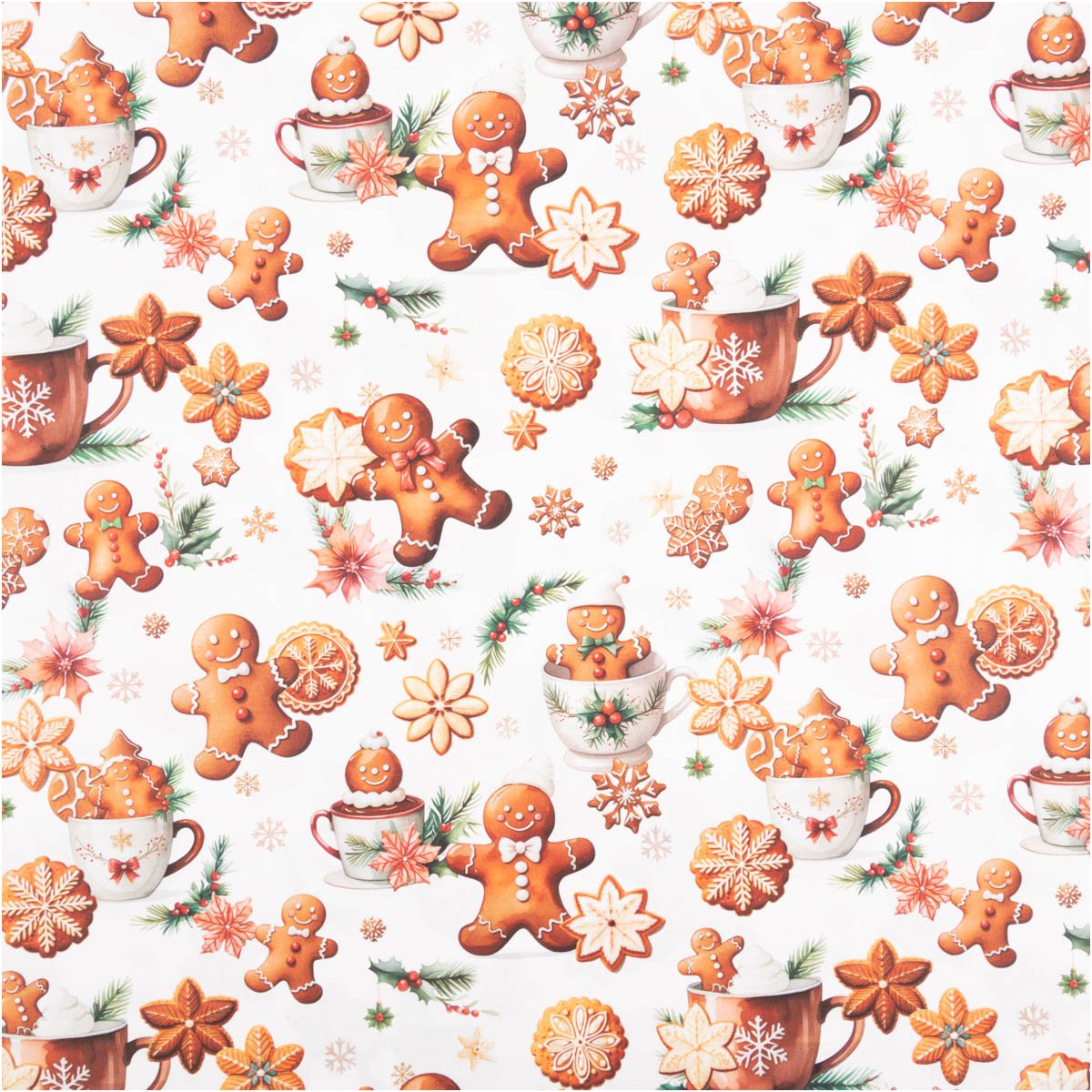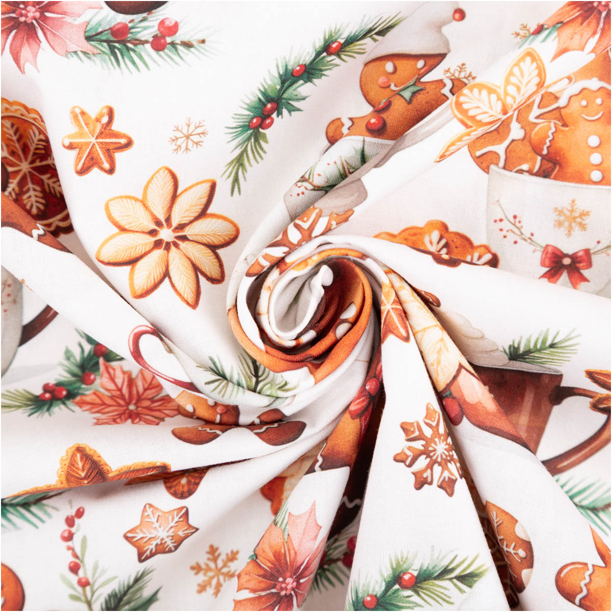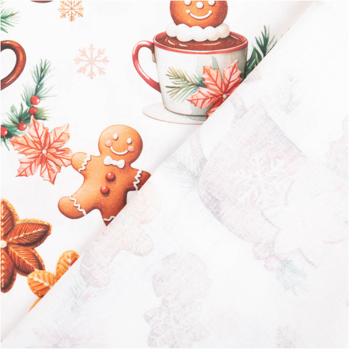 Das exklusive Weihnachtsdessin aus Frankreich bringt die süße Welt der Lebkuchenmänner und Plätzchen direkt auf deinen Nähtisch. Dank des hochwertigen Digitaldrucks wirken die Motive besonders detailreich und lebendig: fröhliche Lebkuchenfiguren, Tassen mit Kakao, weihnachtliche Sterne und winterliche Zweige.