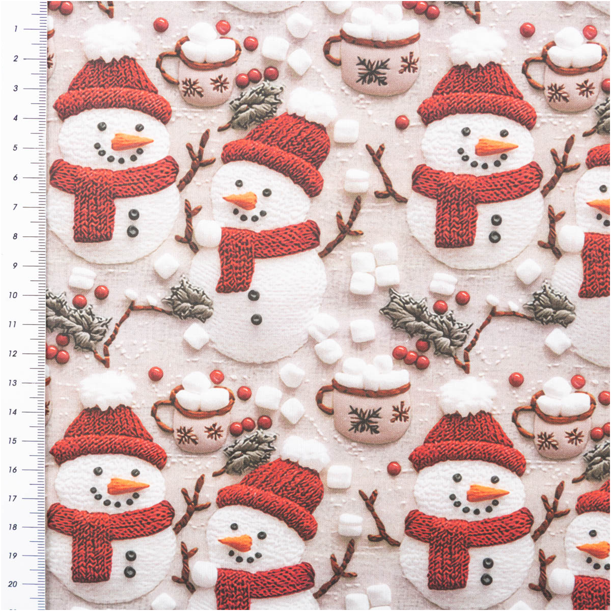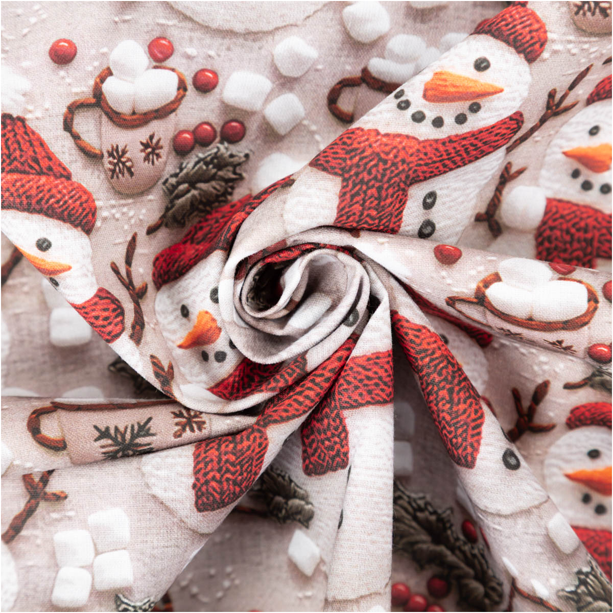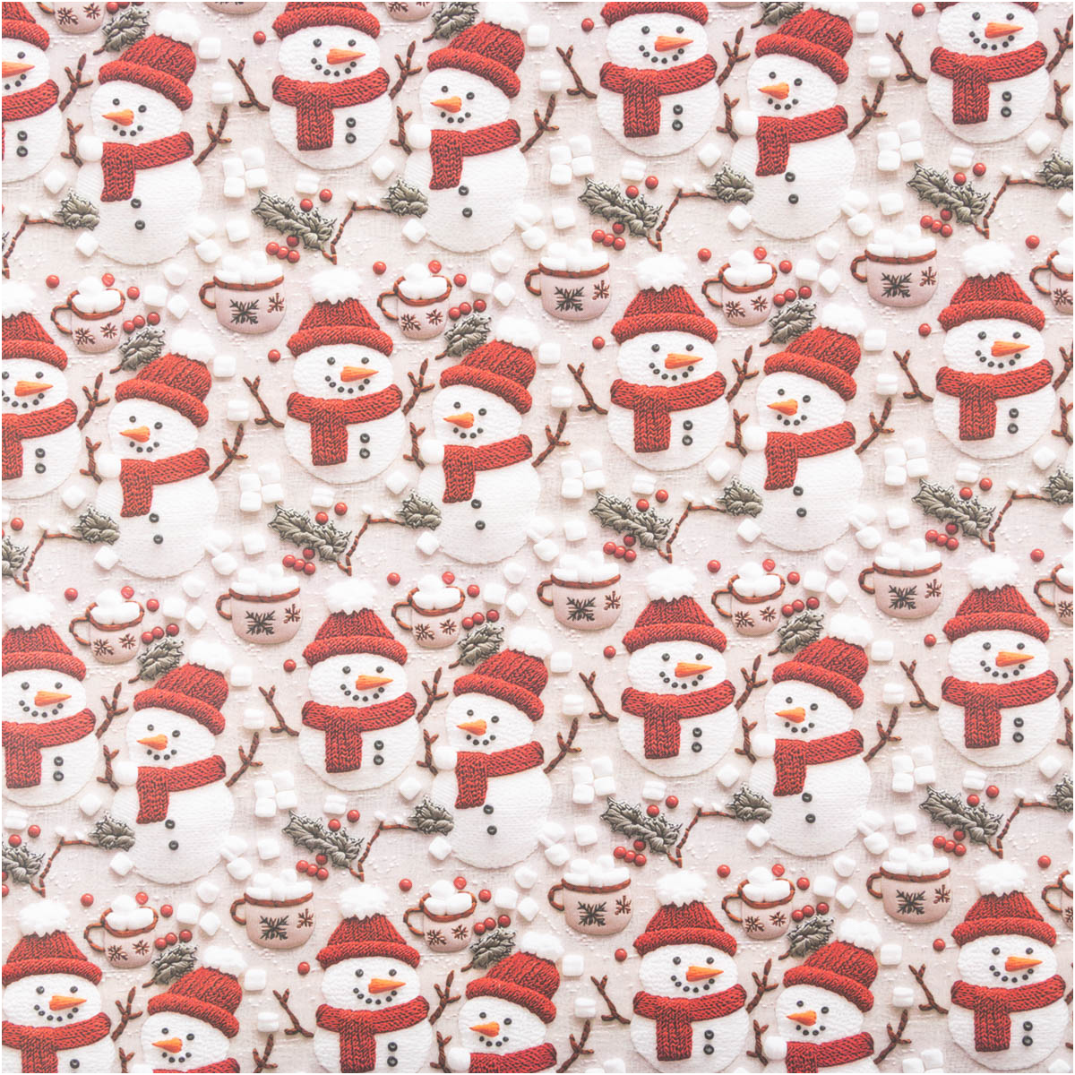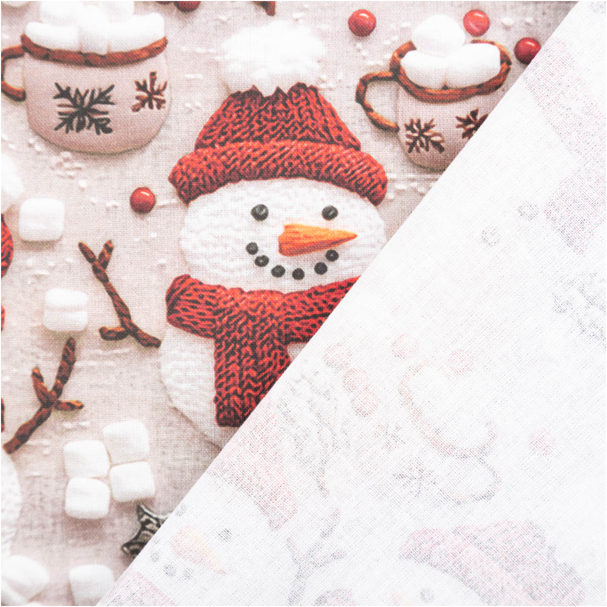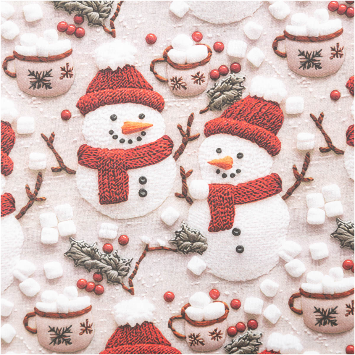 Das exklusive Weihnachtsdessin aus Frankreich wirkt durch den hochwertigen Digitaldruck besonders realistisch und detailreich. Niedliche Schneemänner mit roter Mütze und Schal, dazu winterliche Beeren, Tannenzweige und Tassen voller Marshmallows zaubern sofort festliche Stimmung.