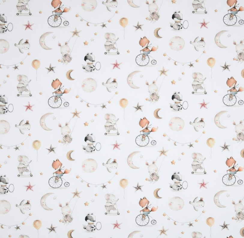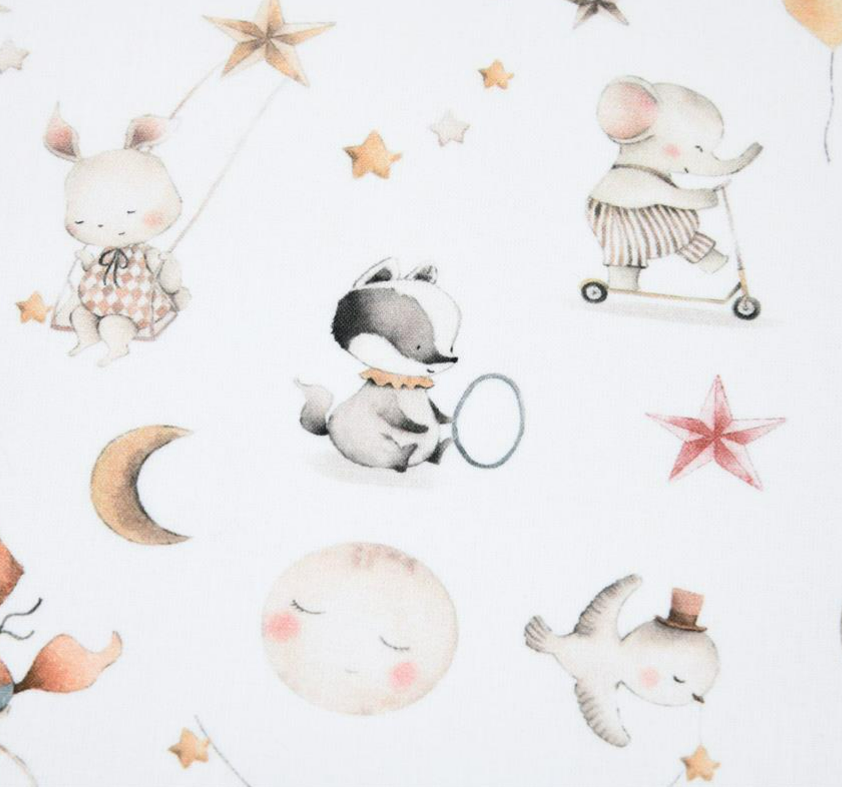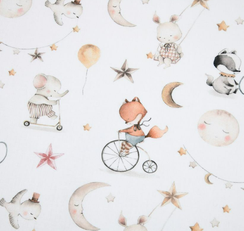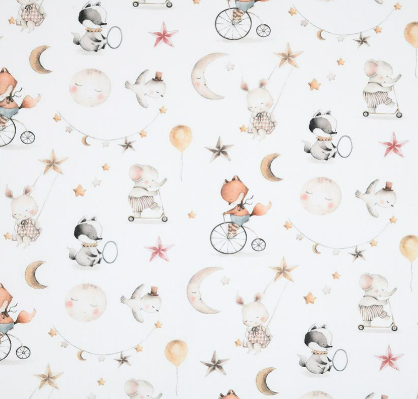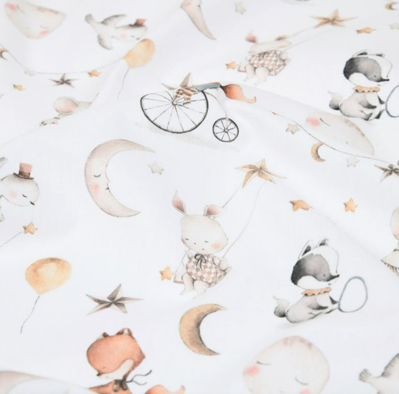 Liebevoll gestalteter Baumwollstoff mit niedlichen Tierkindern, Mond, Sternen, Ballons und verträumten Motiven auf weißem Hintergrund