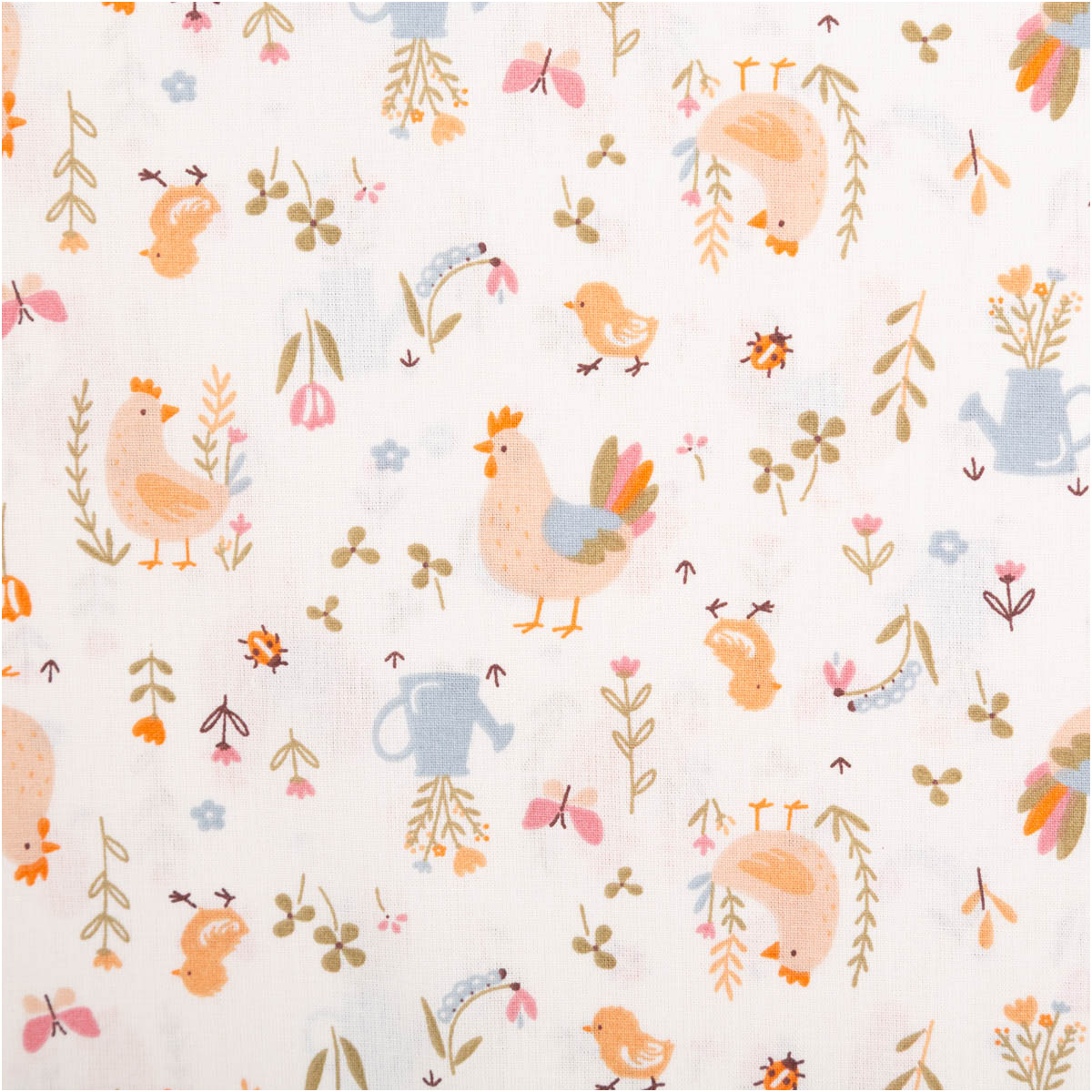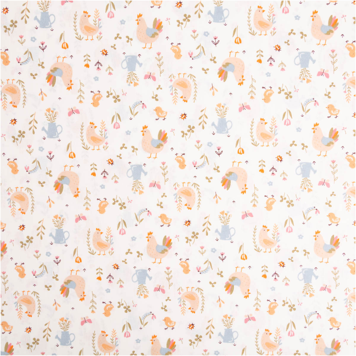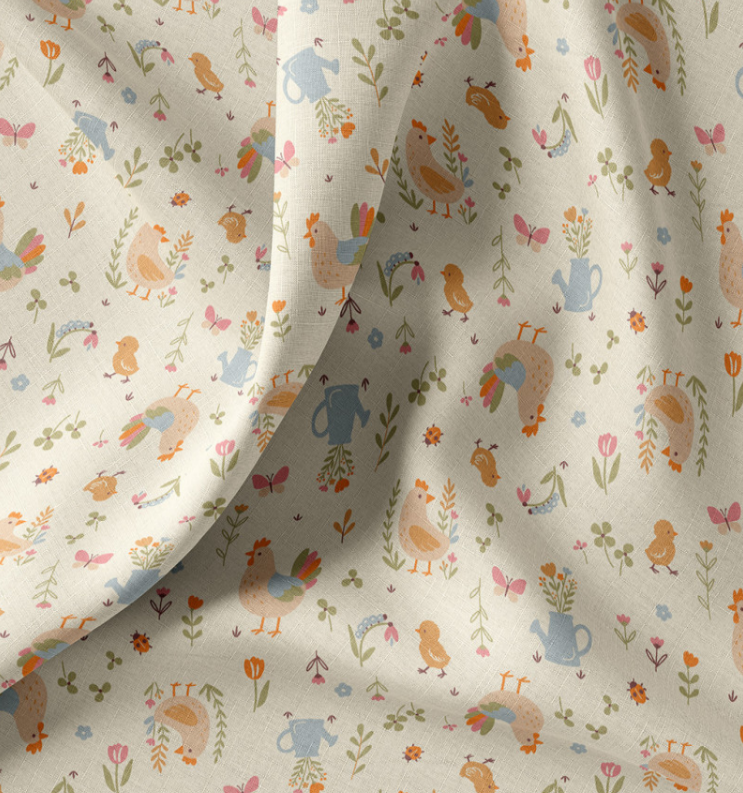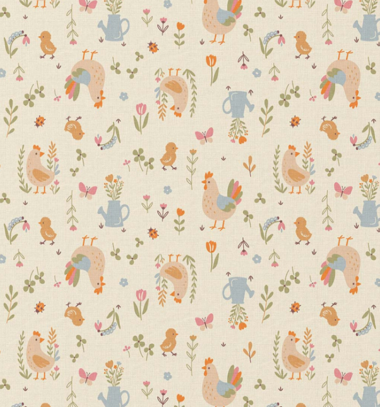 Dieser hochwertige Baumwollstoff Popeline mit liebevollem Bauernhof-Dessin zeigt Hähne, Hennen und Küken, ergänzt durch Blumen, Gießkannen und kleine Naturmotive. Die Farbgebung in ecru, orange, hellblau und zarten Grüntönen wirkt freundlich, ruhig und ideal für Kinderprojekte. Das exklusive französische Dessin ist verspielt, aber nicht überladen – perfekt für zeitlose Nähideen.