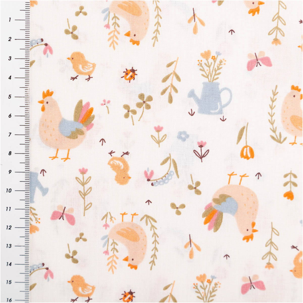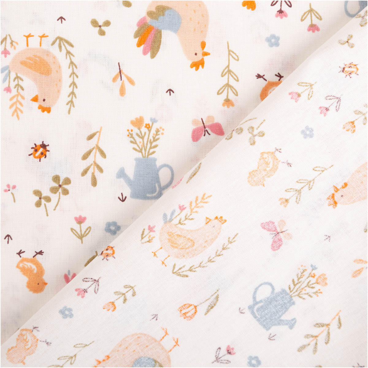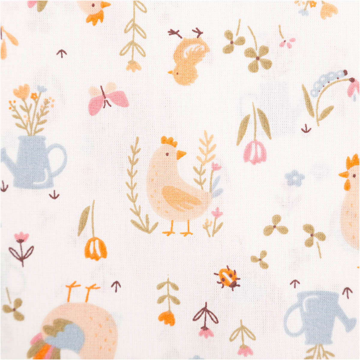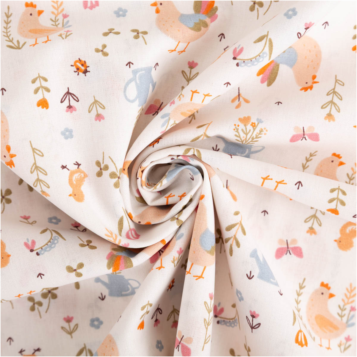 Dieser hochwertige Baumwollstoff Popeline mit liebevollem Bauernhof-Dessin zeigt Hähne, Hennen und Küken, ergänzt durch Blumen, Gießkannen und kleine Naturmotive. Die Farbgebung in ecru, orange, hellblau und zarten Grüntönen wirkt freundlich, ruhig und ideal für Kinderprojekte. Das exklusive französische Dessin ist verspielt, aber nicht überladen – perfekt für zeitlose Nähideen.