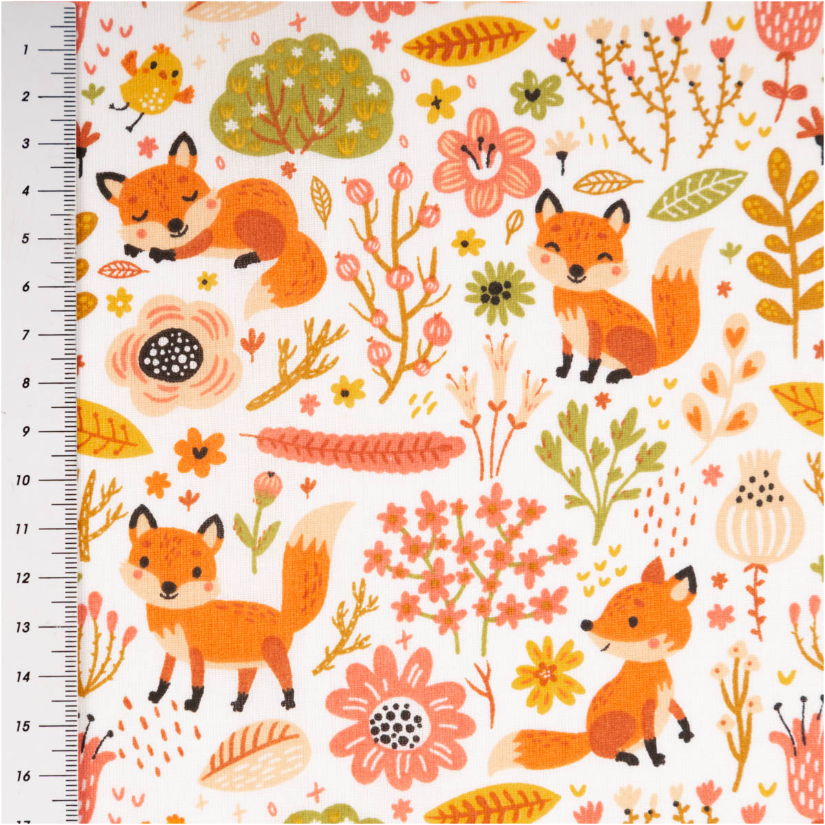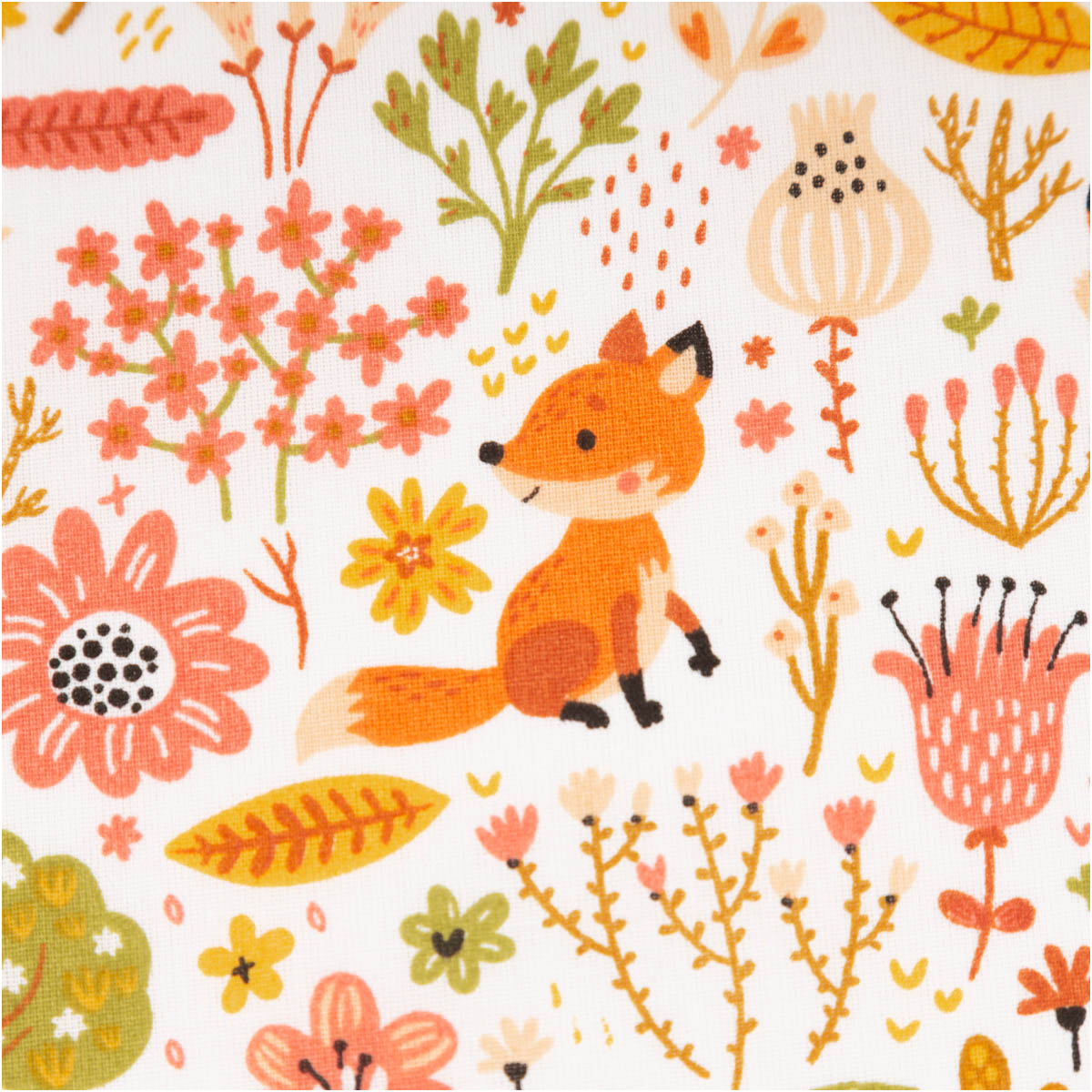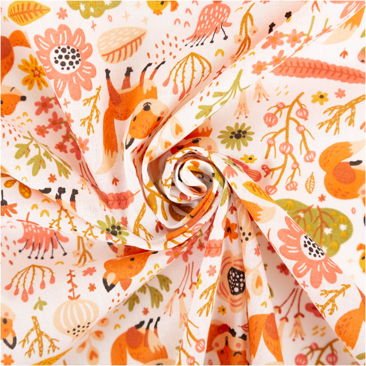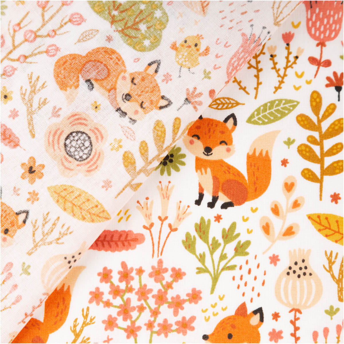 Liebevoller Baumwollstoff mit niedlichen Füchsen, Blumen, Vögeln und Waldmotiven auf weißem Hintergrund in harmonischen Orange-, Rosa- und Grüntönen