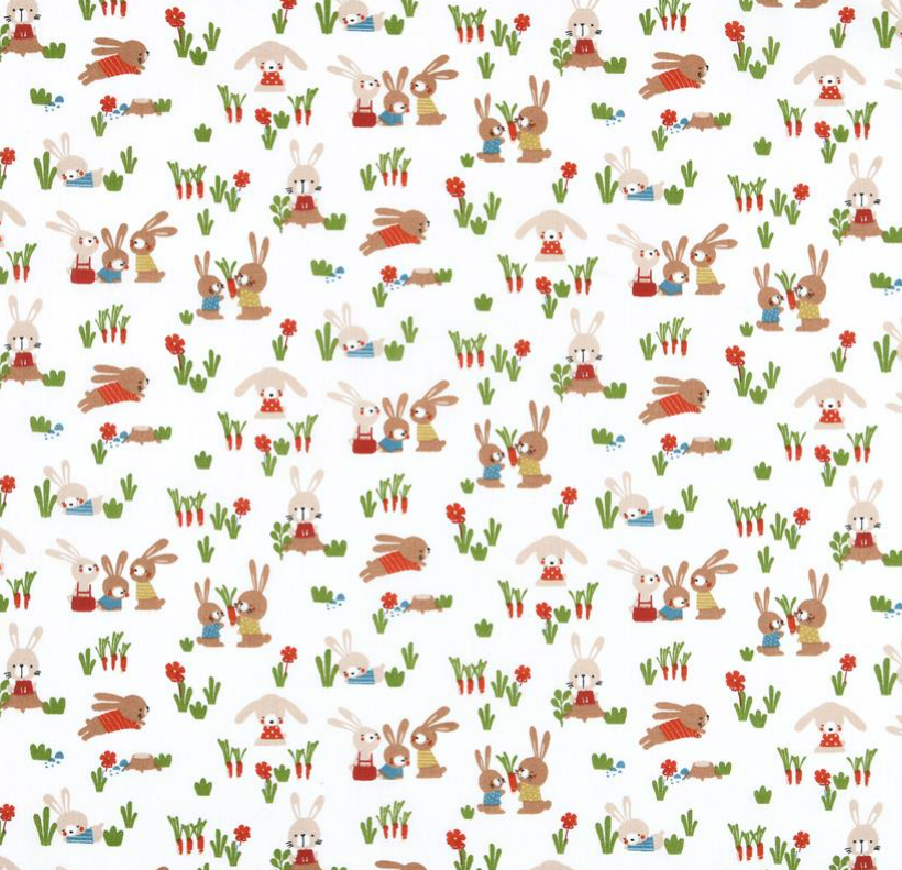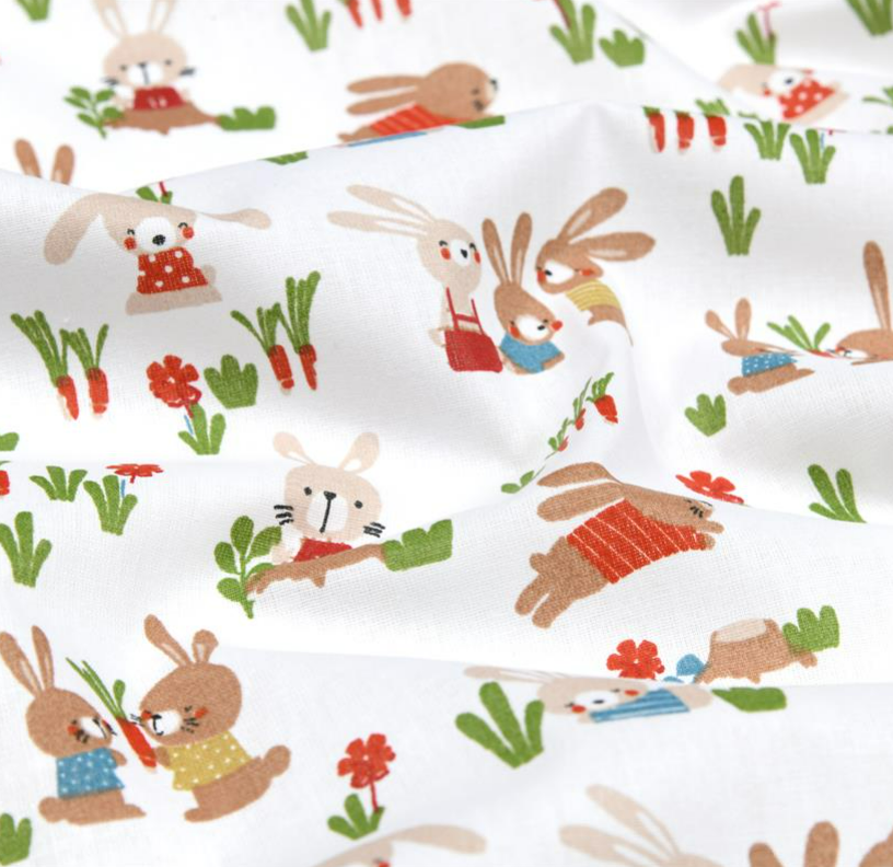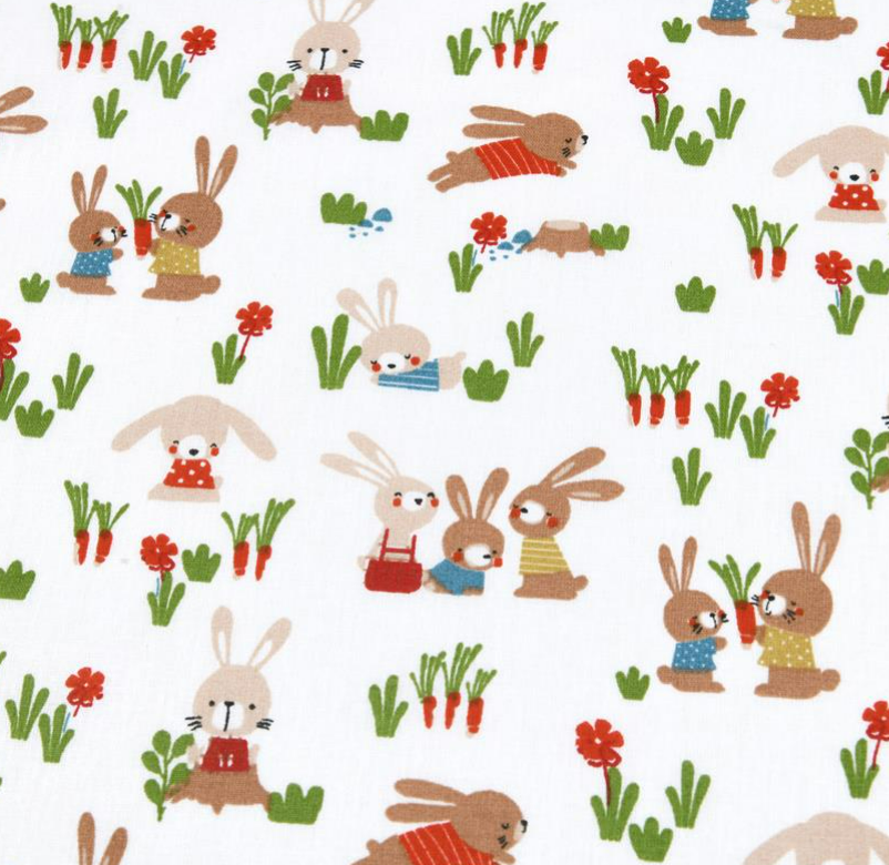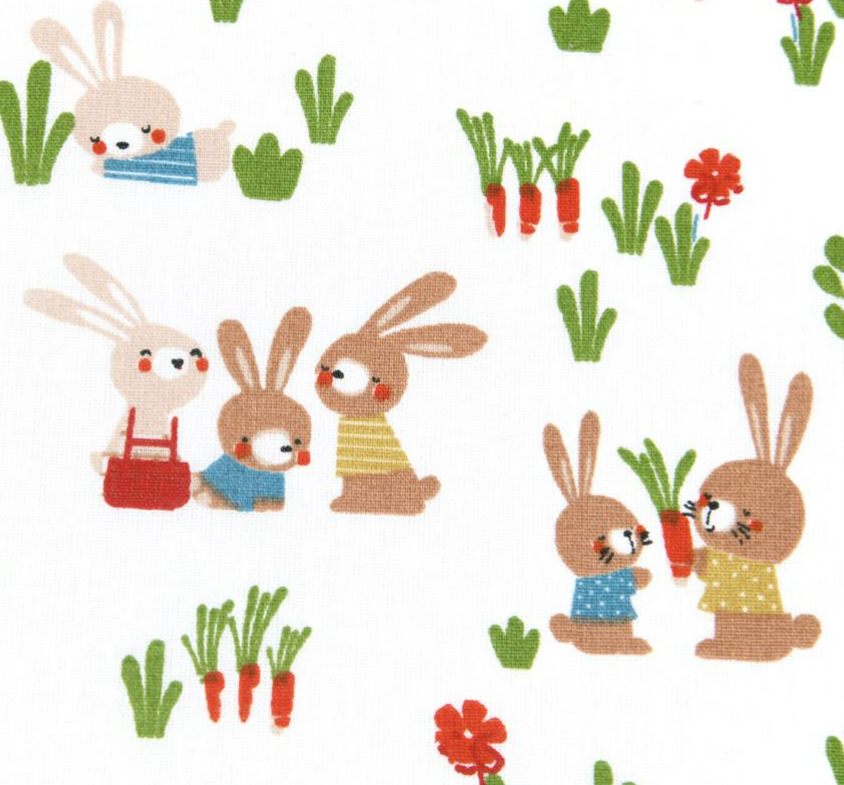 Liebevoll gestalteter Baumwollstoff mit niedlichen Hasen, Möhren, Blumen und kleinen Wiesenmotiven auf weißem Hintergrund in harmonischen Grün-, Rot-, Braun- und Beigetönen