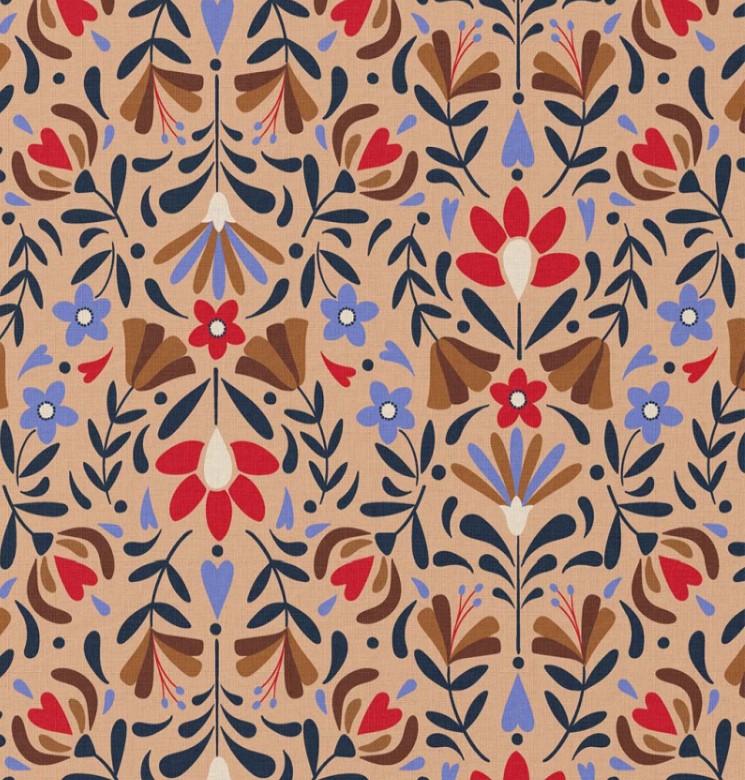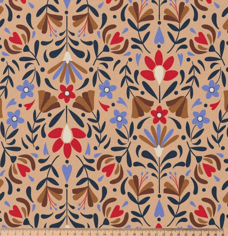 Mit dem Baumwollstoff Lafleur Scandi Blumen beige holst du dir ein exklusives Design aus Frankreich in dein Nähzimmer. Das verspielte Blumenmuster in warmen Tönen aus Rot, Braun, Blau und Creme auf beigem Grund verleiht deinen Projekten eine moderne, nordisch inspirierte Leichtigkeit – ideal für Kleidung, Accessoires und Wohntextilien.