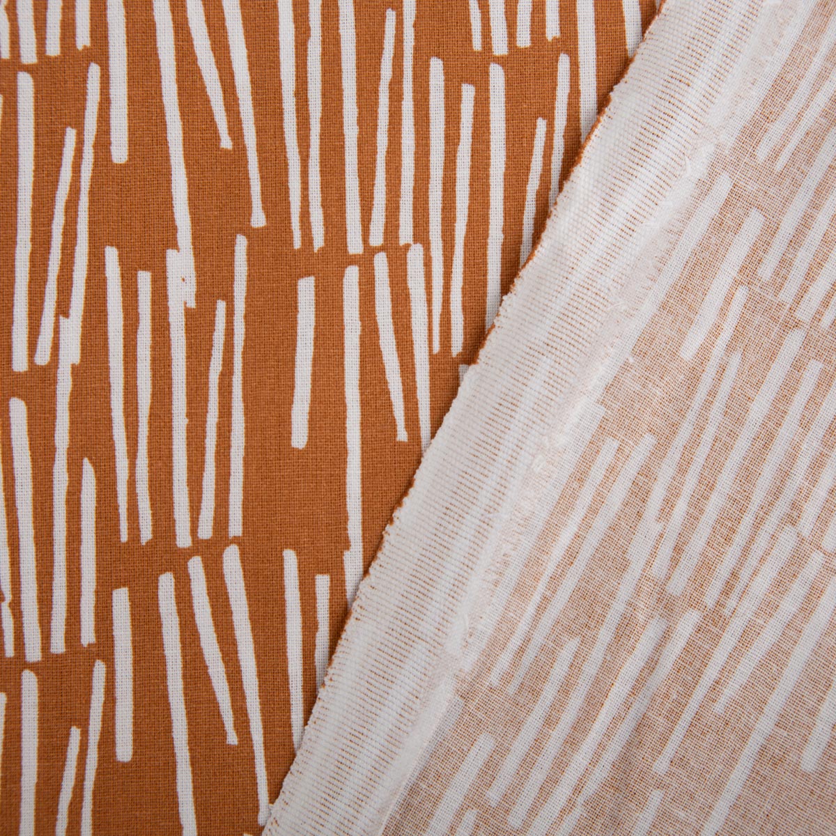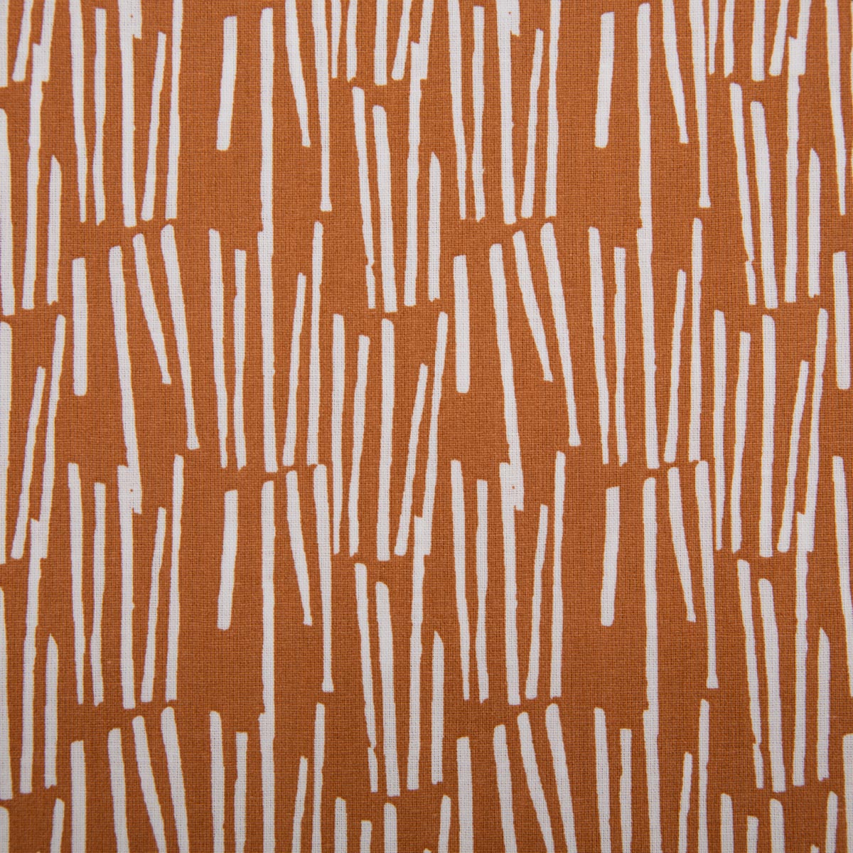 Der Baumwollstoff Lekker beeindruckt mit einem modernen, grafischen Dessin: unregelmäßige weiße Striche auf warmem Karamell erzeugen ein dynamisches Muster, das besonders gut für Mode, Accessoires und kreative Wohnideen geeignet ist.