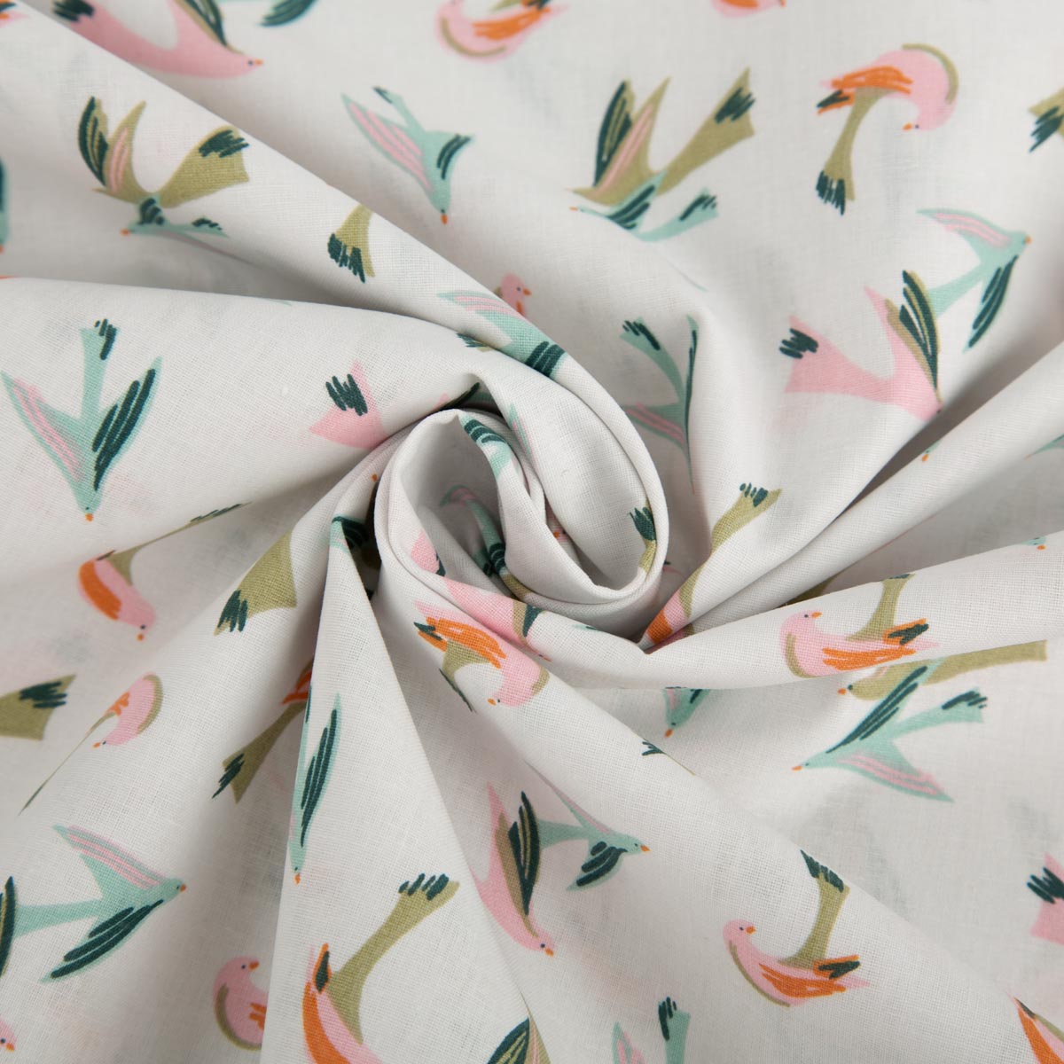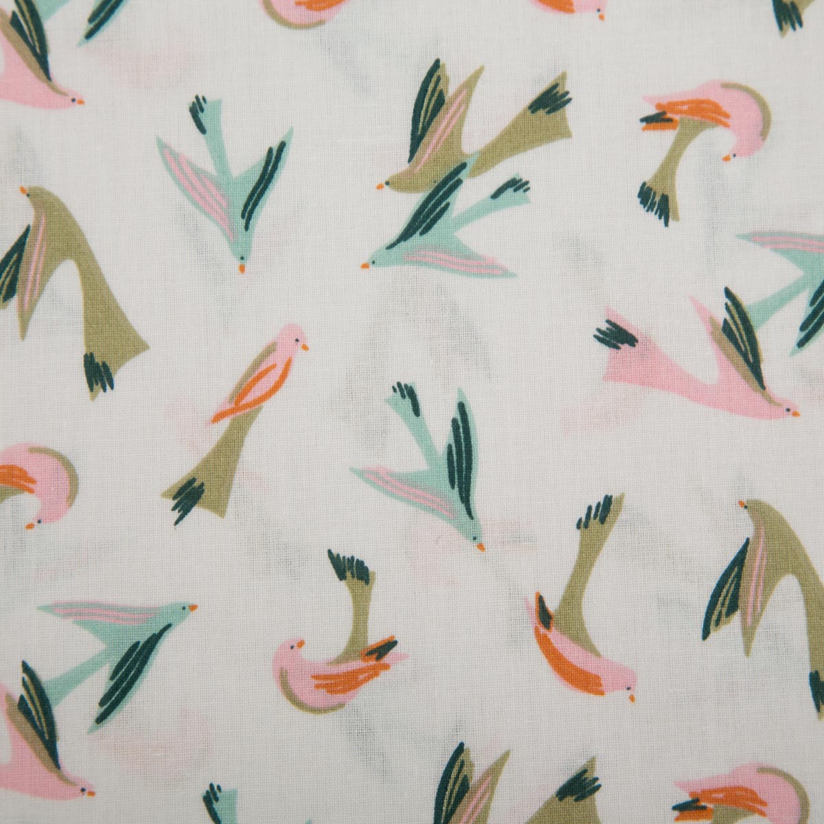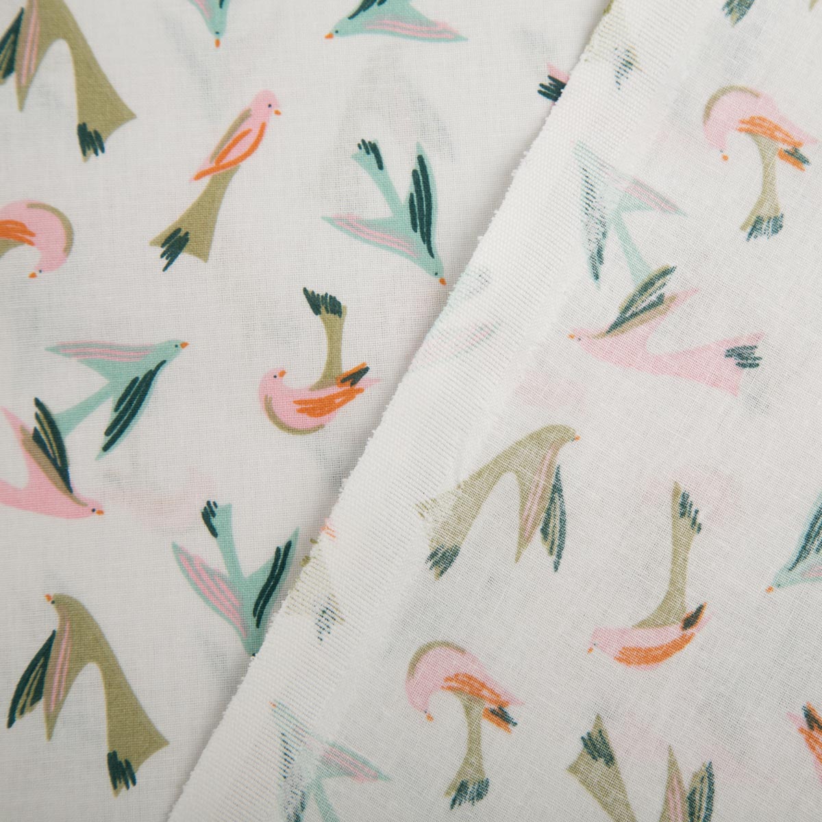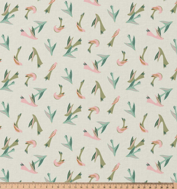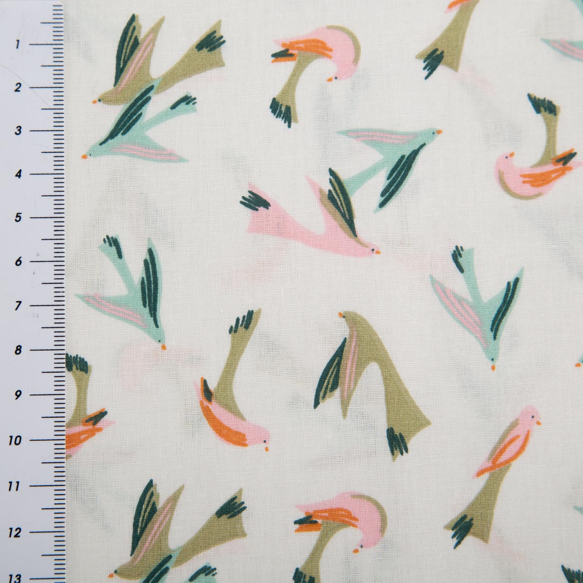 Baumwollstoff Voltige – Vogelmotiv in ecru, rosa, blau und grün