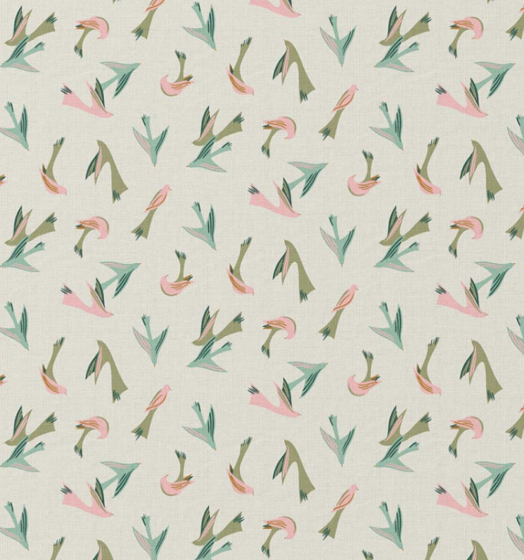 Zartes Vogelmotiv in rosa, blau und grün auf ecrufarbenem Hintergrund