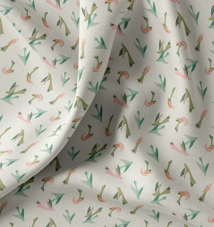 Dieser hochwertige Baumwollstoff begeistert mit einem exklusiven französischen Dessin. Die zarten, grafisch anmutenden Vögel in rosa, blau und grün verteilen sich harmonisch auf einem ecrufarbenen Hintergrund – perfekt für frische, moderne Nähprojekte.