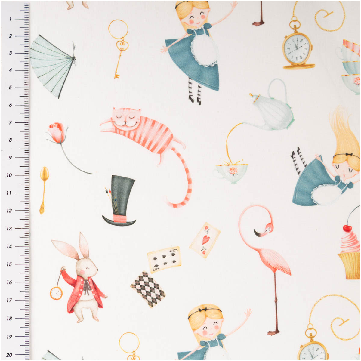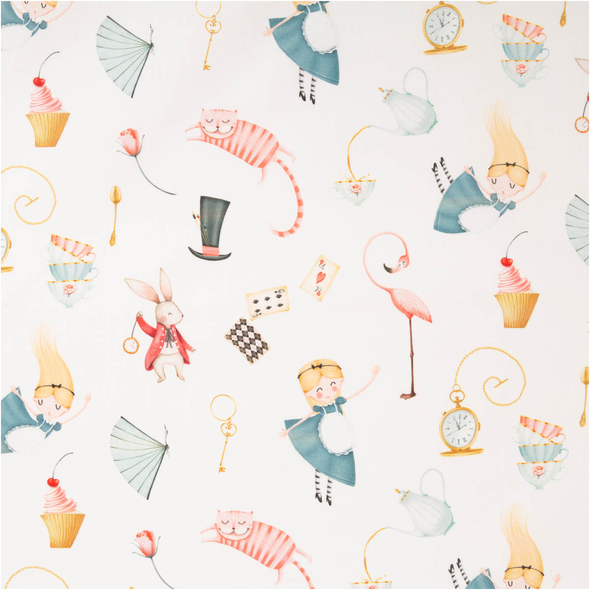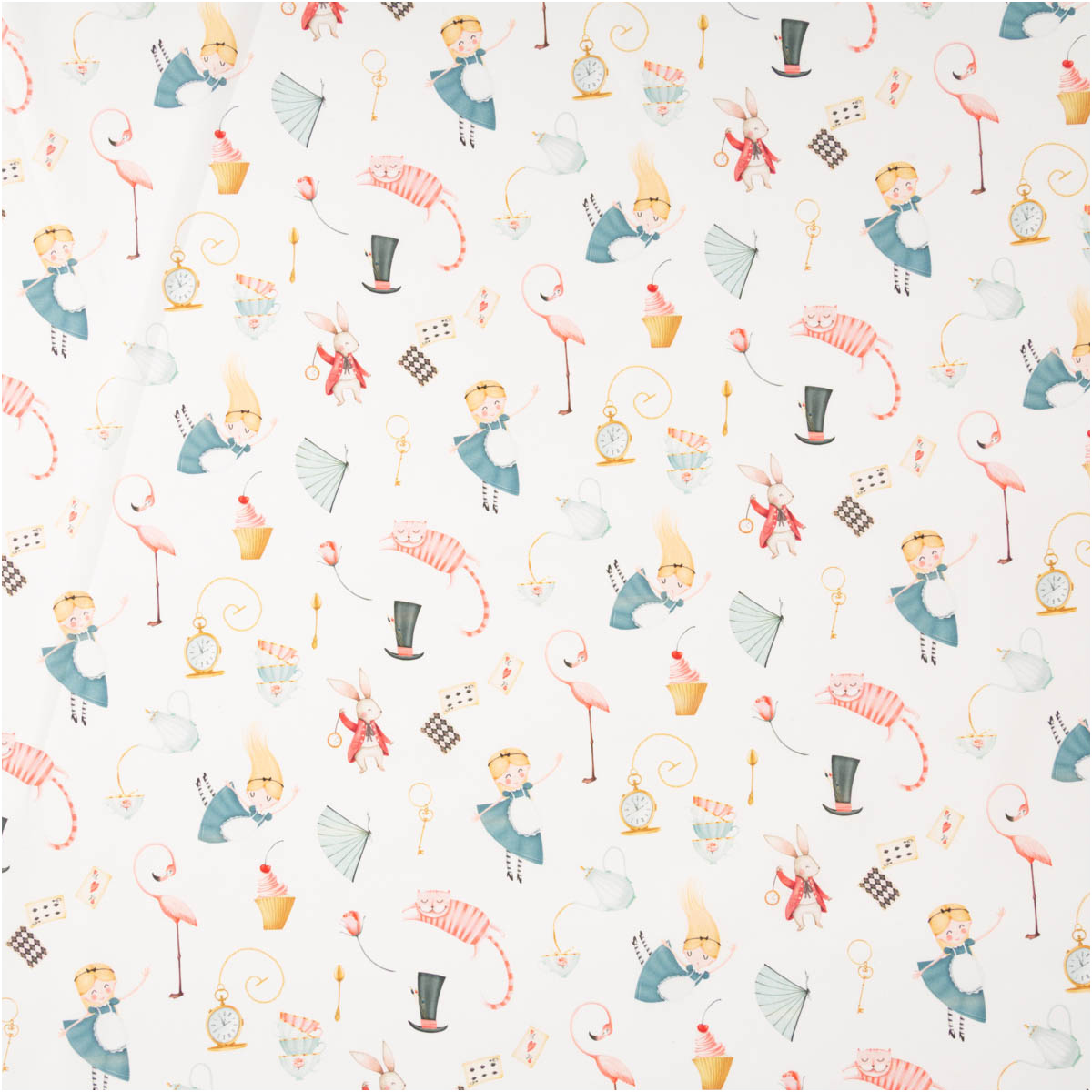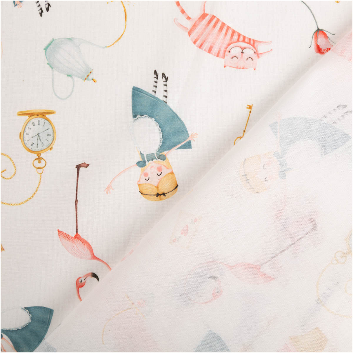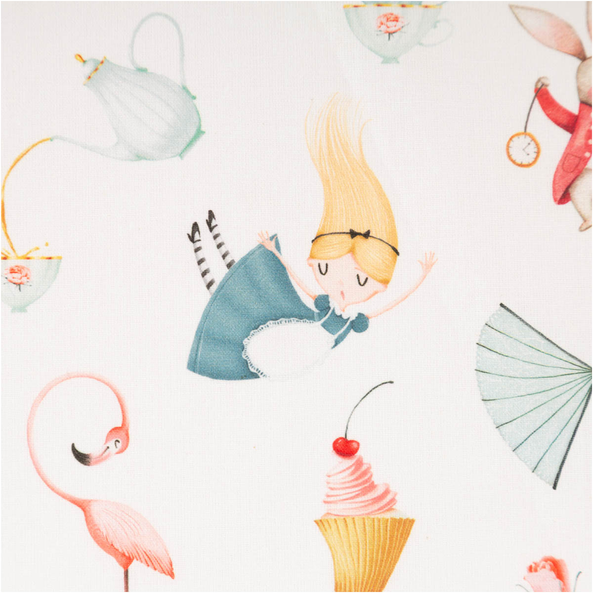 Der Baumwollstoff Wonderland begeistert mit einem liebevoll illustrierten französischen Dessin voller fantasievoller Motive wie Hase, Katze, Flamingo, Hut und verspielter Details. Auf weißem Grund wirken die bunten Illustrationen leicht, freundlich und besonders harmonisch. Die feinfädige, leichte Baumwoll-Webware fühlt sich angenehm weich an, ist atmungsaktiv und lässt sich sehr gut verarbeiten.