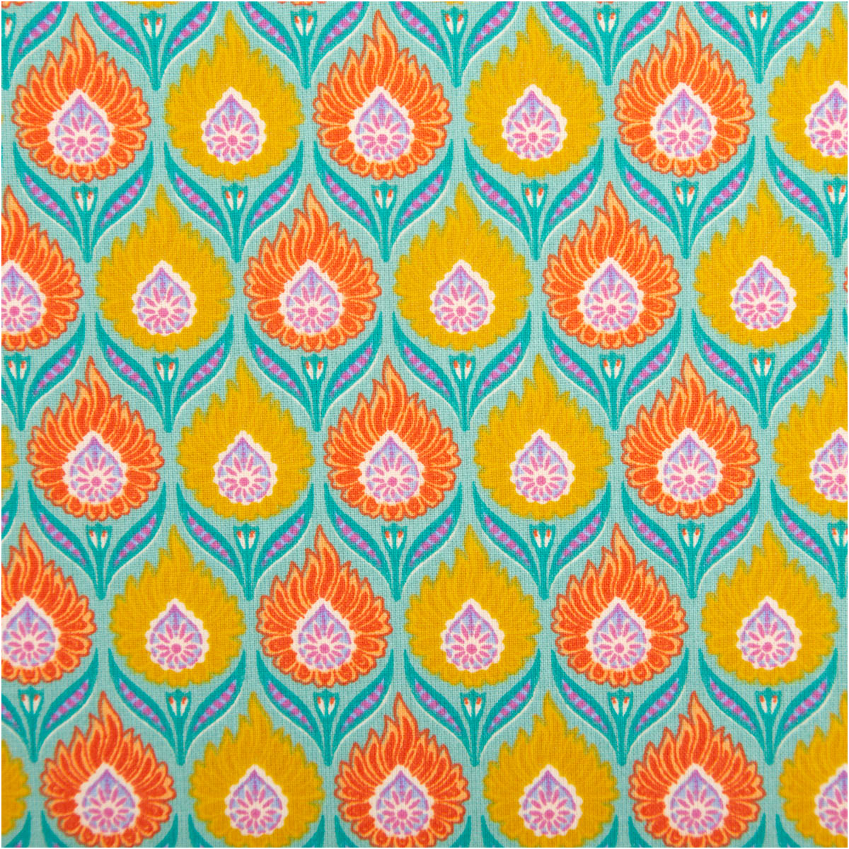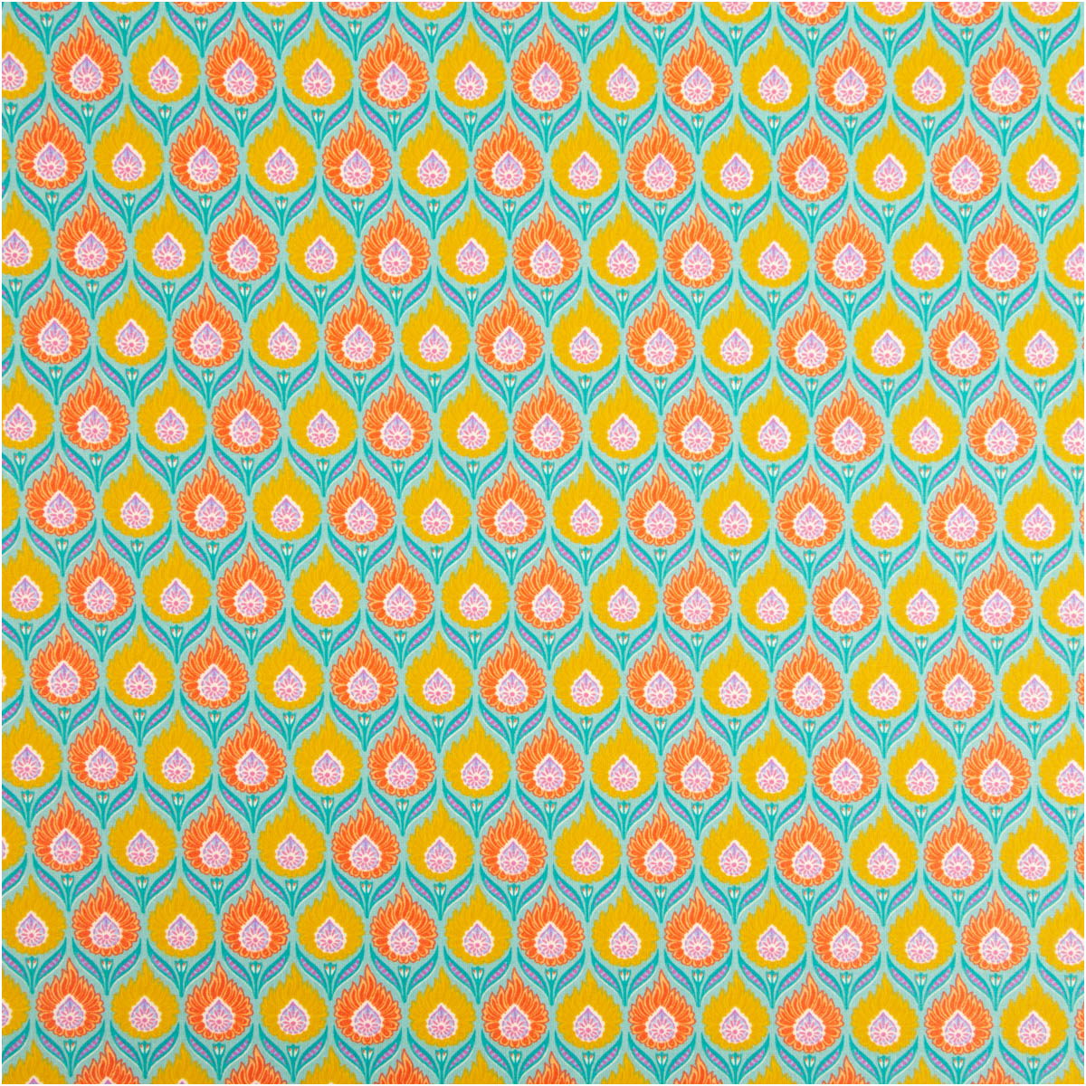 AUSDRUCKSSTARKES DESIGN: Retro Blumenmuster in Orange und Gelb auf intensiv türkisfarbigem Hintergrund für auffällige Nähprojekte