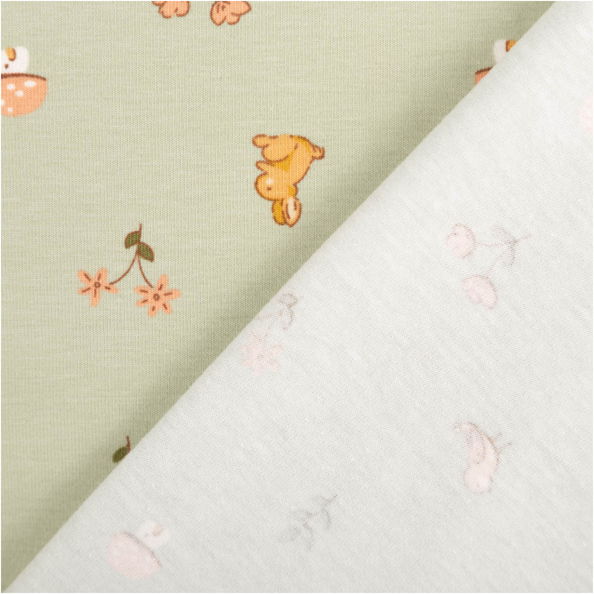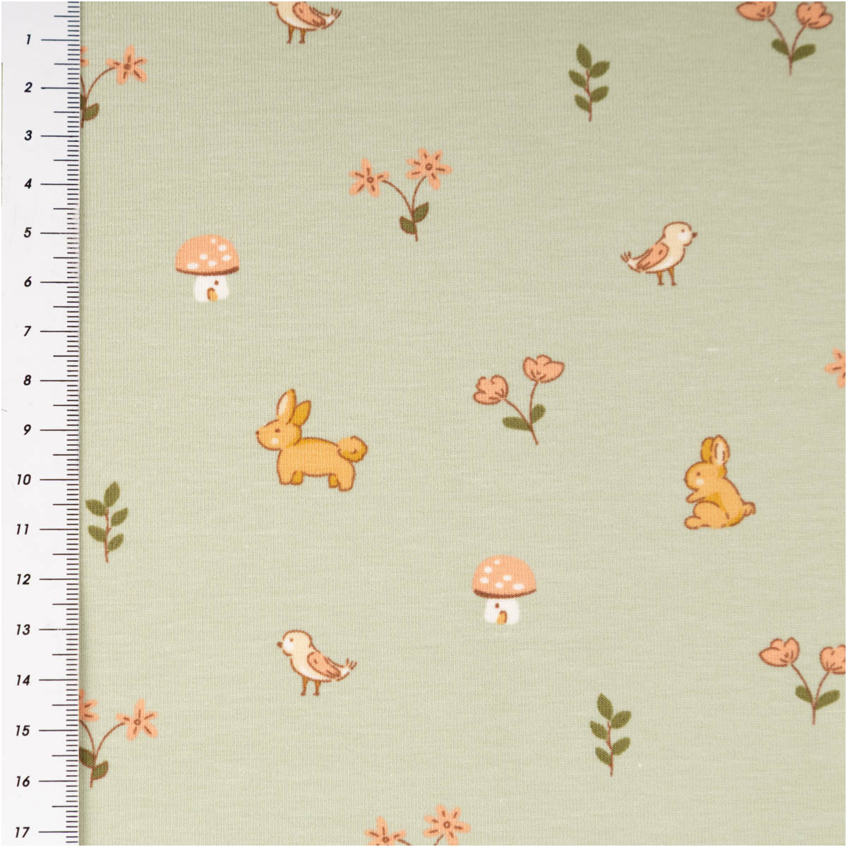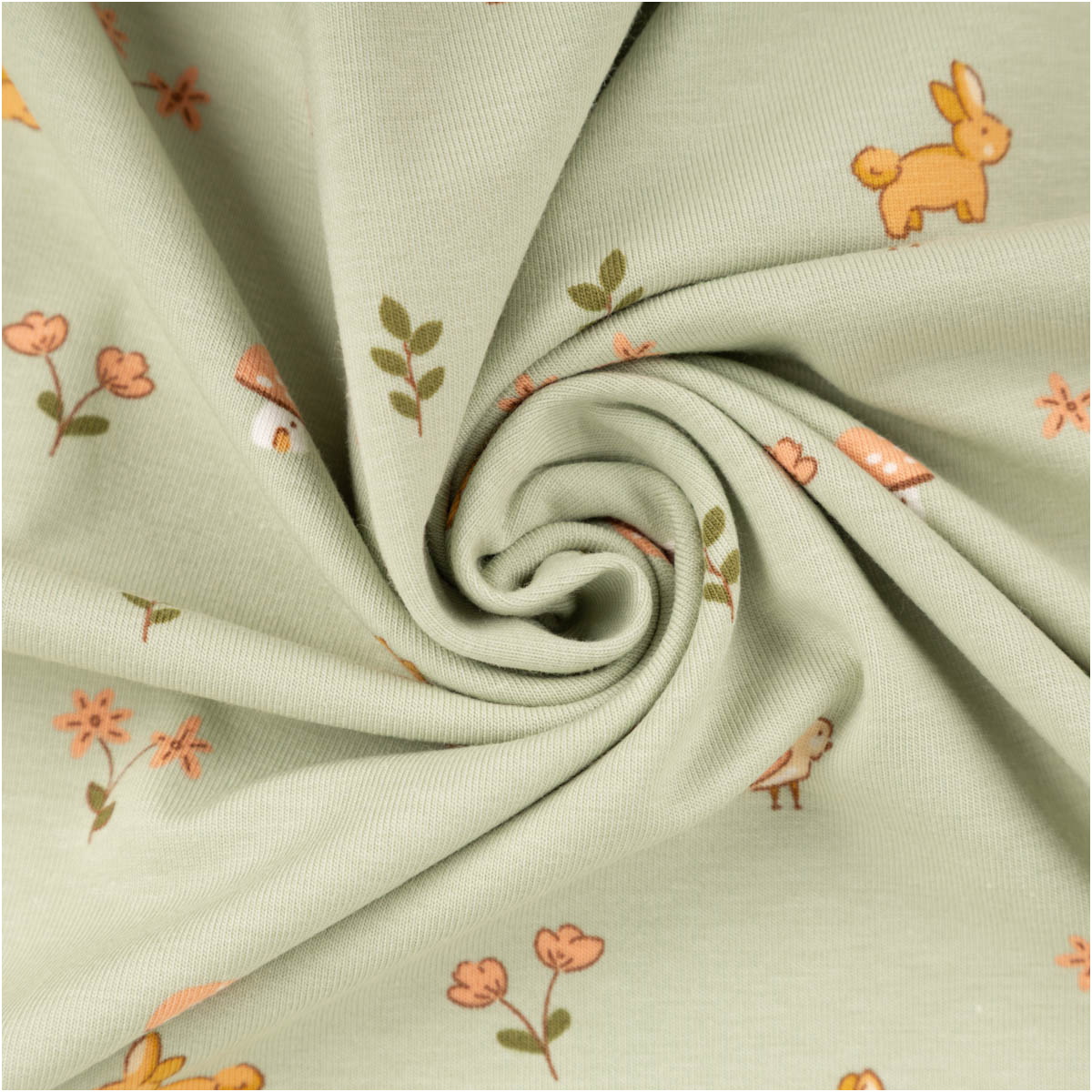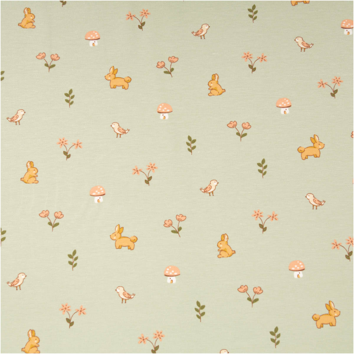 Niedliches Waldmotiv: Kaninchen, kleine Vögel, Blümchen und Pilze auf grünem Grund – ideal für Baby- und Kinderkleidung