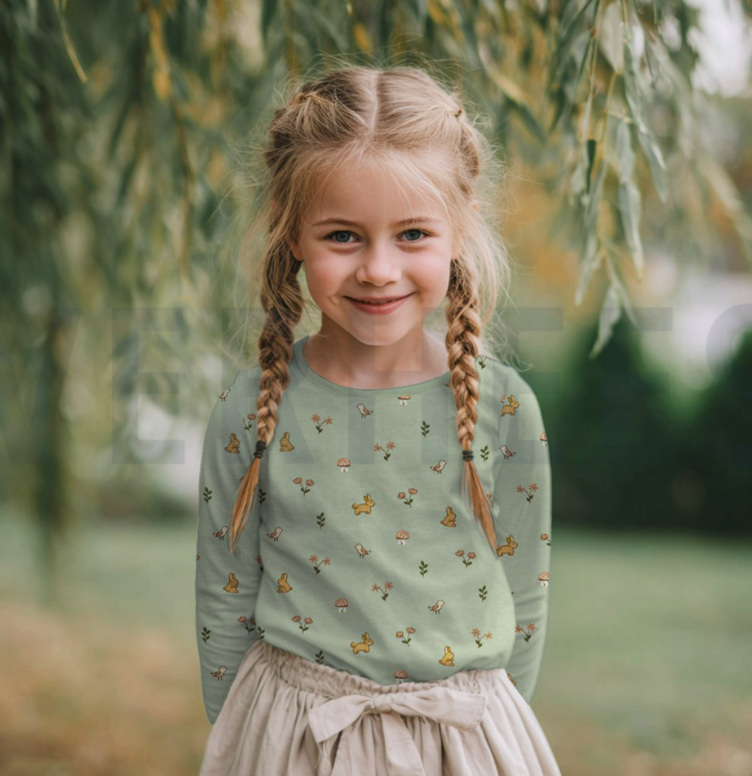 Dieser Bio Jersey Stoff bringt richtig viel Charme auf den Nähtisch: Auf dem grünen Untergrund tummeln sich Kaninchen, kleine Vögel, Blümchen und Pilze – perfekt für liebevolle Baby- und Kinderkleidung, aber genauso schön für bequeme Familienmode. Die Qualität aus 95 % Bio-Baumwolle mit 5 % Elasthan ist angenehm weich, elastisch und alltagstauglich.