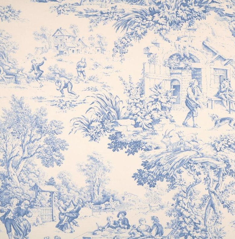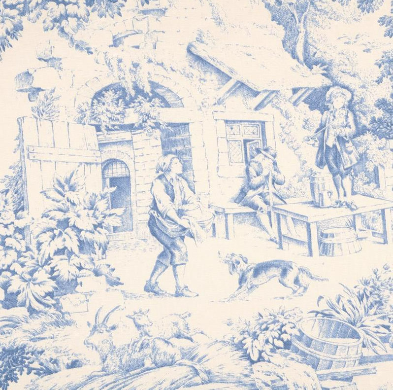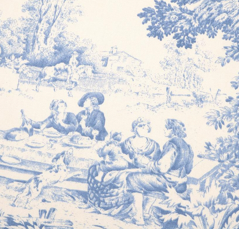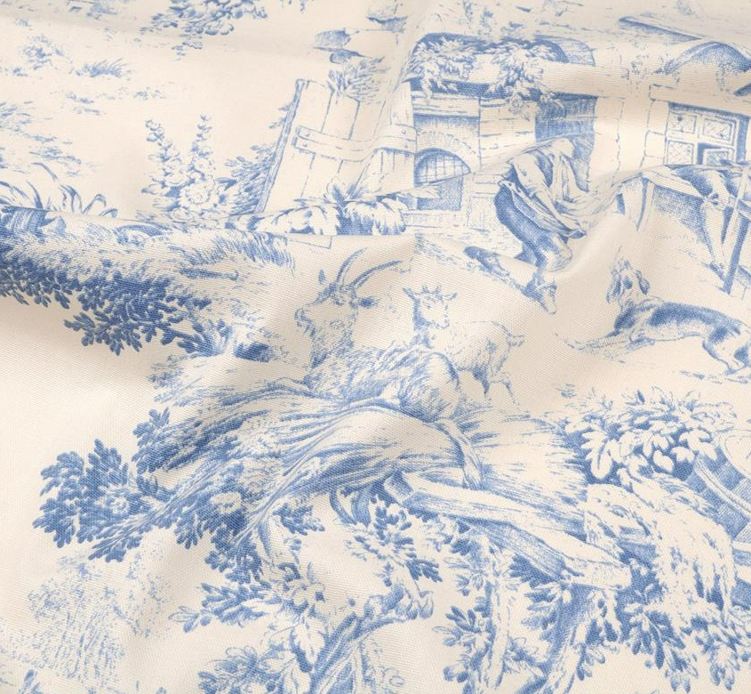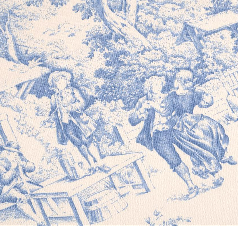 Der Stil Toile de Jouy ist für seine einfarbigen, fein gezeichneten Illustrationen auf hellem Untergrund bekannt. Typisch sind ländliche Szenen, Pflanzen, Tiere und romantisierte Alltagsszenen, die an historische Radierungen oder Kupferstiche erinnern. Genau diese besondere Wirkung zeigt auch dieses Dessin: Die blauen Motive auf ecrufarbenem Grund schaffen eine ruhige, edle und traditionsreiche Optik.
