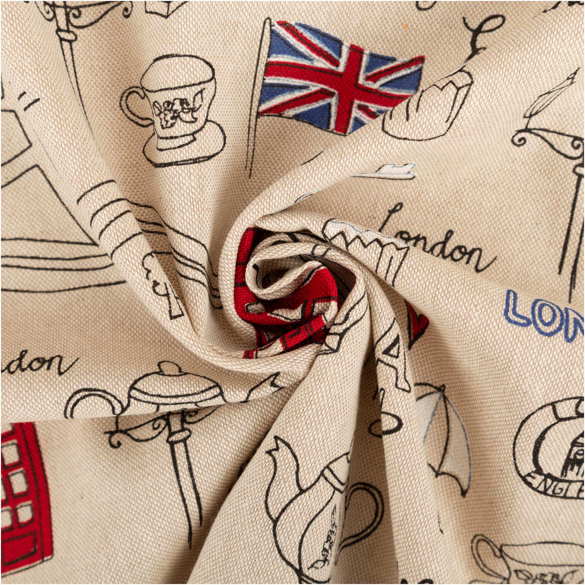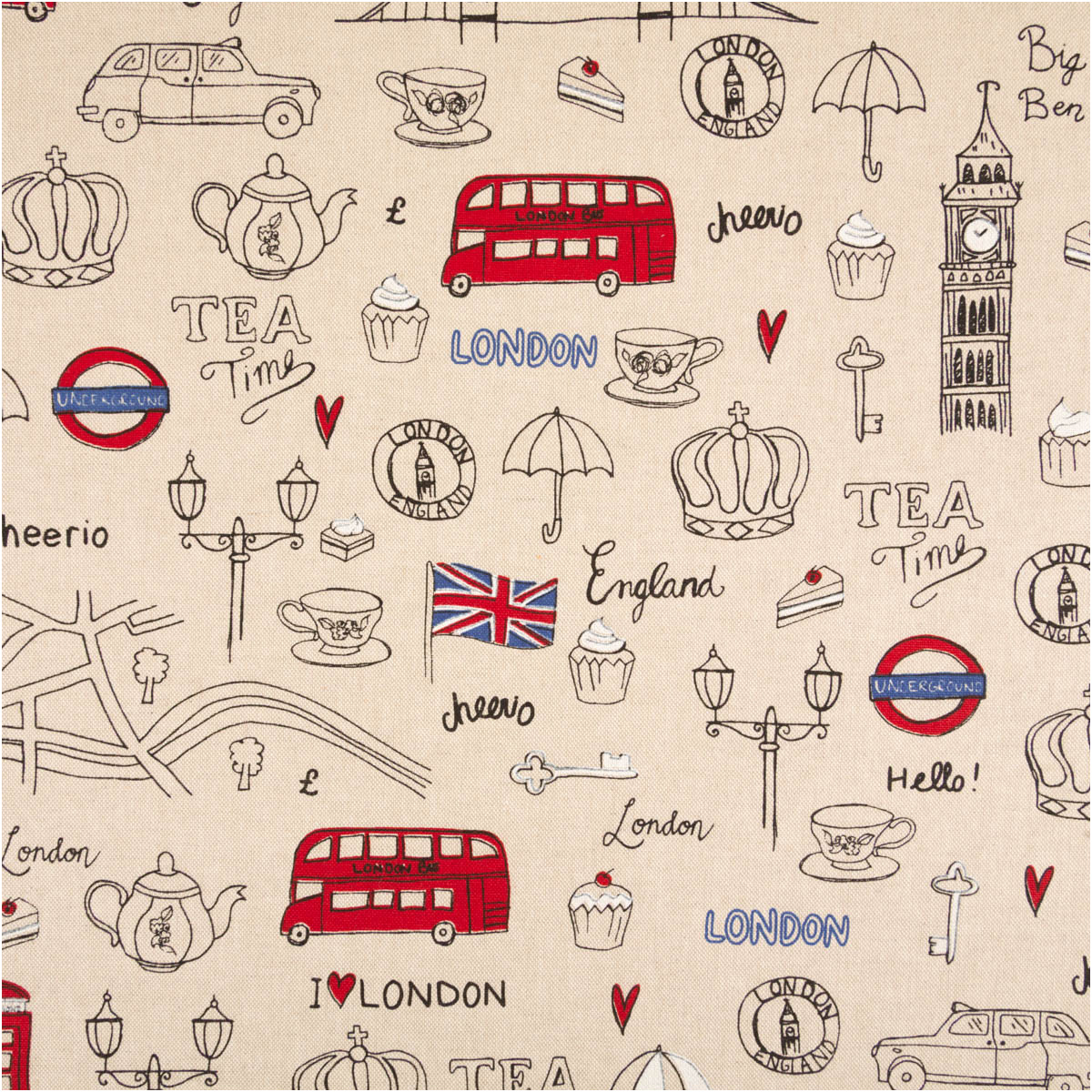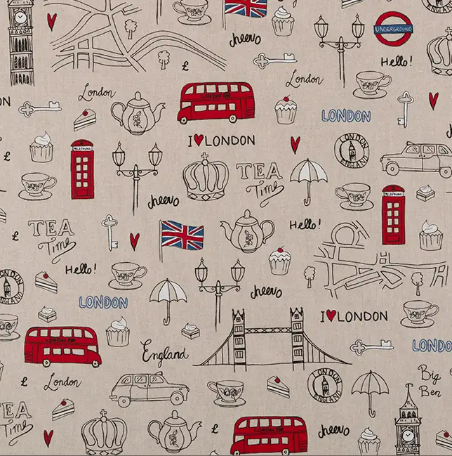 London-Motive im Leinenlook: Doppeldeckerbus, Telefonzelle, Teekanne, Union Jack und Wahrzeichen auf naturfarbenem Grund
