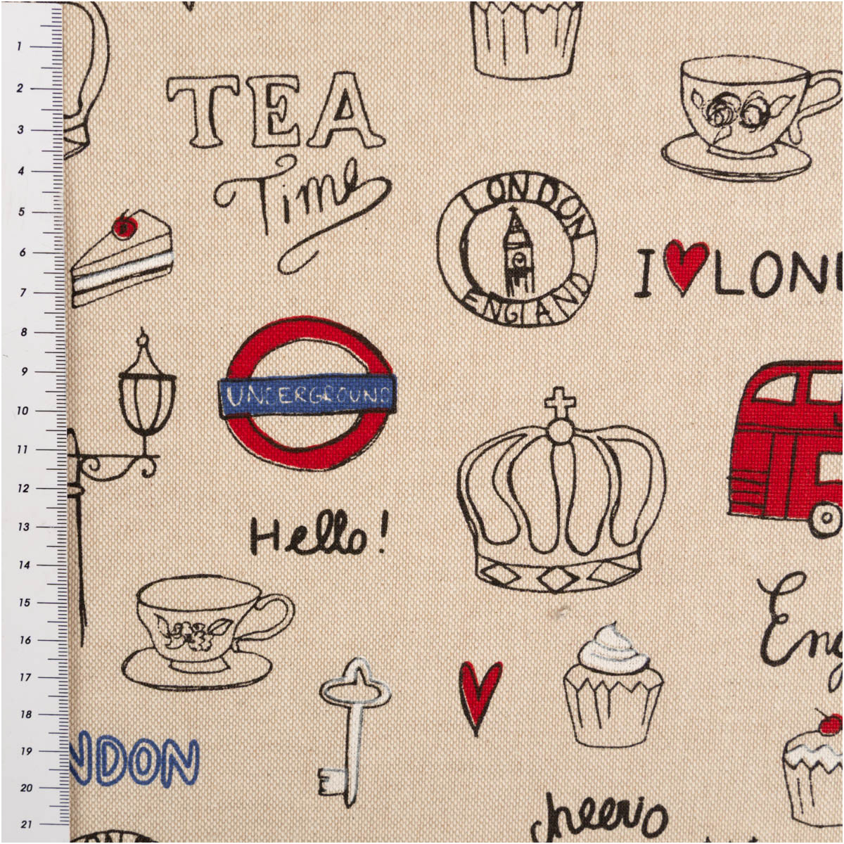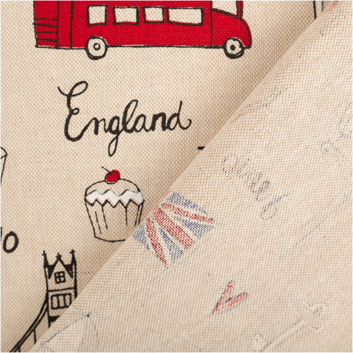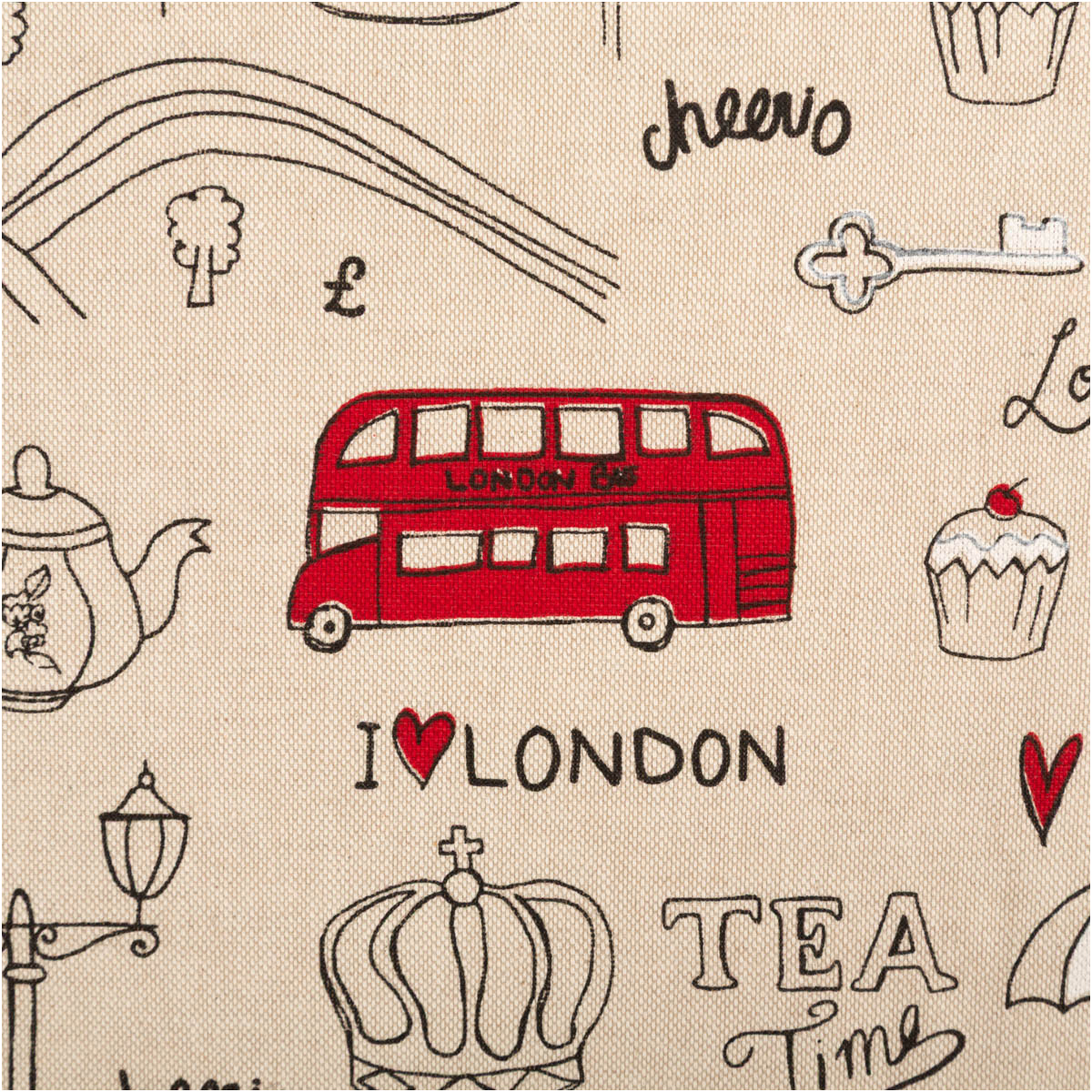 London-Motive im Leinenlook: Doppeldeckerbus, Telefonzelle, Teekanne, Union Jack und Wahrzeichen auf naturfarbenem Grund