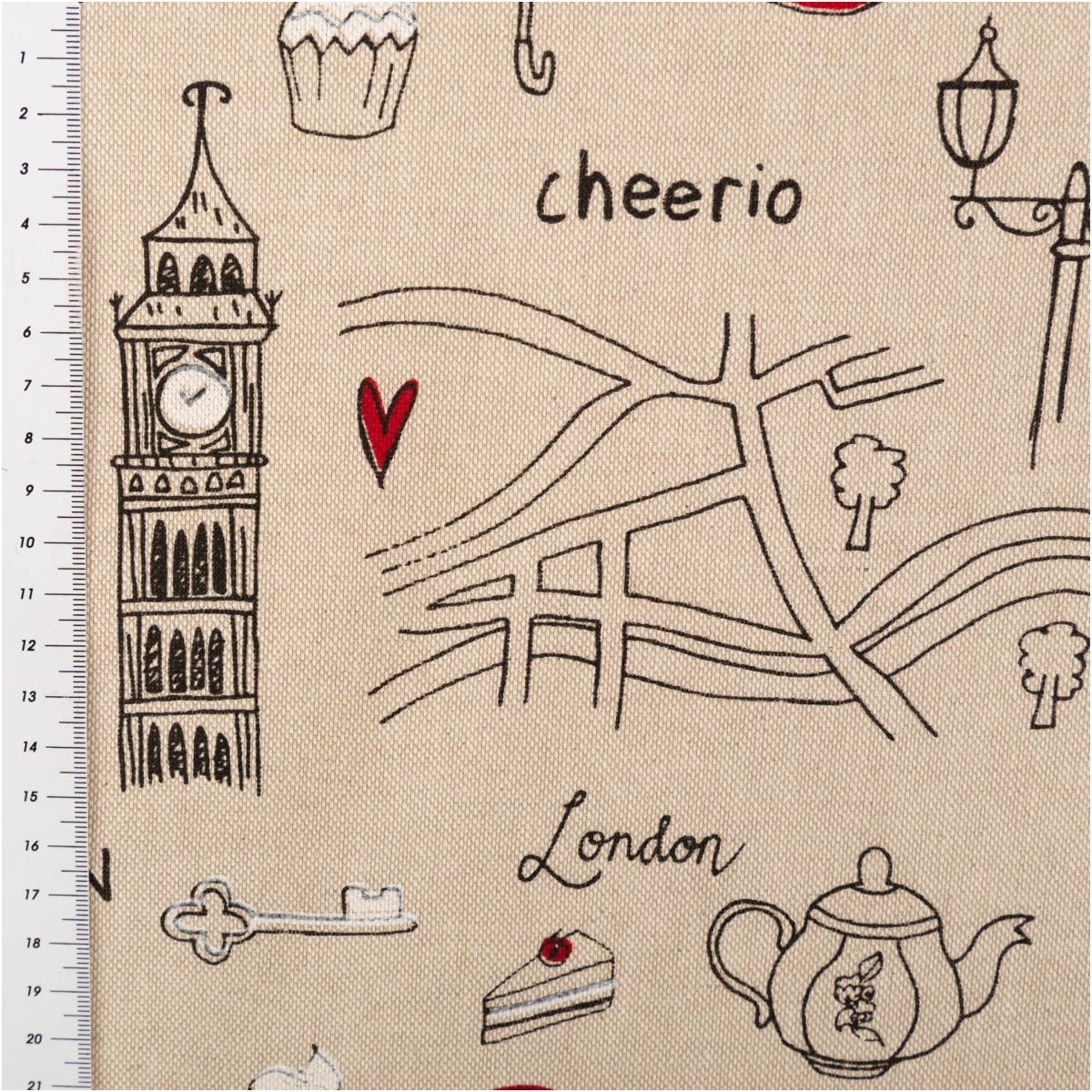 Dekostoff „London“ im Leinenlook – natur mit Schwarz & Rot, 140 cm breit