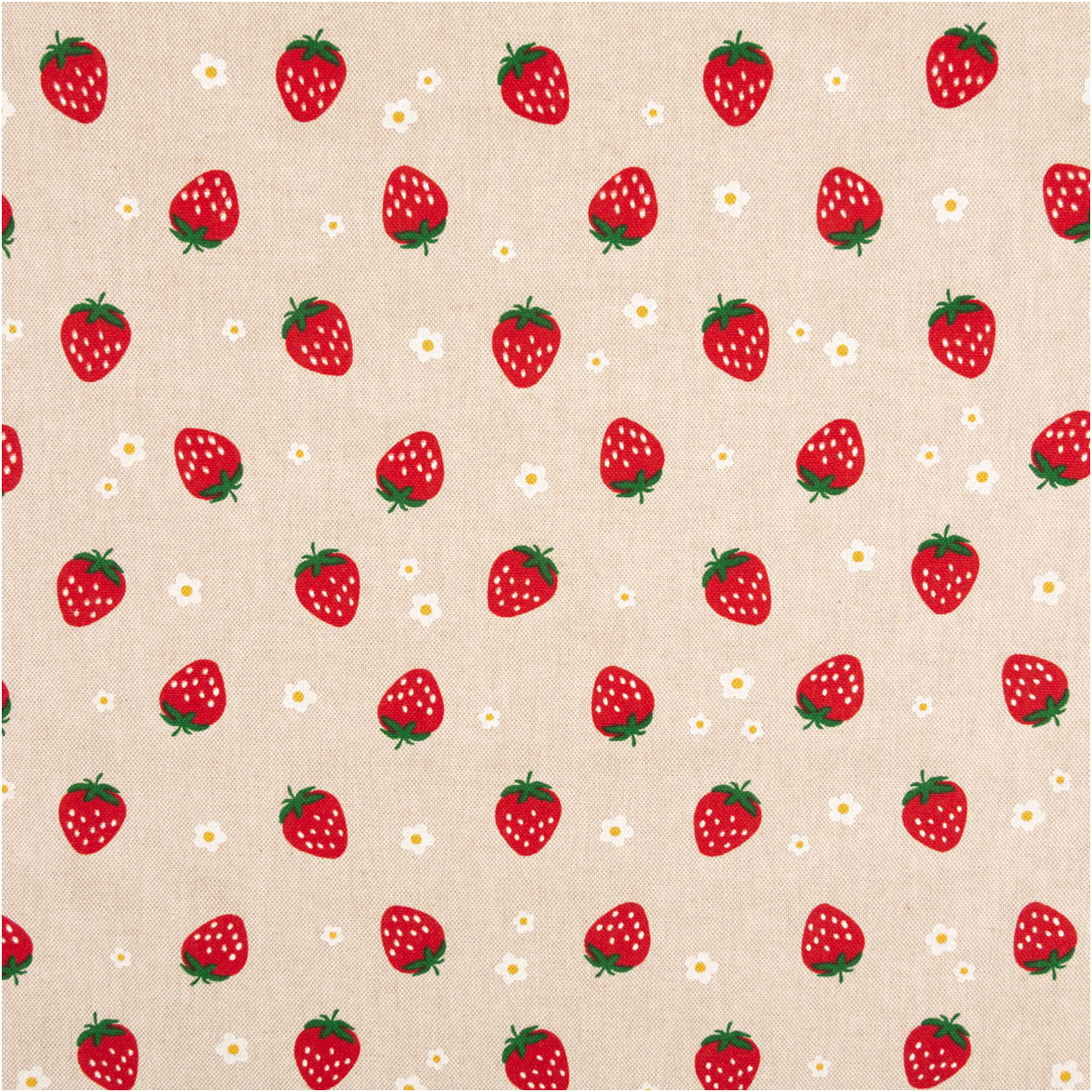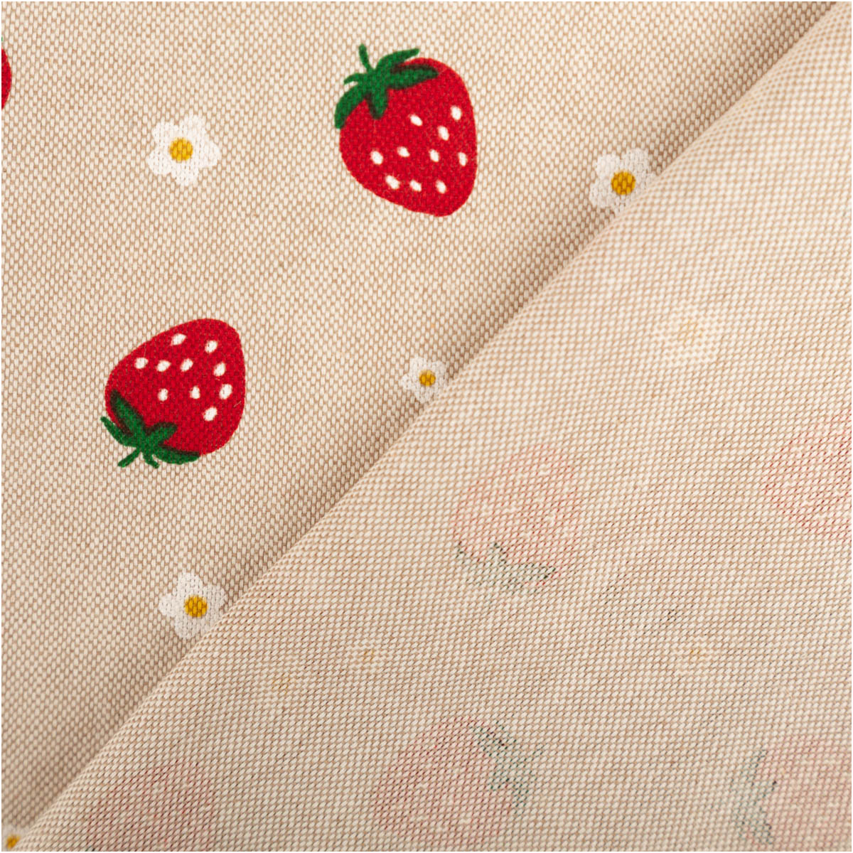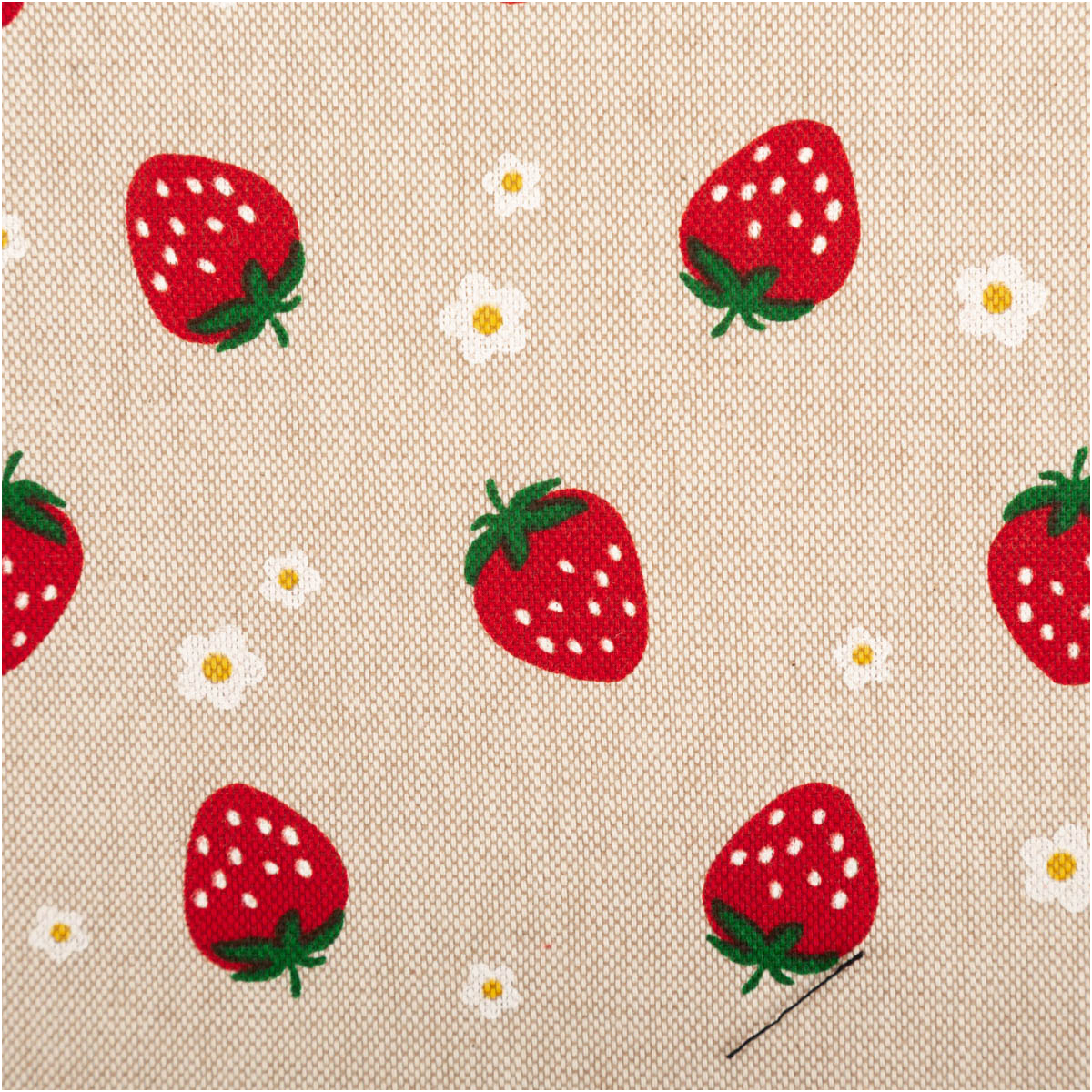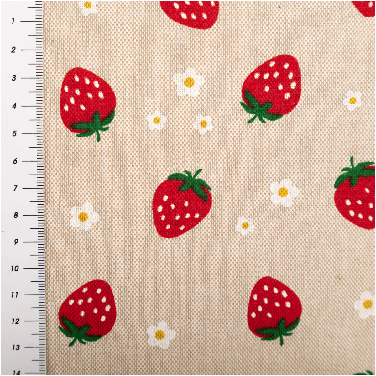 Dekostoff im Leinenlook mit fröhlichem Erdbeer- und Blütenmuster auf naturfarbenem Hintergrund