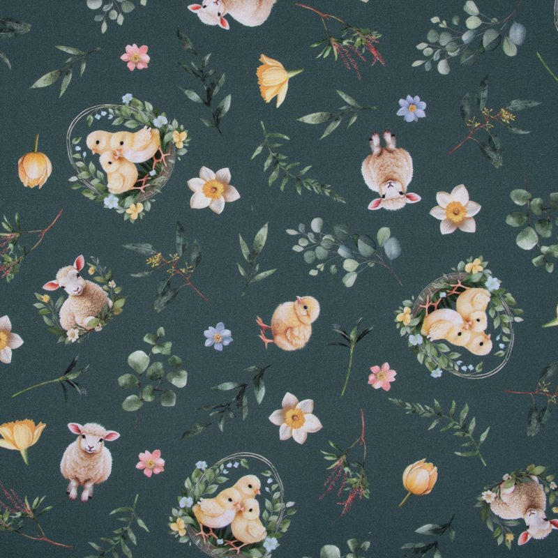 Dieser hochwertige Baumwoll-Dekostoff bringt eine ruhige, natürliche Osterstimmung in dein Zuhause. Das liebevoll illustrierte Bohemian-Easter-Design zeigt Lämmer, Küken, Blumen und feine Blätter auf einem tiefgrünen Hintergrund und wirkt dabei harmonisch, modern und zeitlos. Der hochwertige Digitaldruck sorgt für klare Details und eine besonders hochwertige Optik.