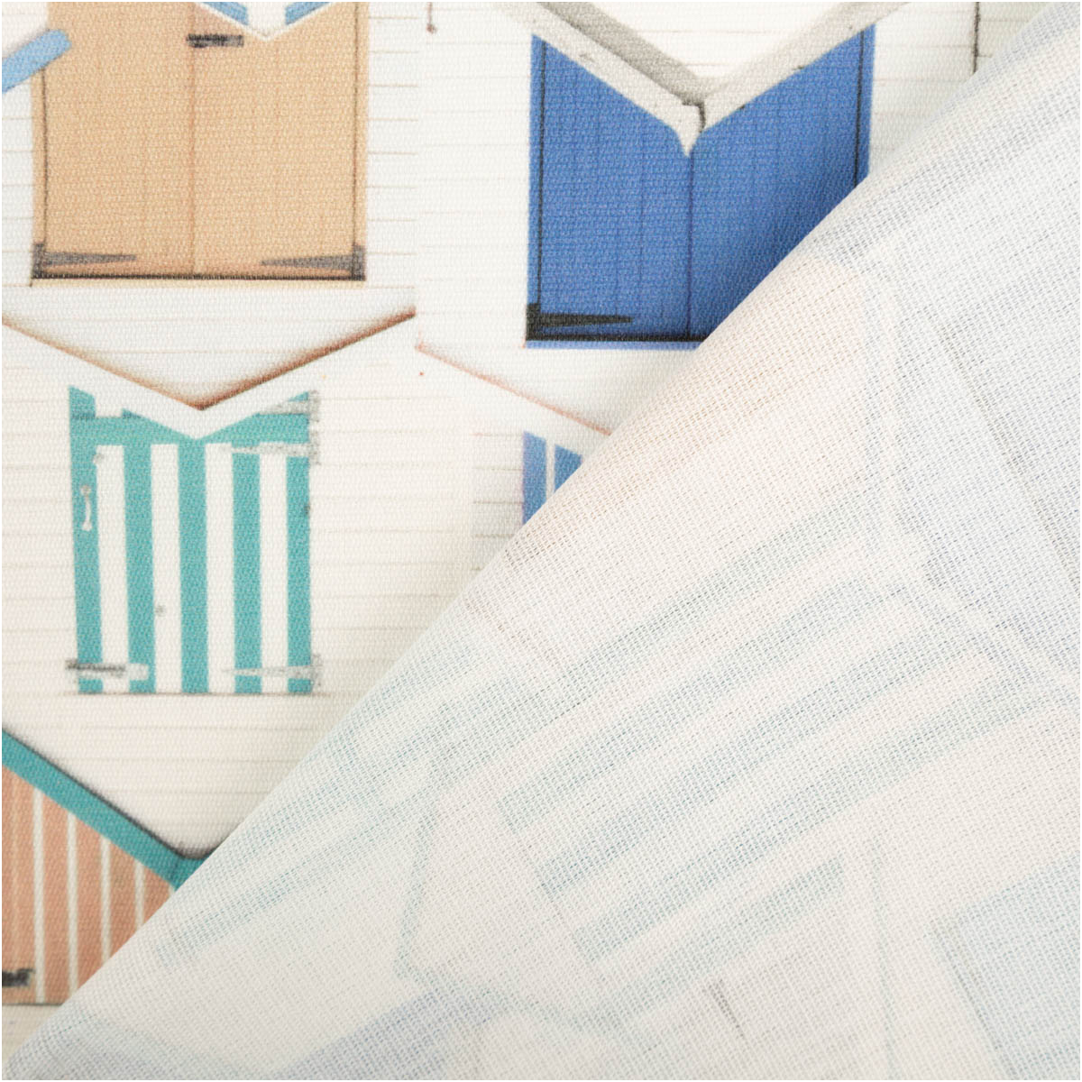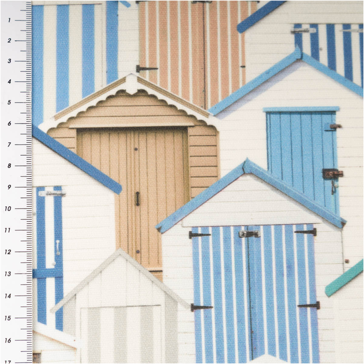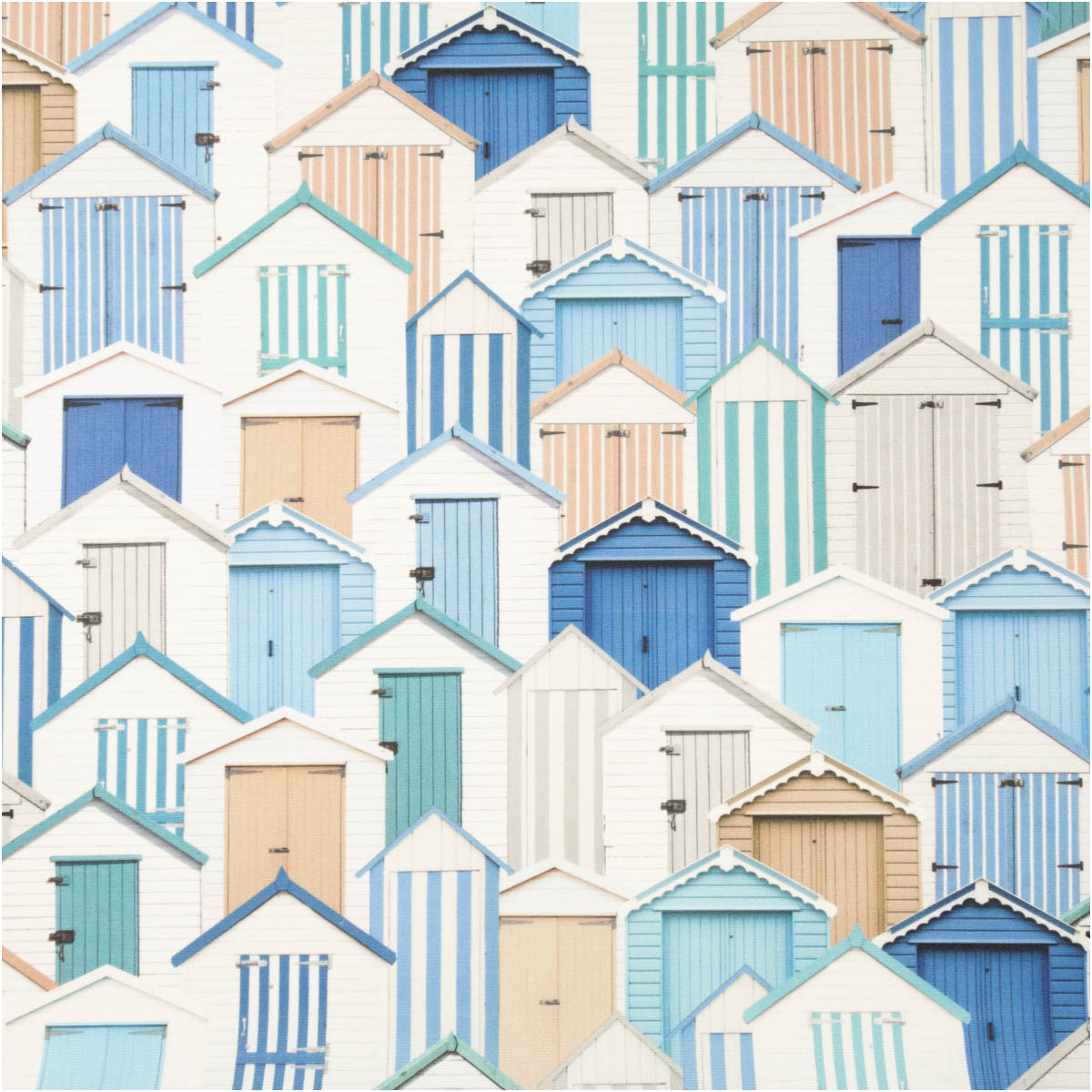 Das Besondere an diesem Stoff ist das ausdrucksstarke Muster. Die vielen Strandhäuser stehen dicht nebeneinander und erzeugen dadurch eine spannende, aber geordnete Gesamtoptik. Unterschiedliche Formen, Türen, Streifen und Farbvarianten bringen Bewegung ins Design. Gleichzeitig bleibt das Muster durch die abgestimmte Farbwelt in Blau, Weiß und Naturtönen sehr harmonisch.