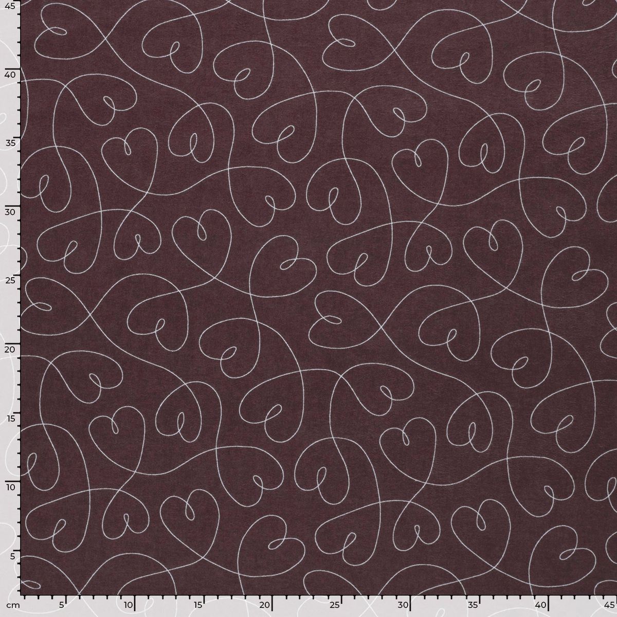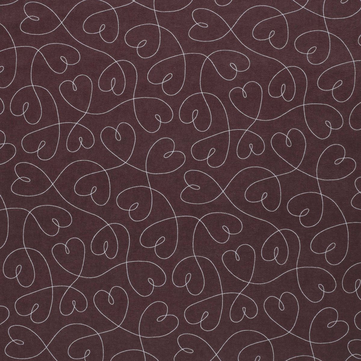 Maße & Daten: 100% Baumwolle, ca. 165 g/qm, Breite ca. 1,47 m, Design Herzen aubergine/weiß – Meterware am Stück