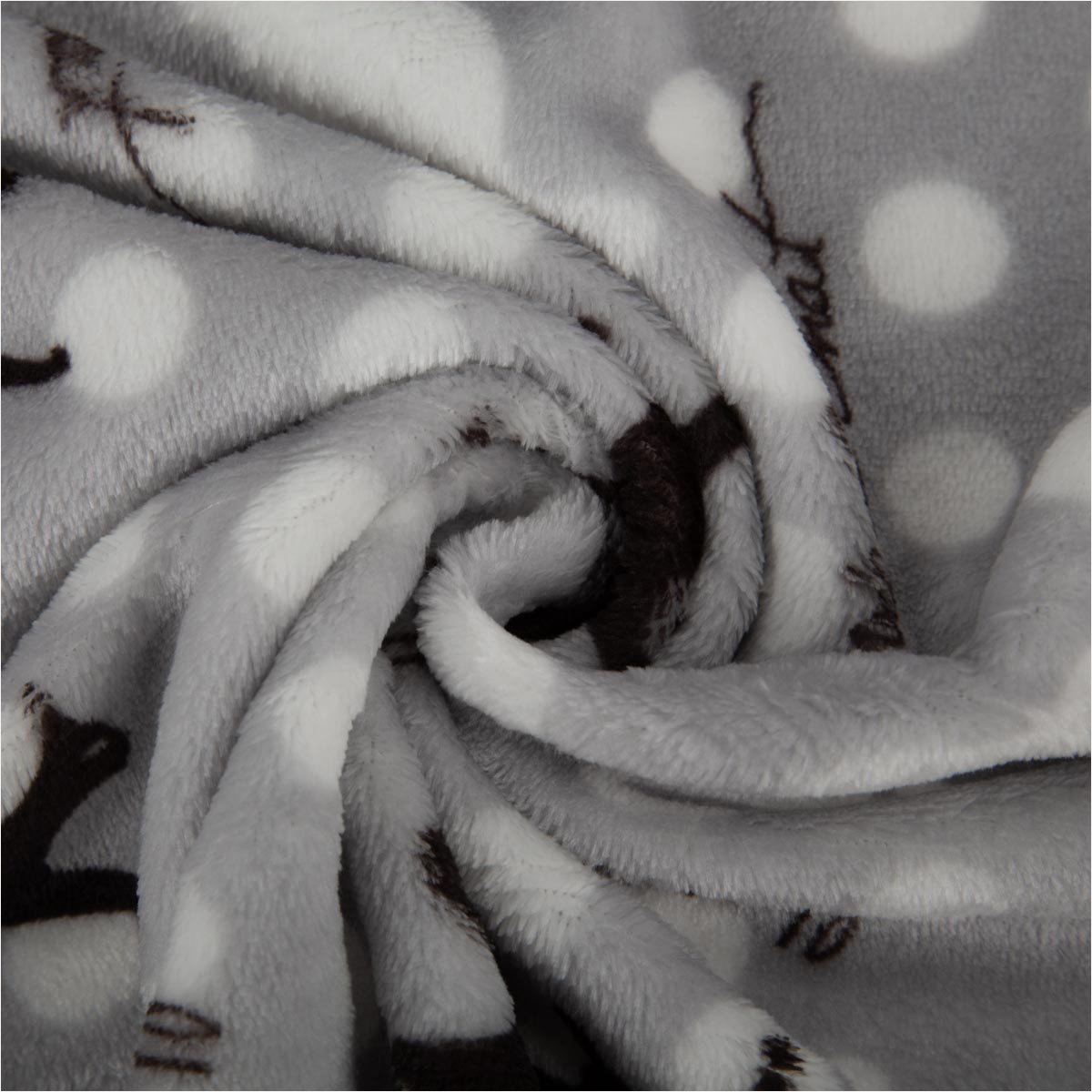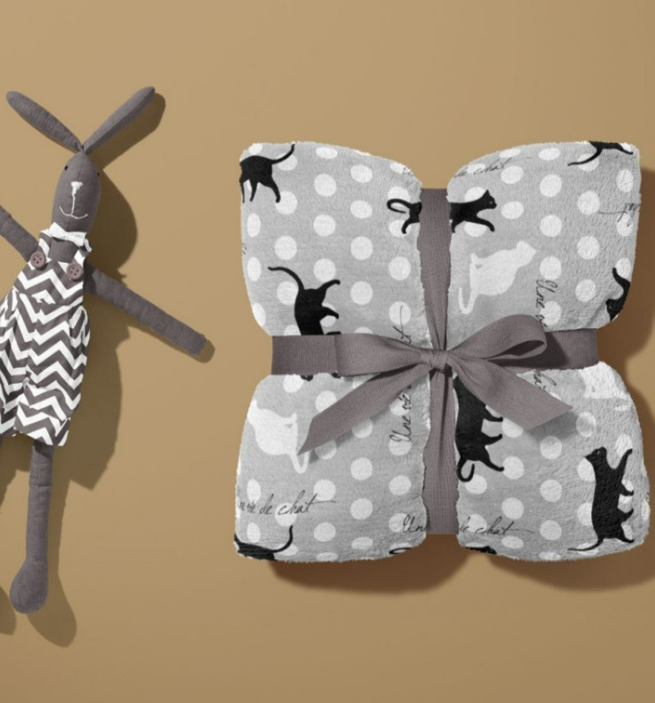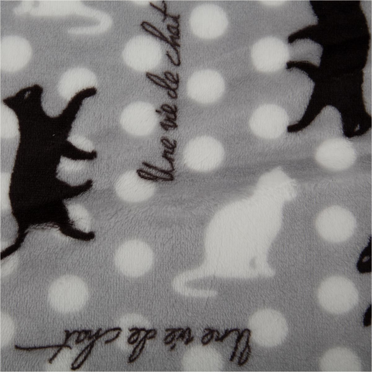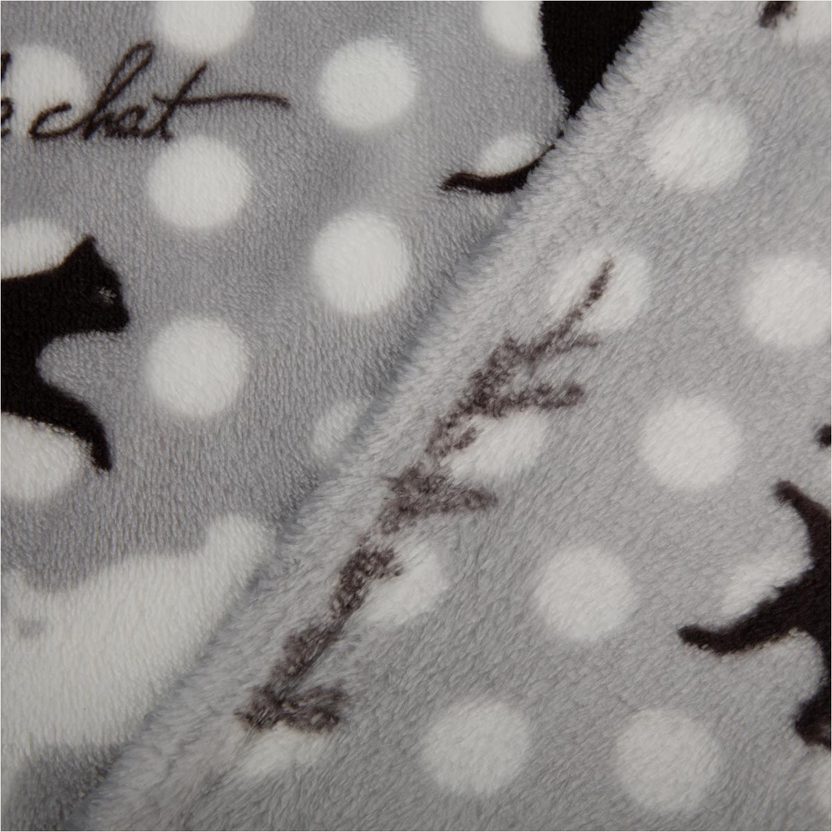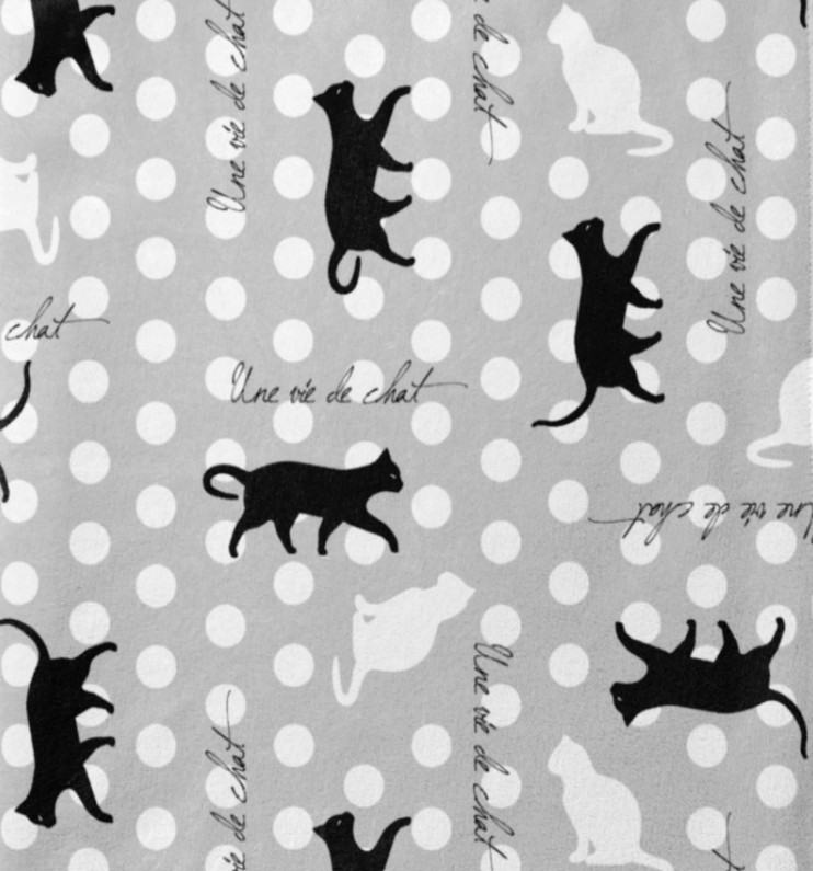 Material & Design: Grauer Fleecestoff mit verspieltem Katzen-Allover und Punktmuster, französische Schriftzüge als Akzent.