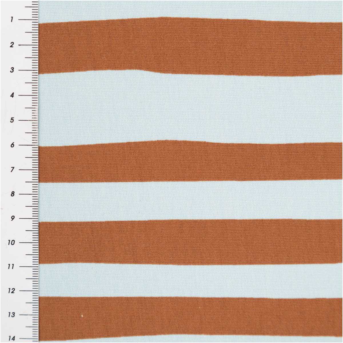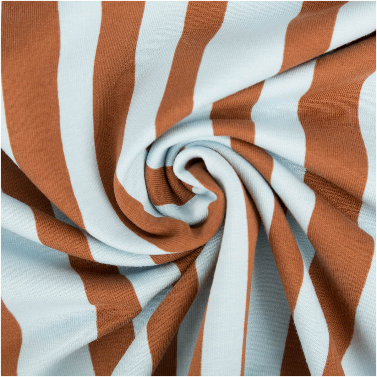 Das markante Streifenmuster in Blau und Braun wirkt modern, verspielt und ausdrucksstark. Es lässt sich schön mit schlichten Uni-Stoffen kombinieren und eignet sich sowohl für auffällige Einzelstücke als auch für bequeme Basics mit besonderem Look.