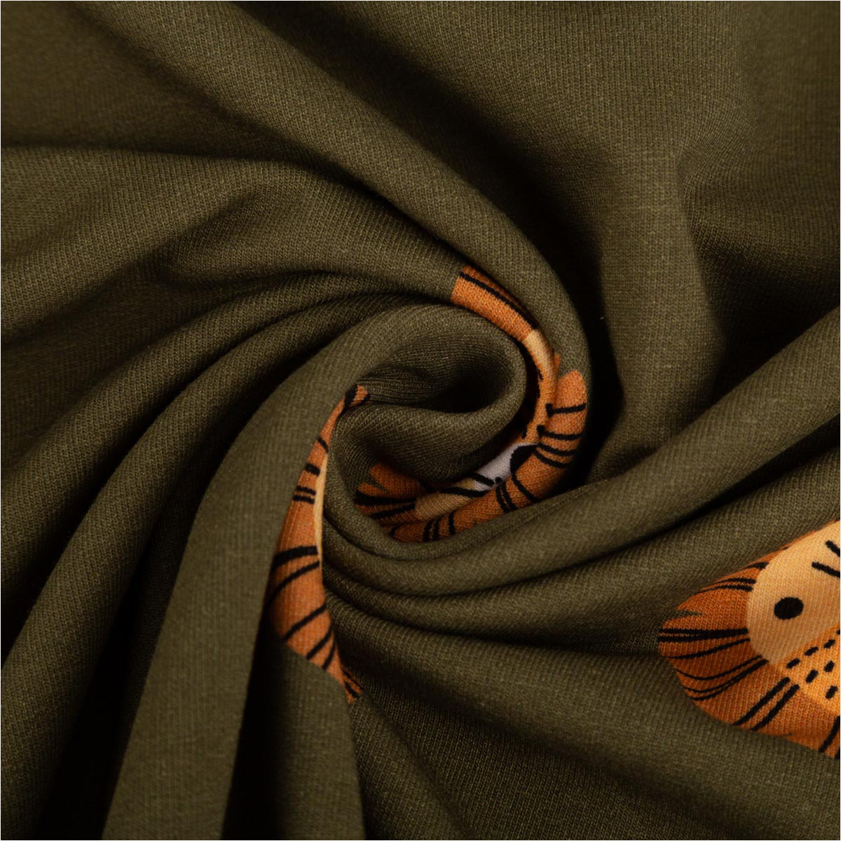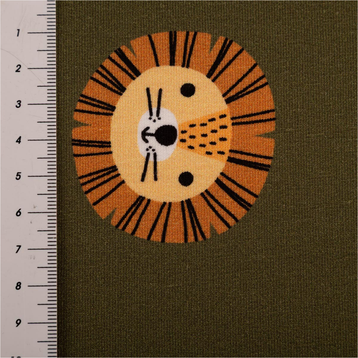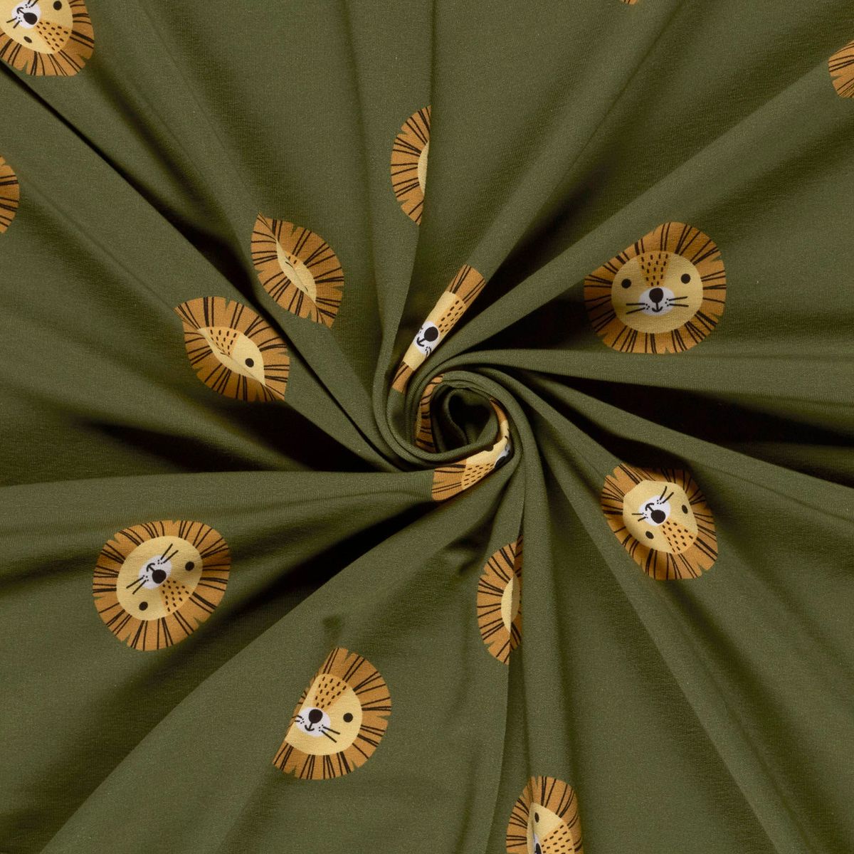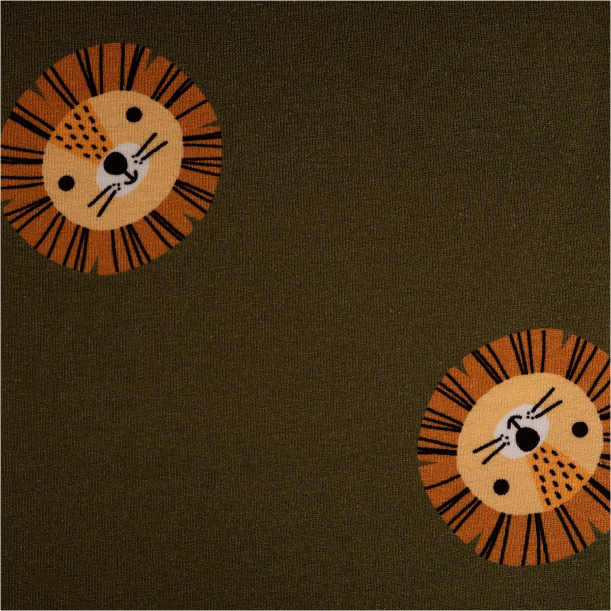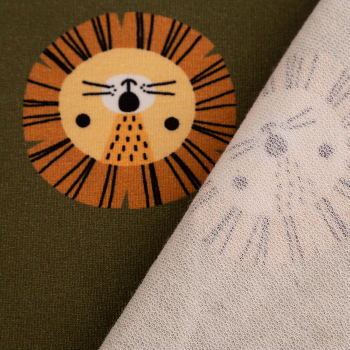 Entdecke den French Terry Stoff Löwe grün – ein vielseitiger Sommersweat mit Schlingenstruktur, der durch seinen hochwertigen Digitaldruck mit süßem Löwenmotiv begeistert. Der Stoff ist aus 92 % Baumwolle und 8 % Elasthan gefertigt, wodurch er angenehm weich, elastisch und atmungsaktiv ist.