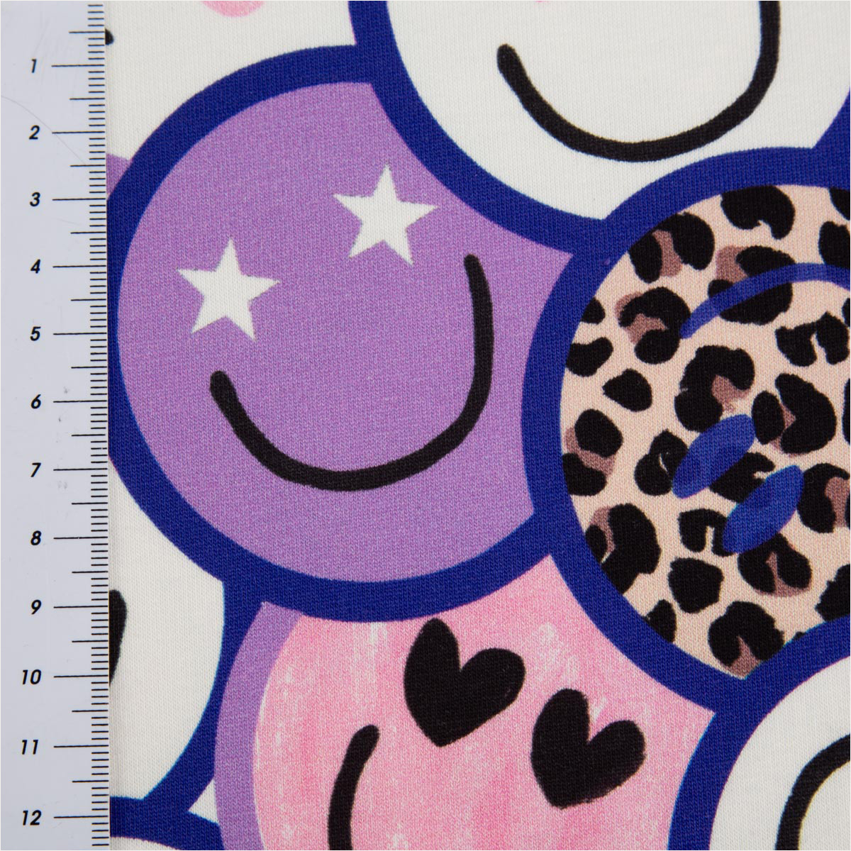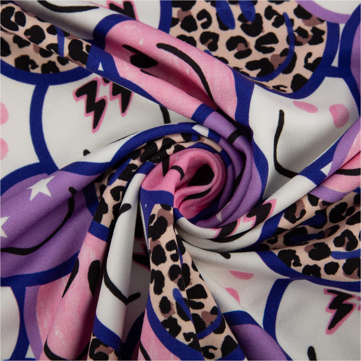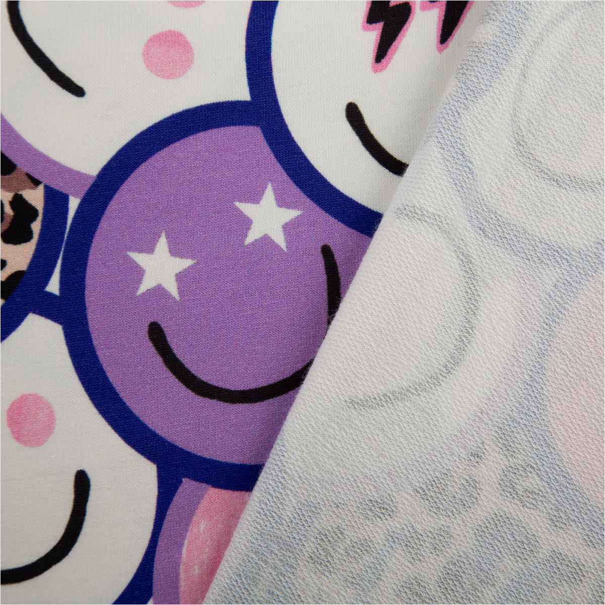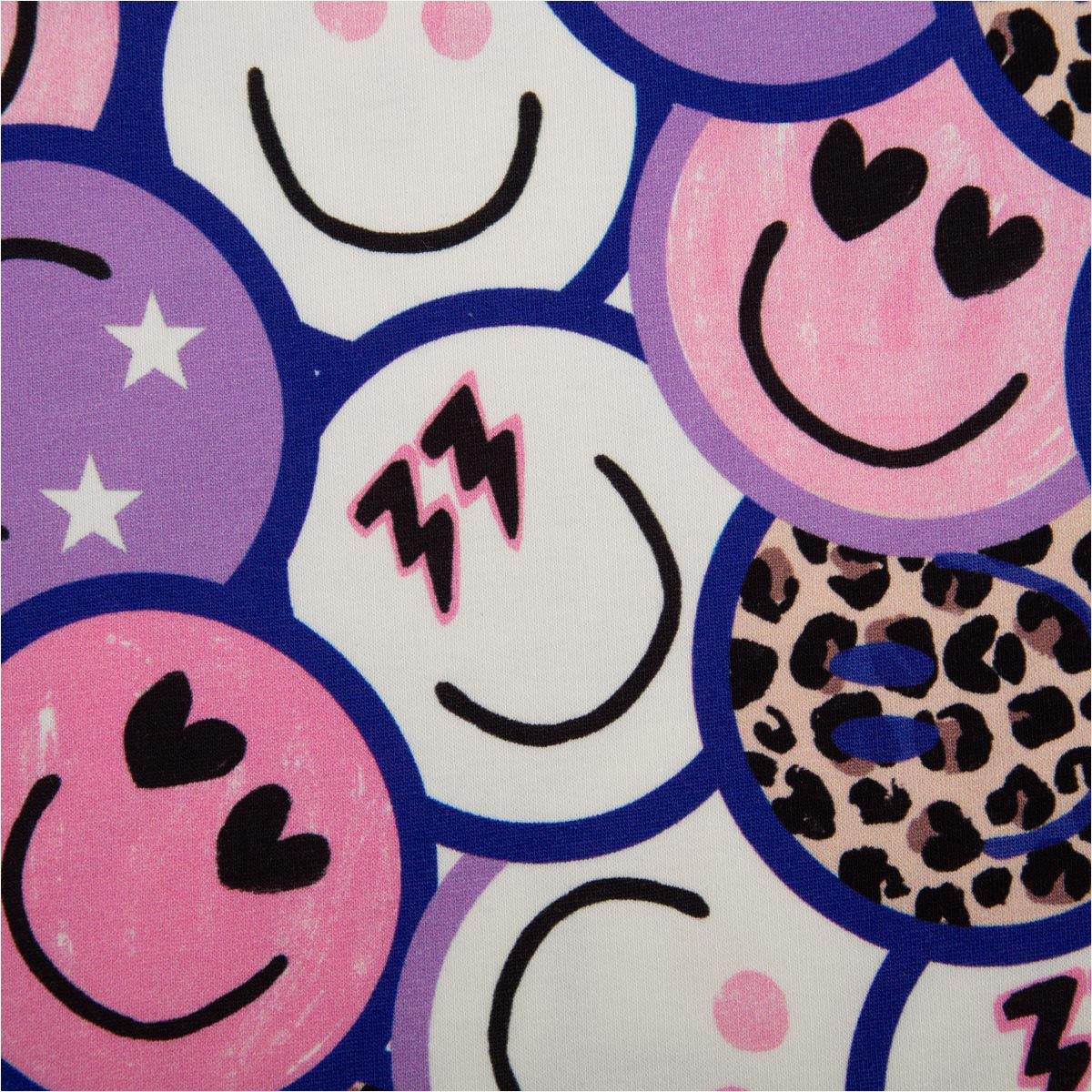 Dieser moderne French Terry Sommersweat aus der Poppy Kollektion begeistert mit einem auffälligen Digitaldruck aus Lachgesichtern, Leo-Elementen und grafischen Symbolen in lila, weiß und beige. Das fröhliche Design macht sofort gute Laune und ist perfekt für bequeme Alltagslooks für Kinder und Erwachsene.