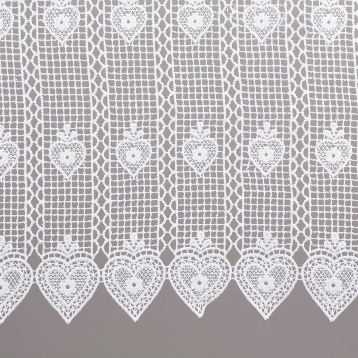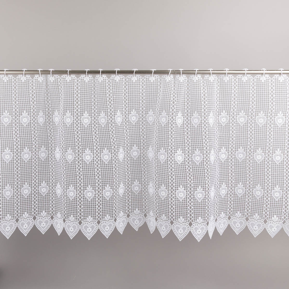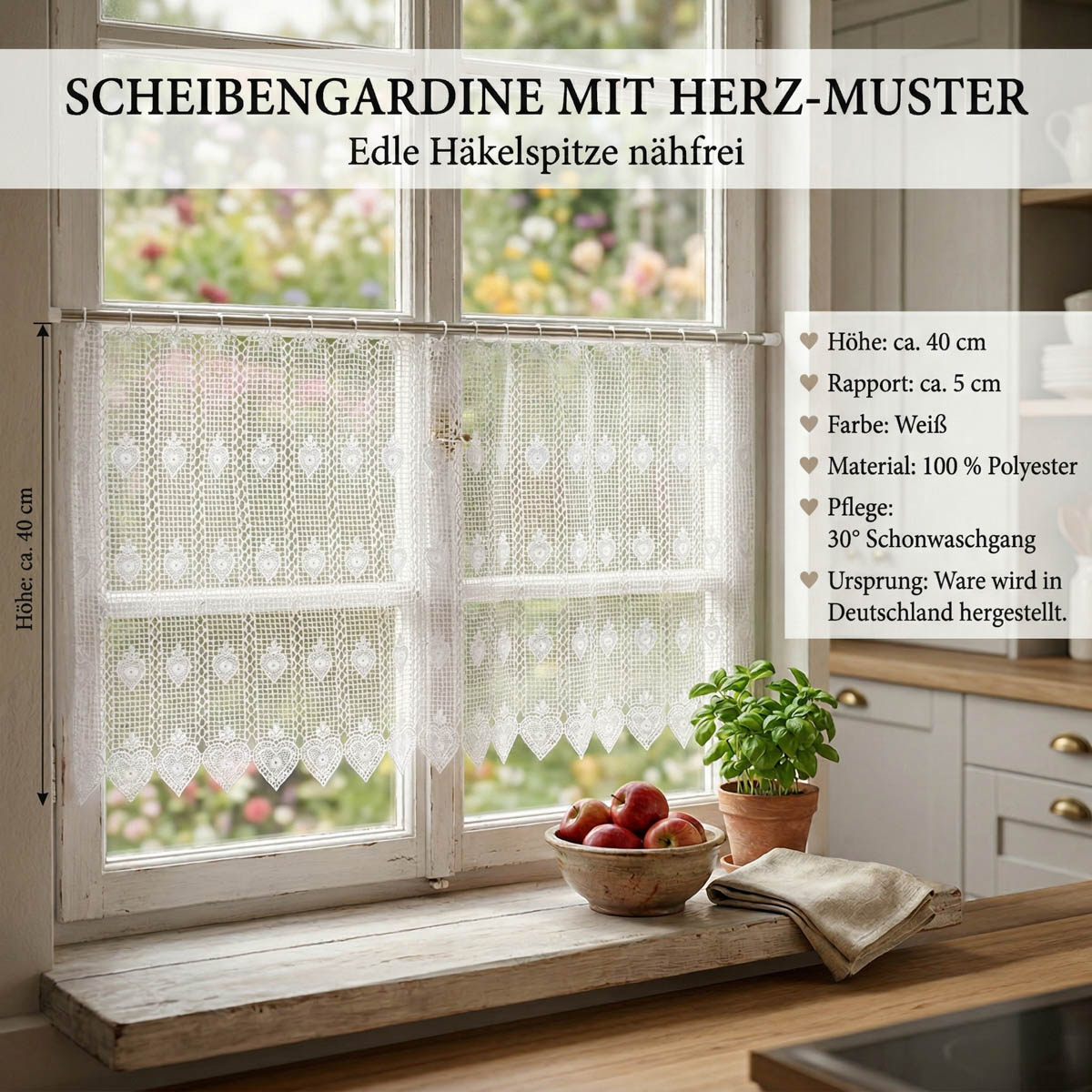 Das wiederkehrende Herzmuster verleiht der Bistrogardine eine wohnliche und traditionelle Ausstrahlung. Die Kombination aus feiner Spitzenstruktur und dekorativen Herzdetails passt hervorragend zu Einrichtungen im Landhausstil, zu romantischen Wohnideen und zu hellen, freundlichen Räumen.
