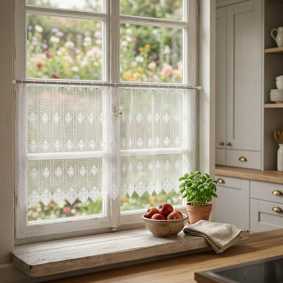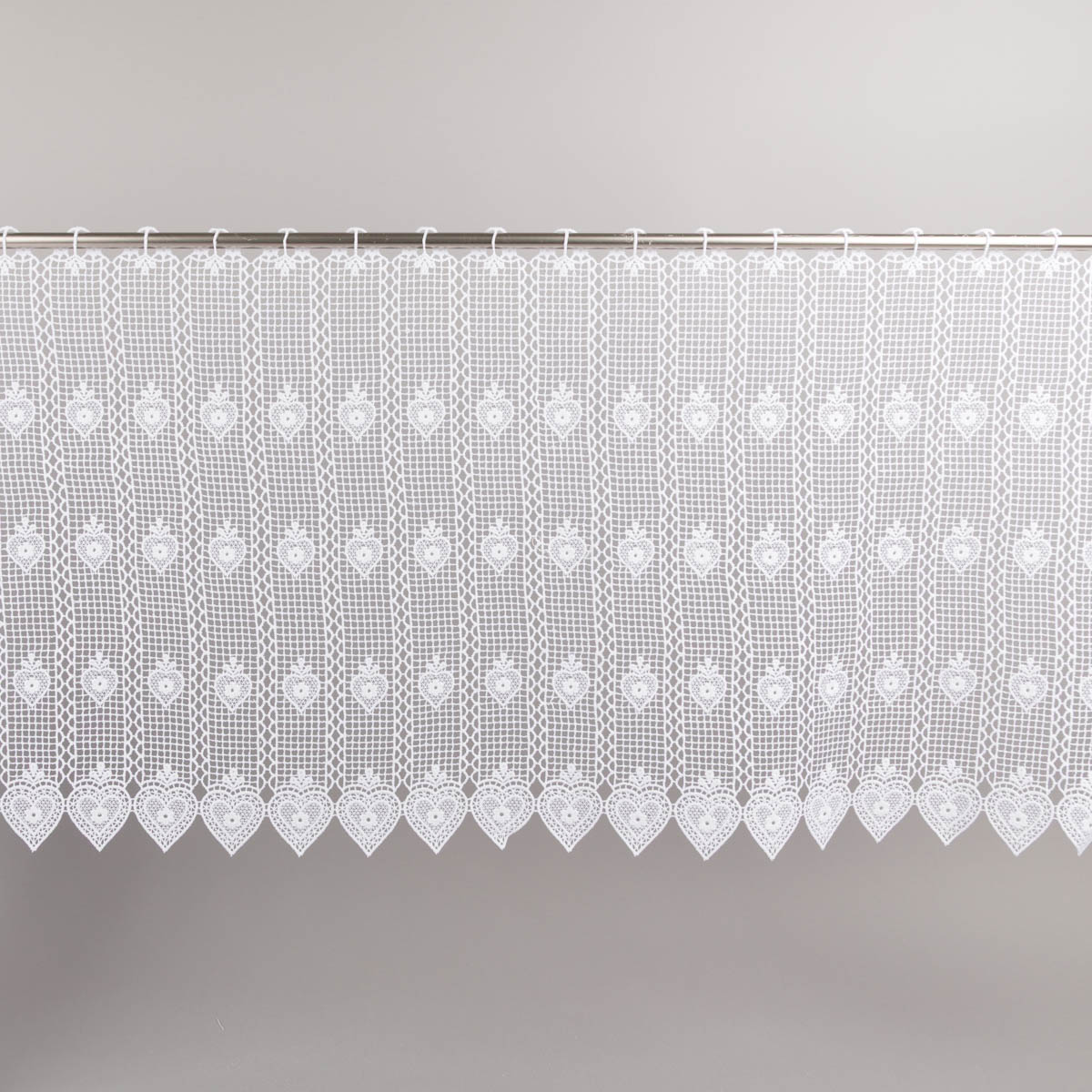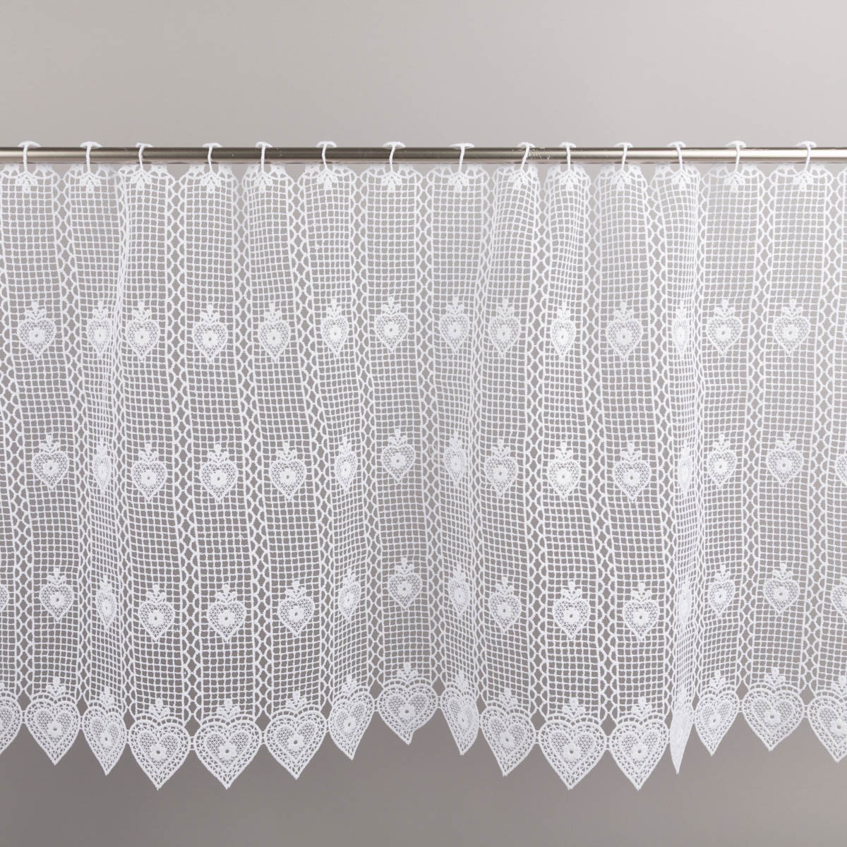 Das wiederkehrende Herzmuster verleiht der Bistrogardine eine wohnliche und traditionelle Ausstrahlung. Die Kombination aus feiner Spitzenstruktur und dekorativen Herzdetails passt hervorragend zu Einrichtungen im Landhausstil, zu romantischen Wohnideen und zu hellen, freundlichen Räumen.