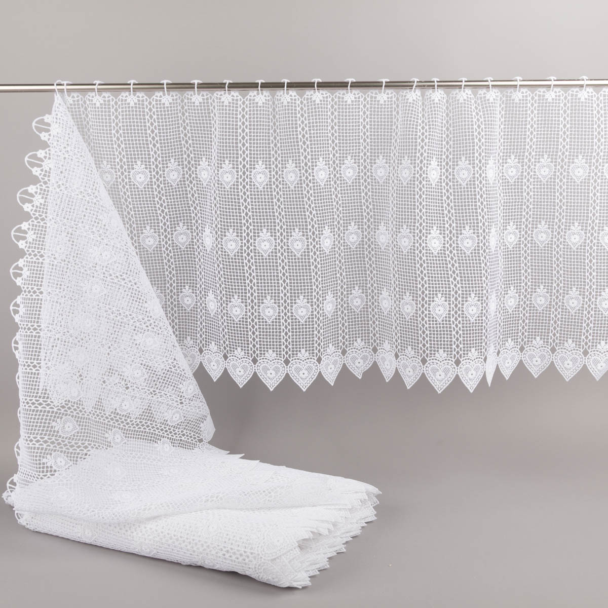Scheibengardine in weißer Häkeloptik mit romantischem Herzmotiv für kleine Fenster, Küchenfenster, Glastüren, Vitrinen oder Schranktüren im Landhausstil