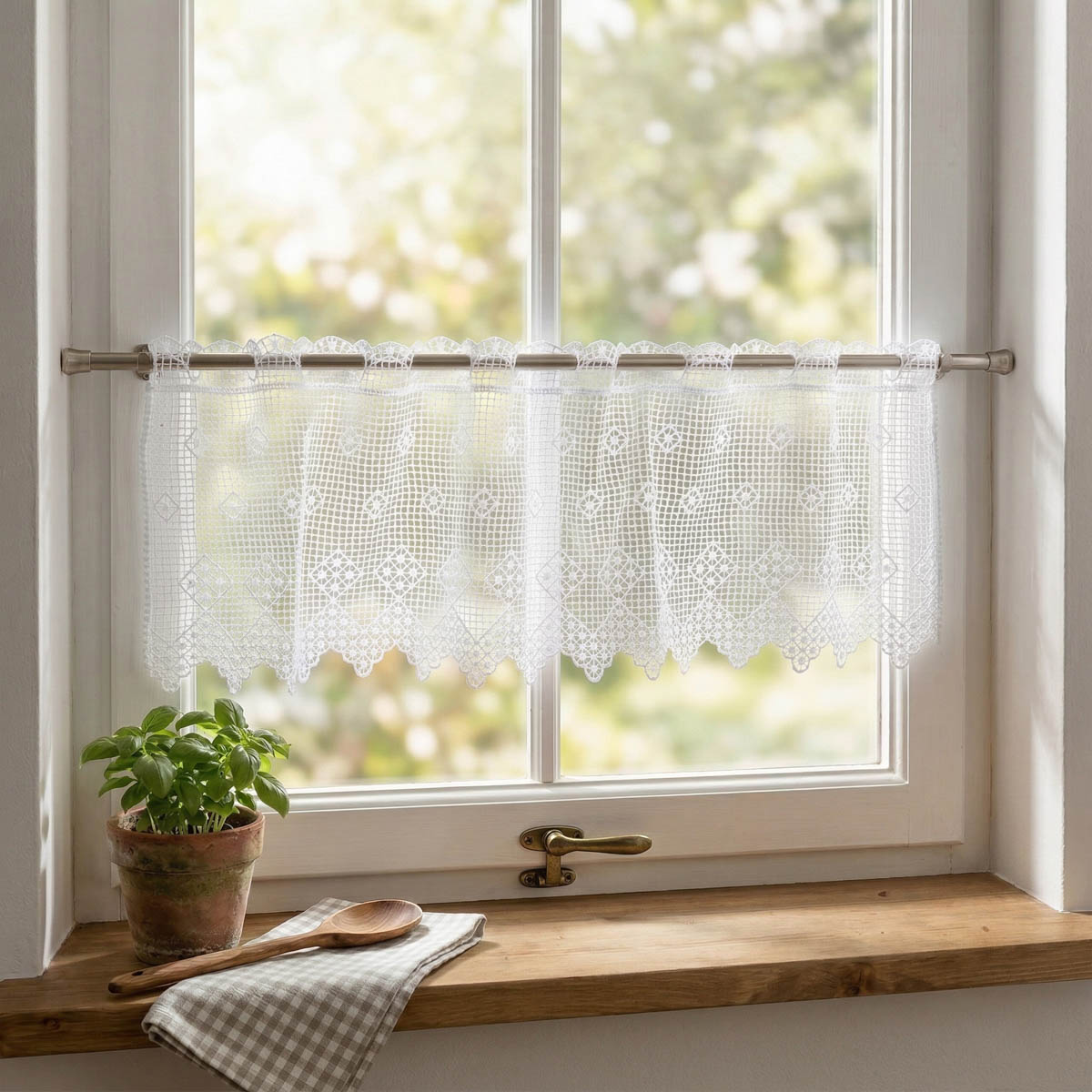 Das Design verbindet eine luftige Spitzenstruktur mit einem klaren, geometrischen Pik-Karo-Muster. Dadurch wirkt die Scheibengardine zugleich traditionell und ordentlich. Die weiße Farbgebung passt zu vielen Wohnstilen und lässt sich besonders gut mit hellen, natürlichen oder romantischen Einrichtungen kombinieren.