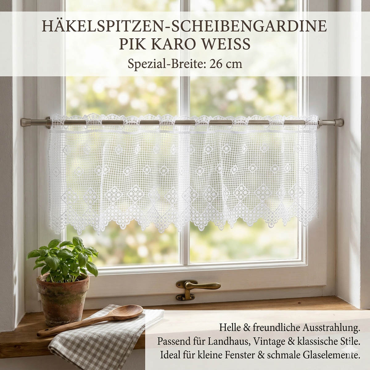 Diese Scheibengardine aus weißer Häkelspitze bringt eine leichte, dekorative Optik an dein Fenster. Das feine Pik-Karo-Muster mit filigraner Stickerei wirkt klassisch, freundlich und vielseitig kombinierbar. Mit ihrer schmalen Breite von 26 cm eignet sich die Gardine besonders gut für kleine Fensterscheiben, Glastüren, Vitrinen oder dekorative Einsätze im Landhausstil.