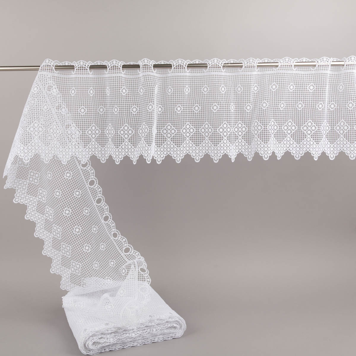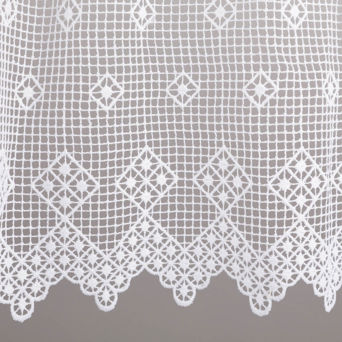 Weiße Scheibengardine aus feiner Häkelspitze mit dekorativer Stickerei und klassischem Pik-Karo-Muster für eine charmante Fensterdekoration