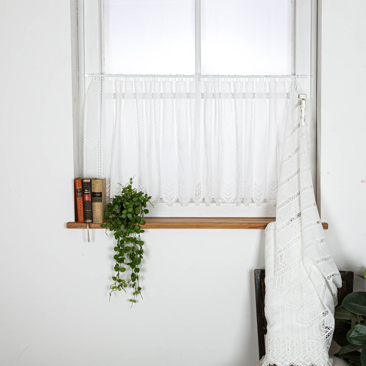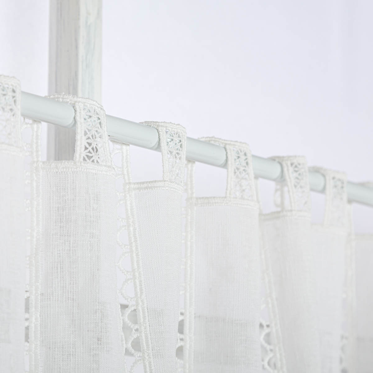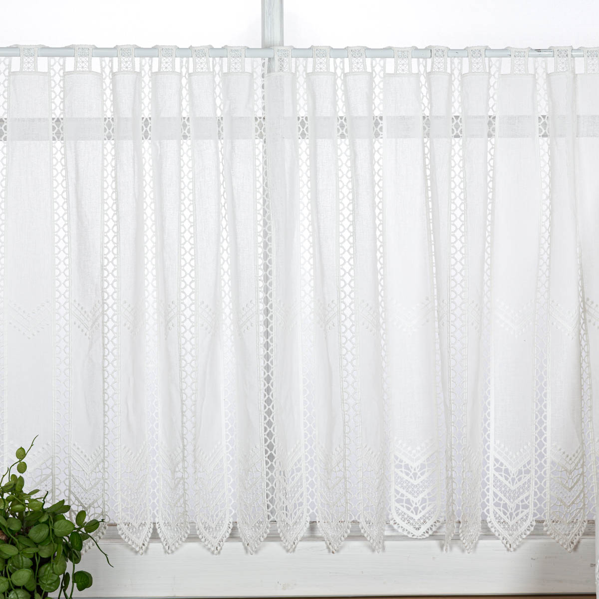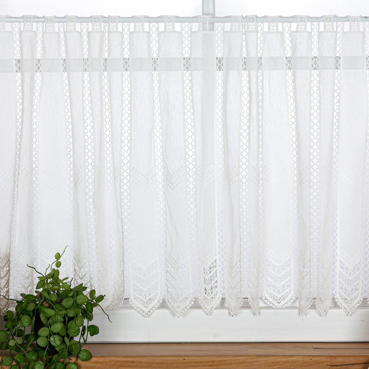 Scheibengardine in natürlicher Leinenoptik mit Makrameé-Stickerei in 60cm hoch – elegante Fensterdeko ohne Nähen