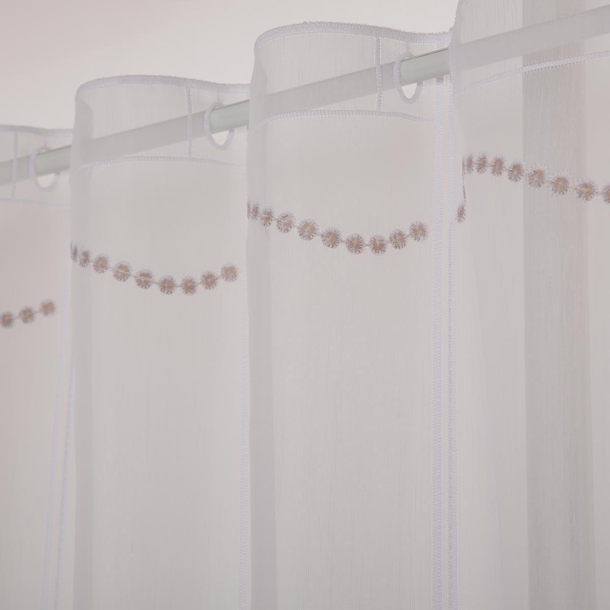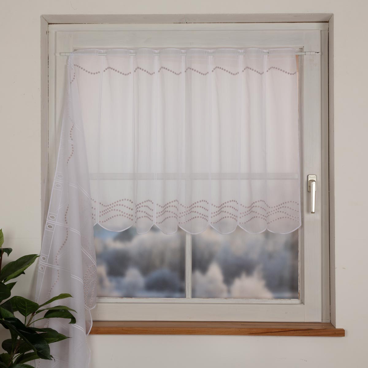 Diese zarte Scheibengardine ist die ideale Fensterdekoration für alle, die eine frische, moderne und unkomplizierte Lösung bevorzugen. Der feine weiße Voile lässt viel Tageslicht in den Raum und sorgt für ein freundliches Ambiente, während die beigefarbige Pünktchenstickerei einen charmanten, dezenten Farbakzent setzt.