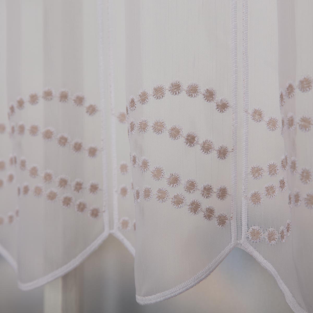 Scheibengardinen-Meterware nähfrei – Stickerei Pünktchen weiß–beige (70 cm Höhe)