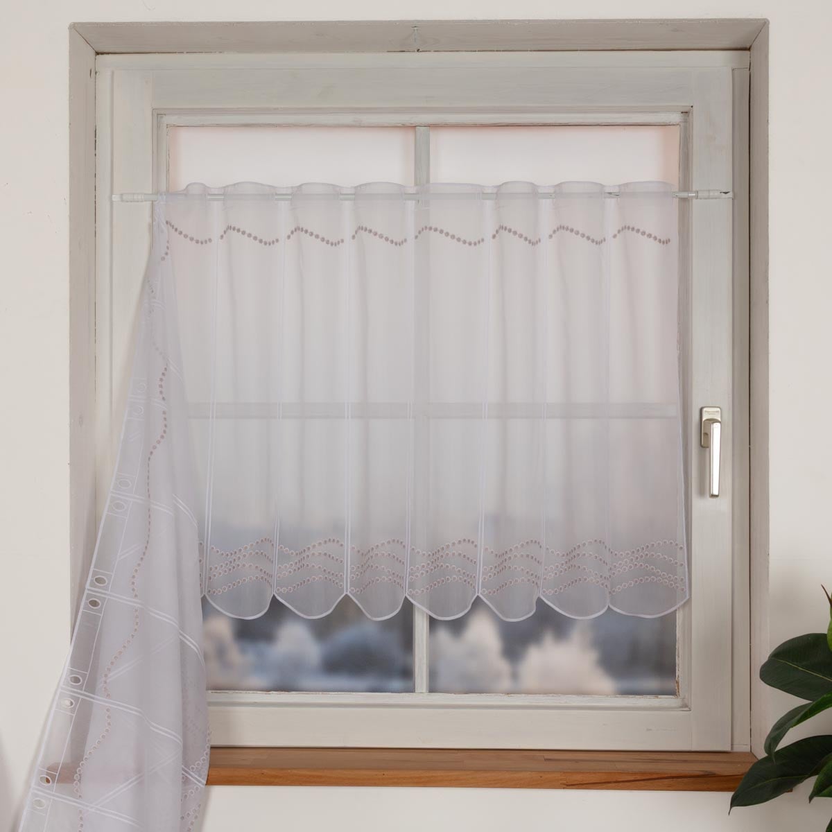 Weiße Scheibengardine aus transparentem Voile mit feiner Pünktchenstickerei in Beige