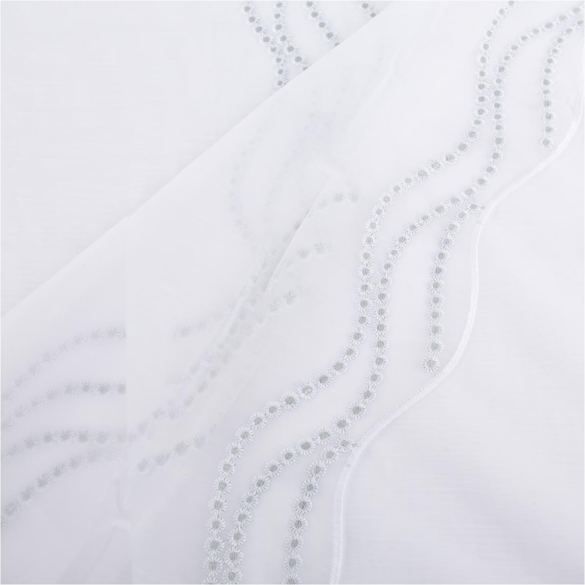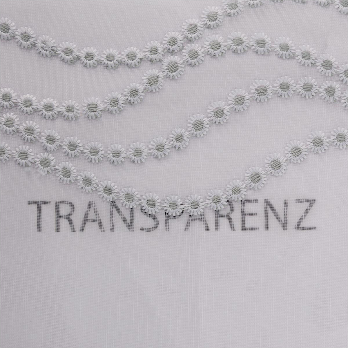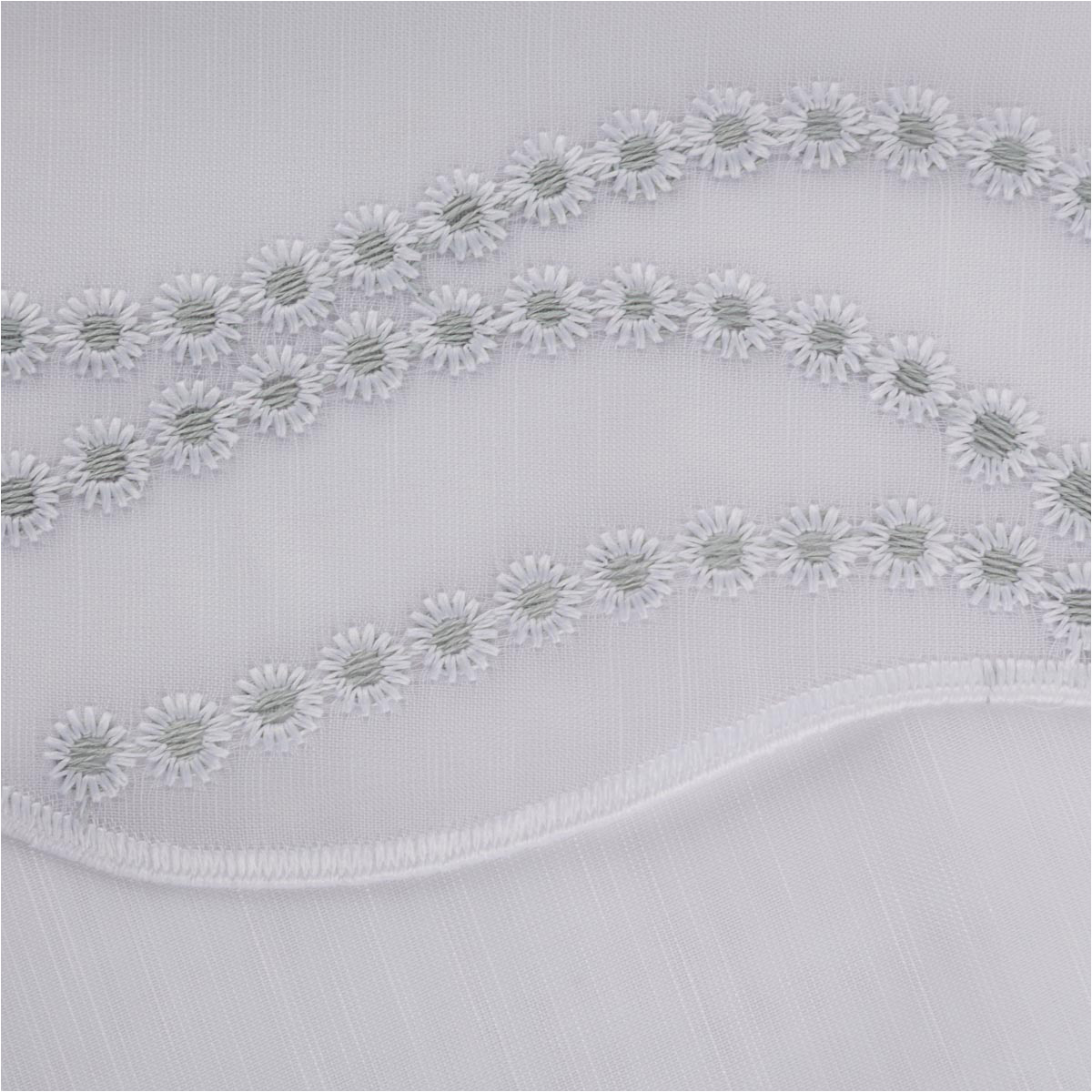 Transparenter Voile in Weiß mit feiner Pünktchen-Stickerei in Salbeigrün und dekorativer Bogenkante