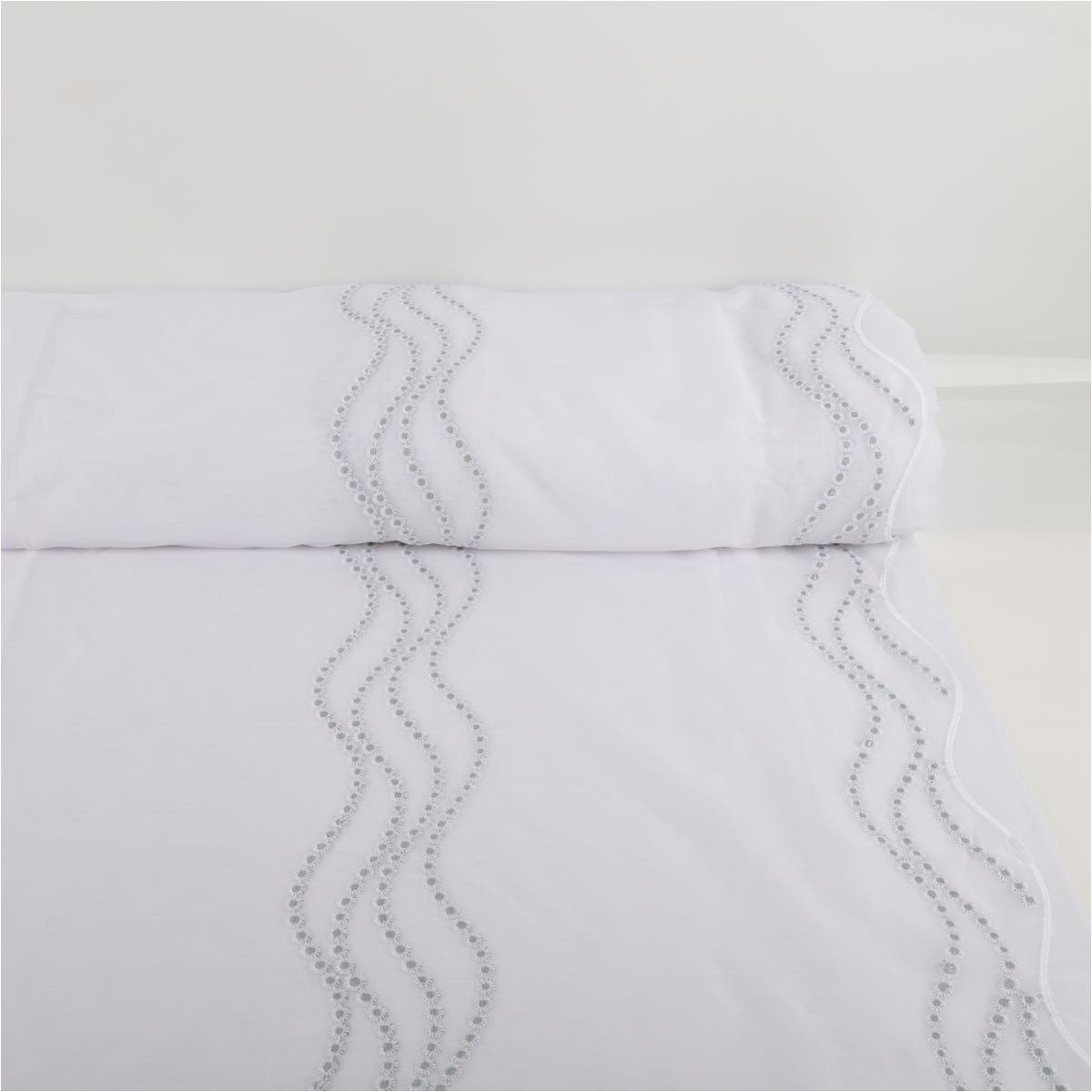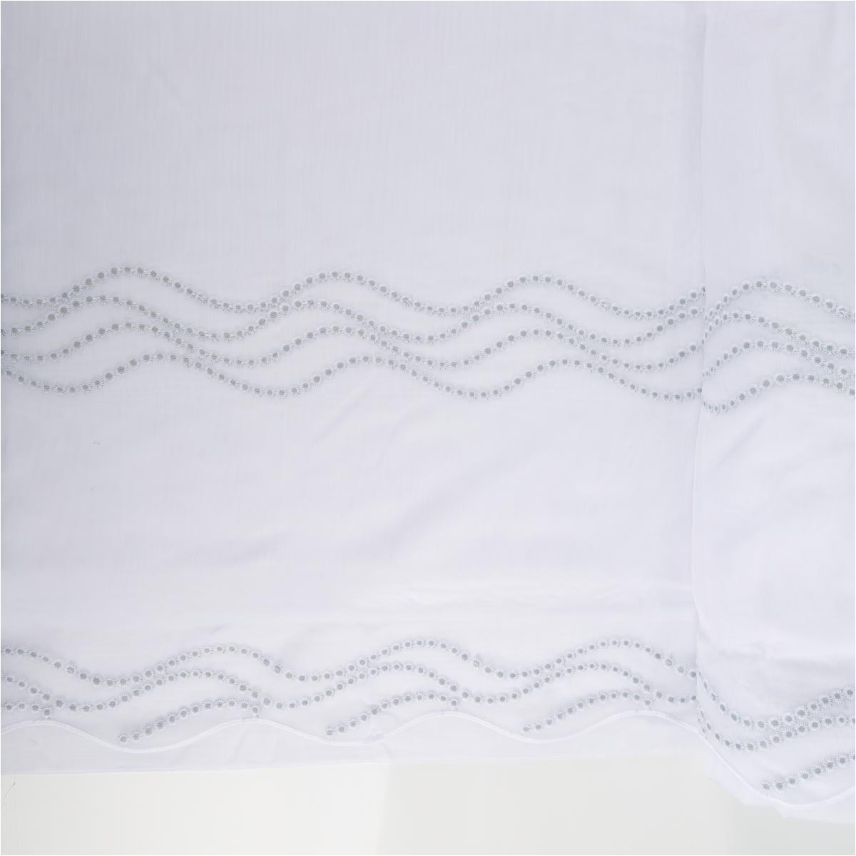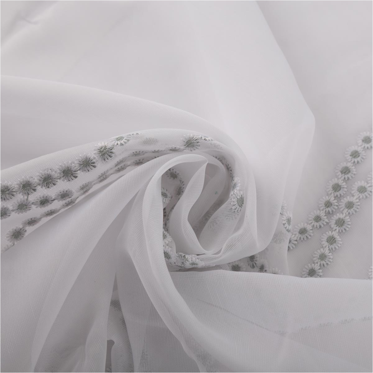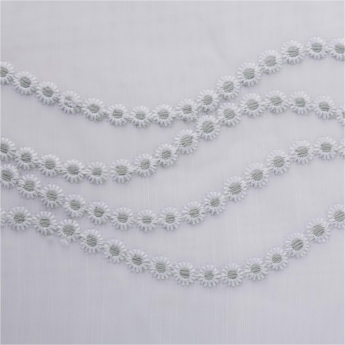 Transparenter Voile in Weiß mit feiner Pünktchen-Stickerei in Salbeigrün und dekorativer Bogenkante