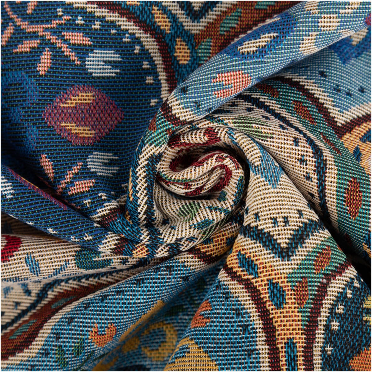 Die großflächigen Ornamente verbinden Blau, Creme, Rot, Grün und warme Naturtöne zu einem harmonischen Gesamtbild. Dadurch wirkt der Stoff lebendig, ohne unruhig zu werden. Das Muster passt wunderbar zu klassischen Einrichtungen, Boho-Ideen, orientalisch inspirierten Looks und individuellen Wohnkonzepten mit besonderem Stilgefühl.