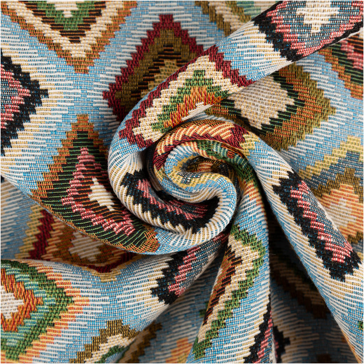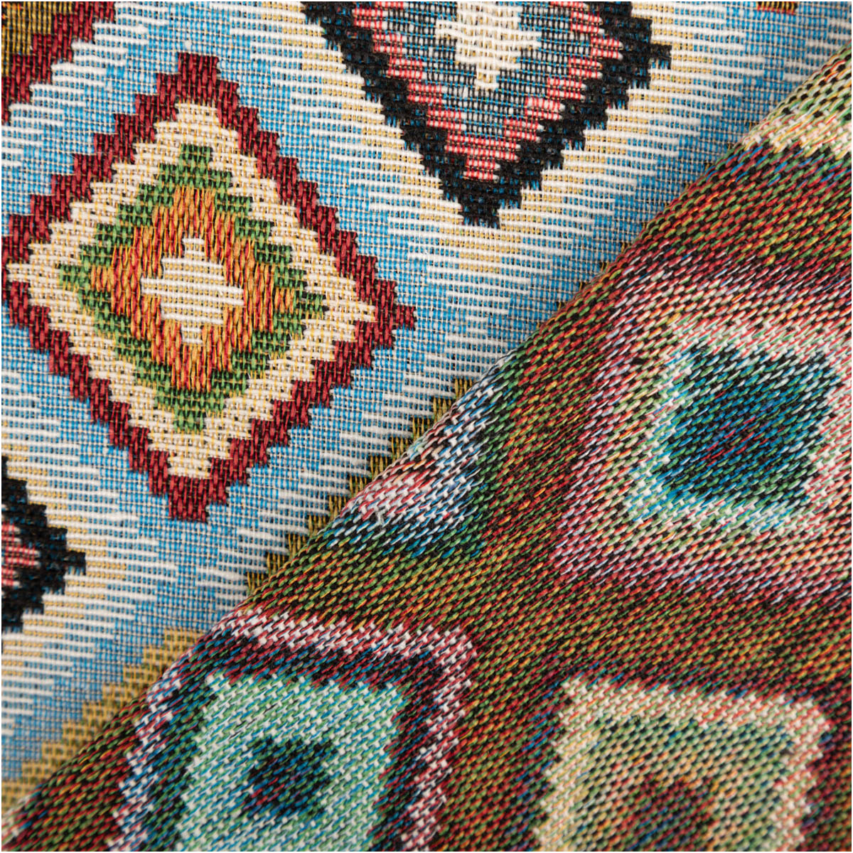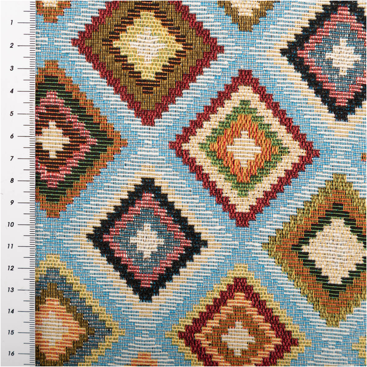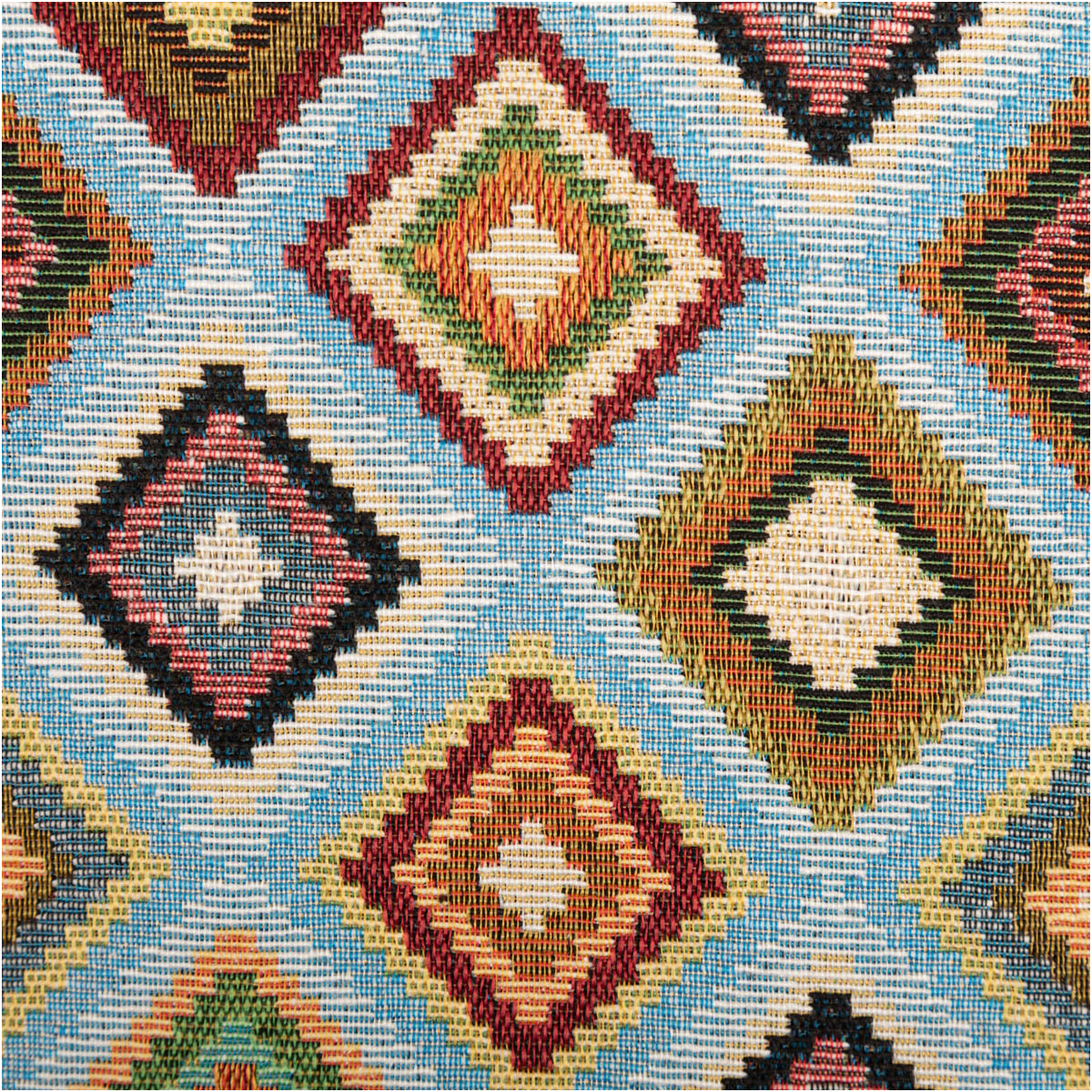 Robuster Gobelin Stoff mit dekorativem Rautenmuster in Hellblau und bunten Akzentfarben für Wohnideen mit Charakter