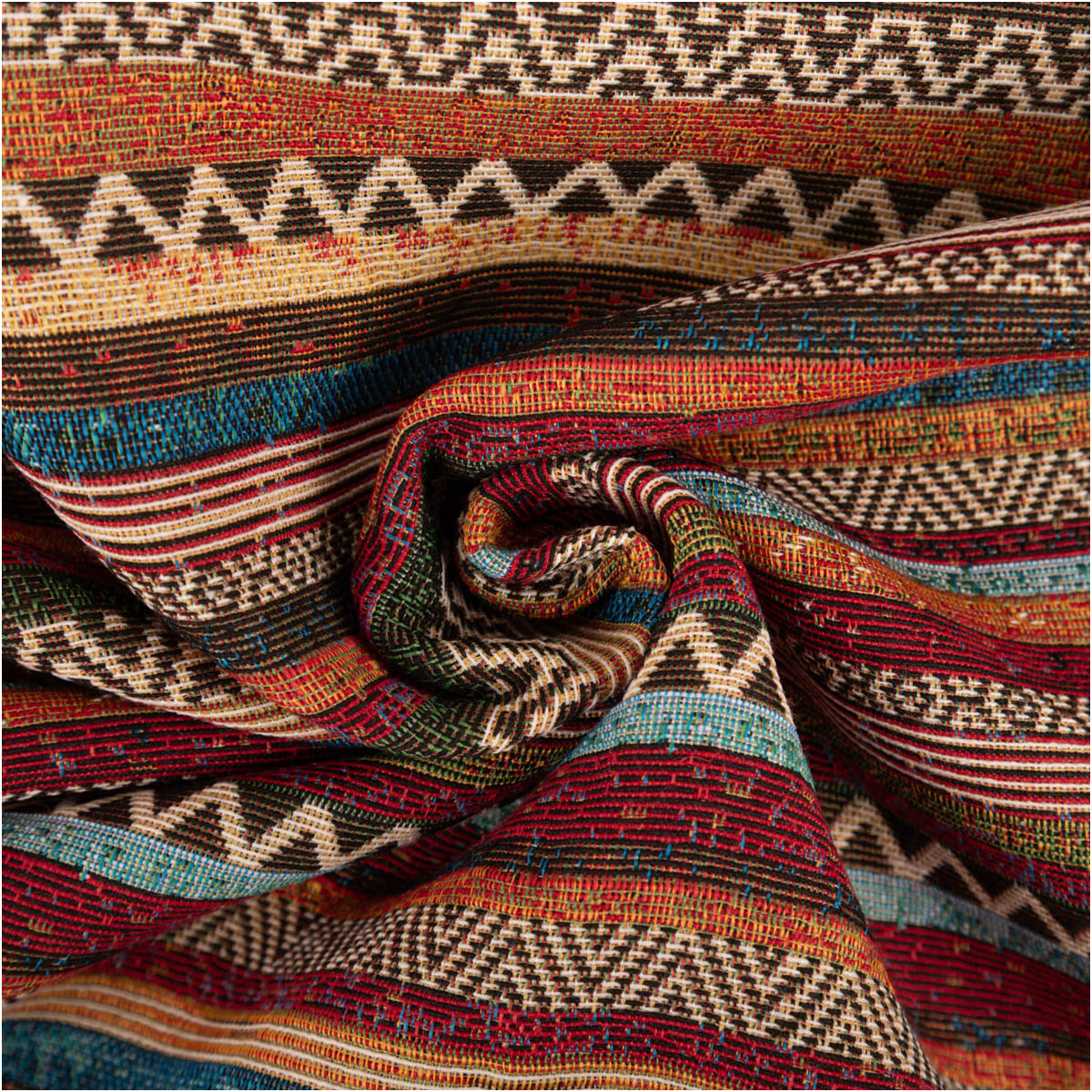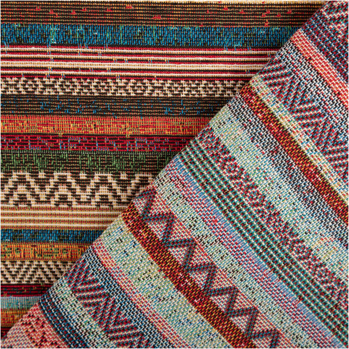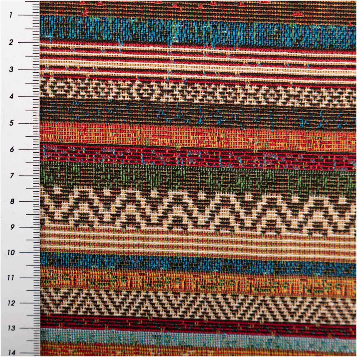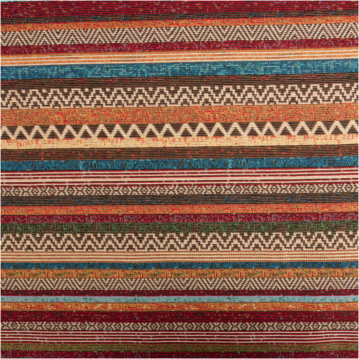 Dieser Gobelin Stoff mit Terrawave Streifen kombiniert warme Erdtöne mit lebendigen Farben und bringt einen ausdrucksstarken, dekorativen Look in dein Zuhause. Die horizontalen Streifen mit geometrischen Mustern erinnern an Ethno- und Boho-Stil und sorgen für eine besondere, wohnliche Atmosphäre.