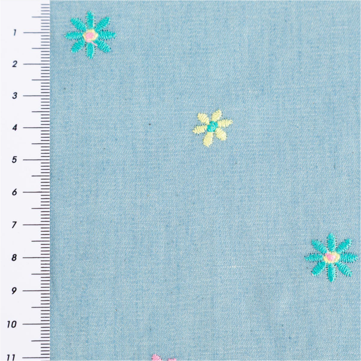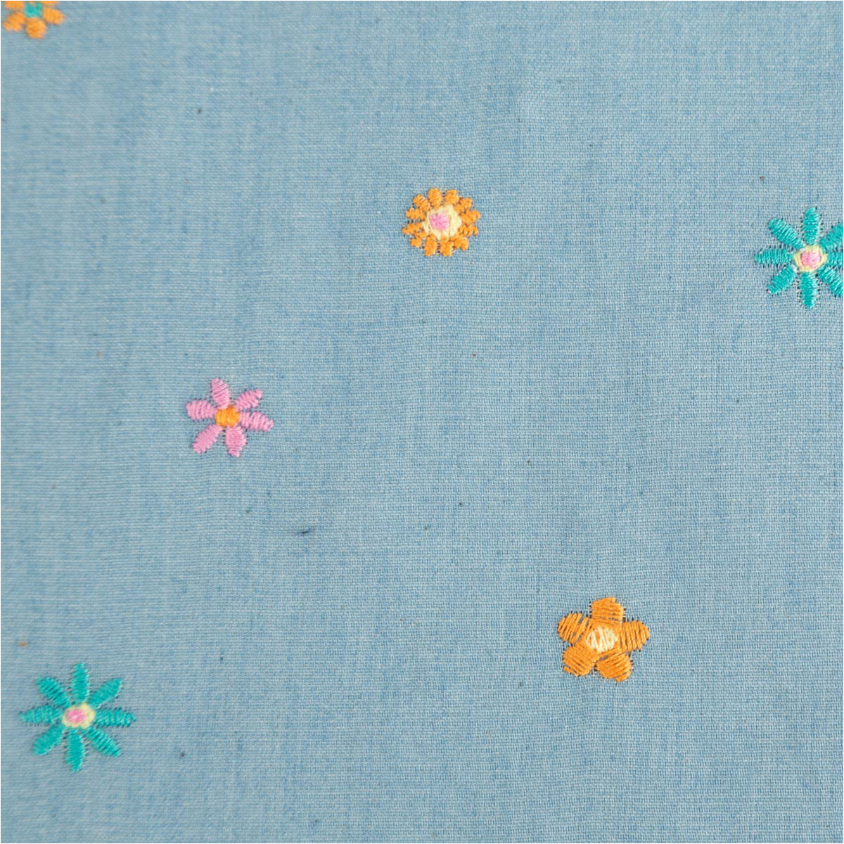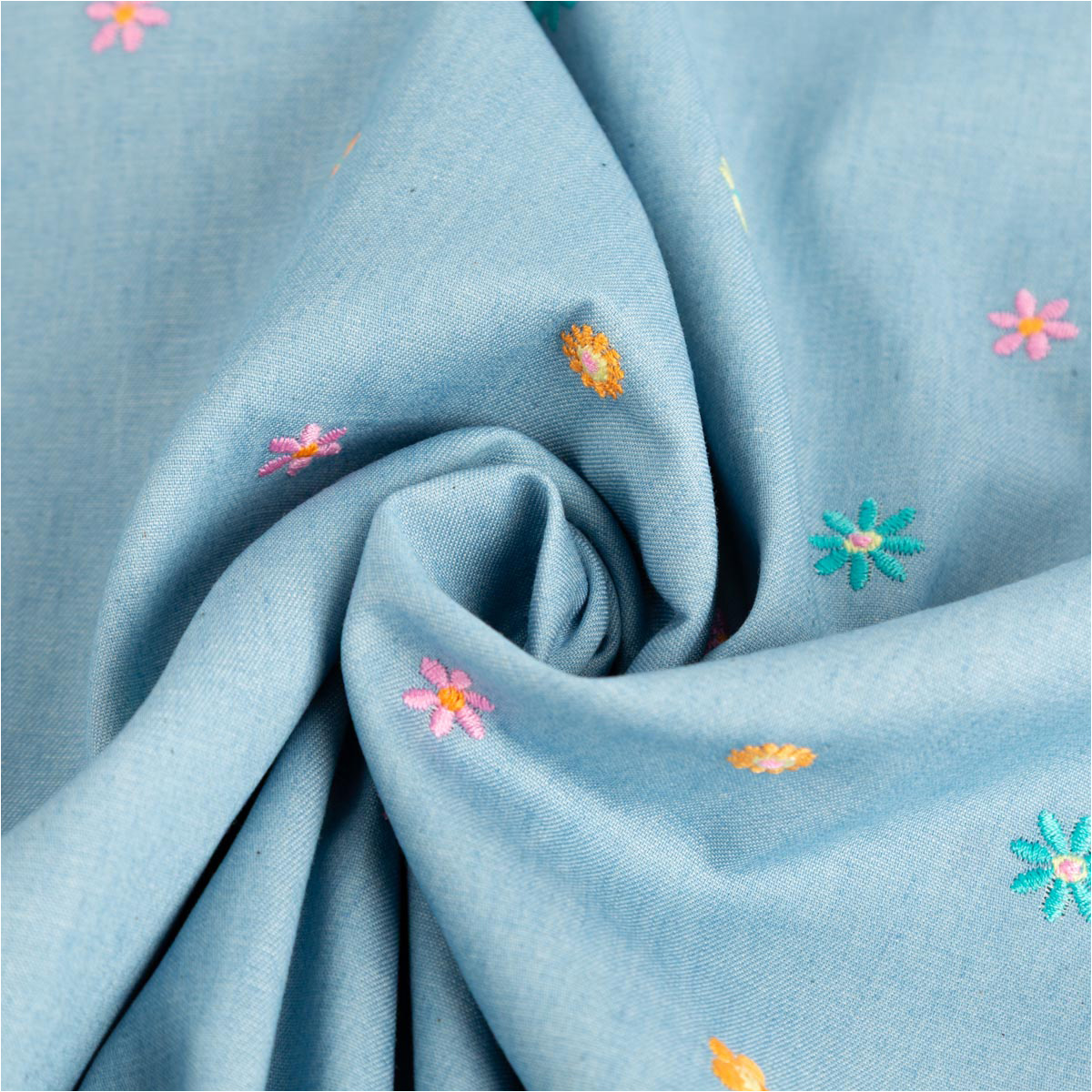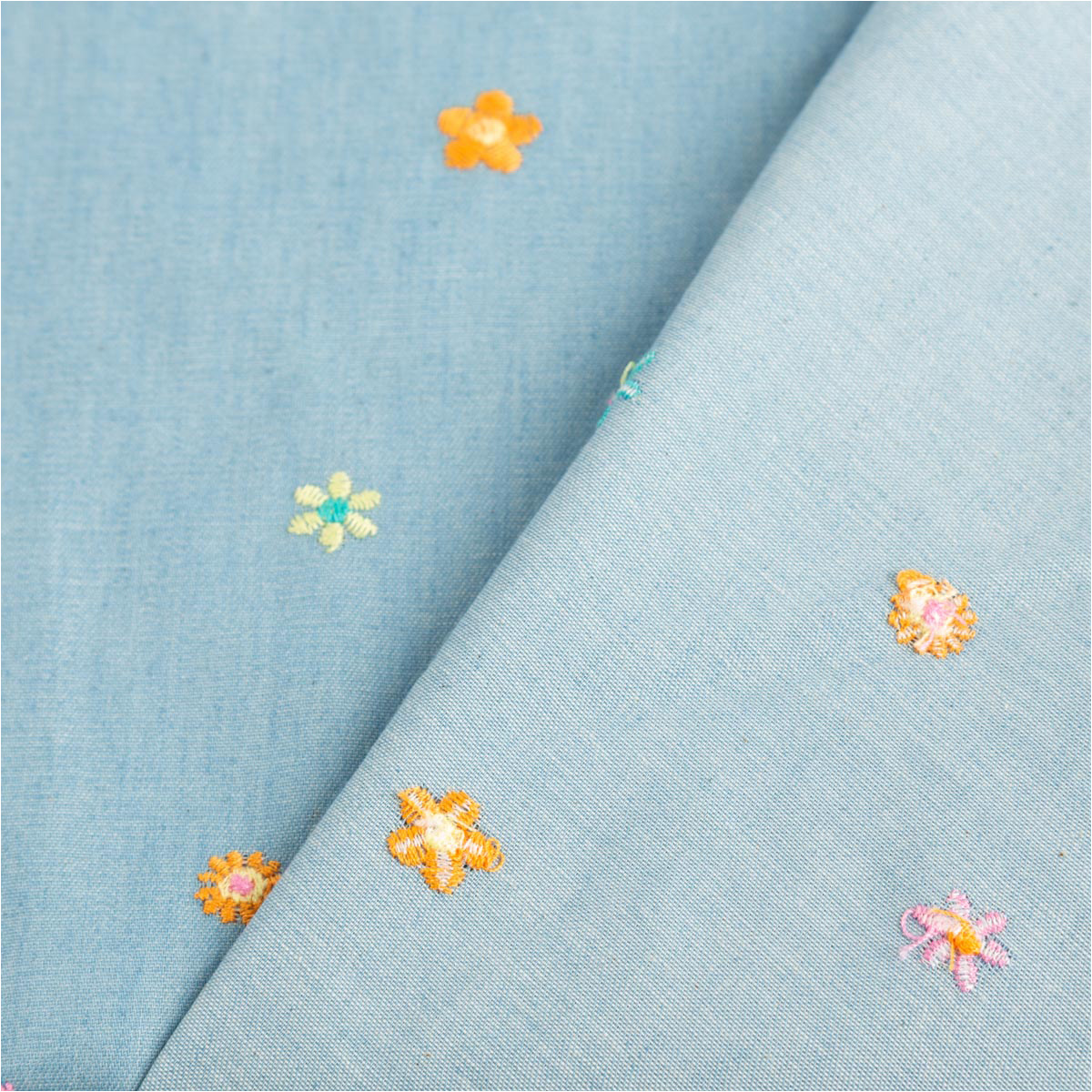Jeansstoff Chambray garngefärbt bestickt mit Blüten – hellblau bunt