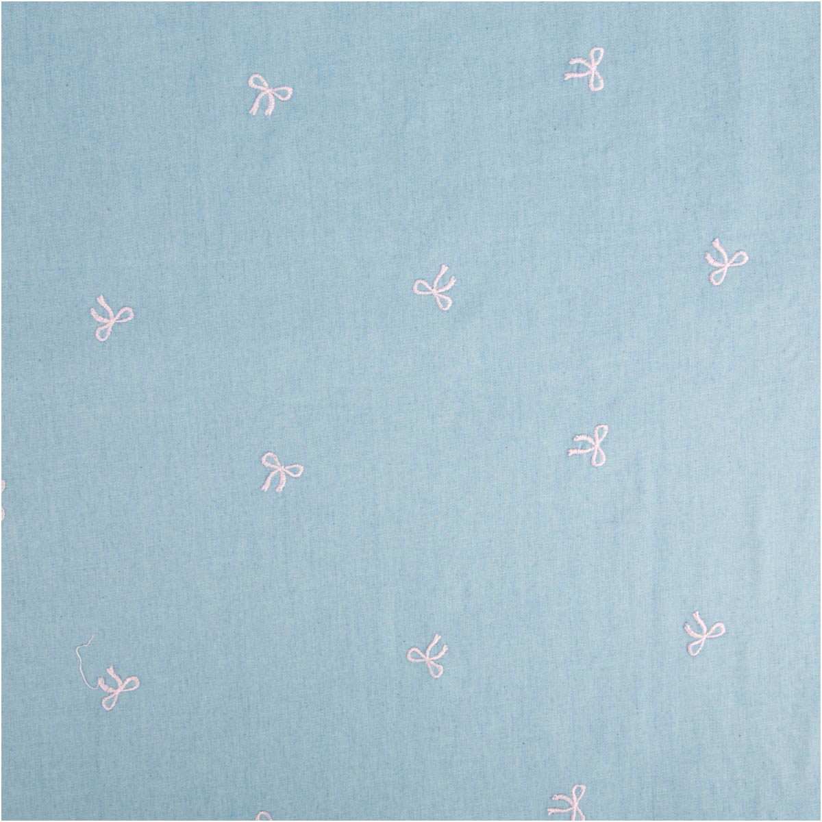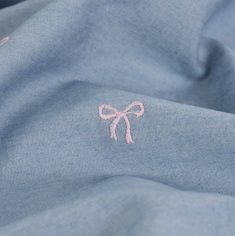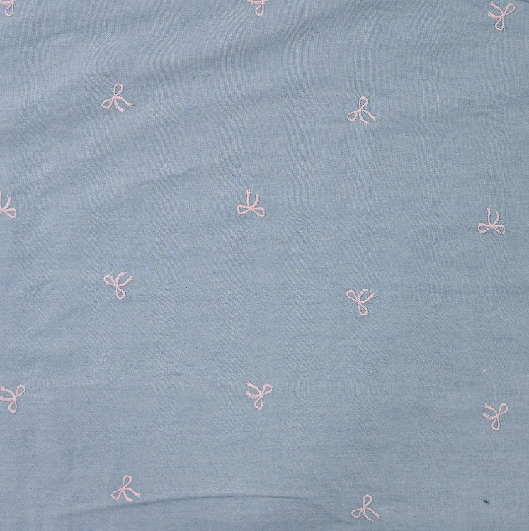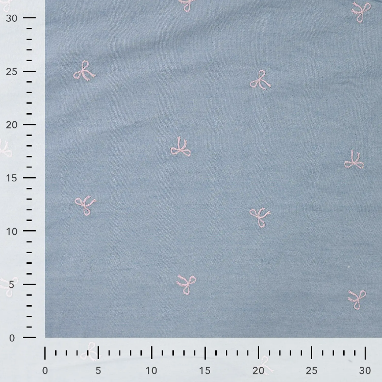 Dieser garngefärbte Jeansstoff aus Chambray überzeugt durch seine sommerlich-leichte Qualität und die liebevolle Stickerei mit kleinen rosa Schleifen. Der hellblaue Grund wirkt frisch und ruhig, während die feinen Stickdetails dem Stoff eine besondere, hochwertige Ausstrahlung verleihen.