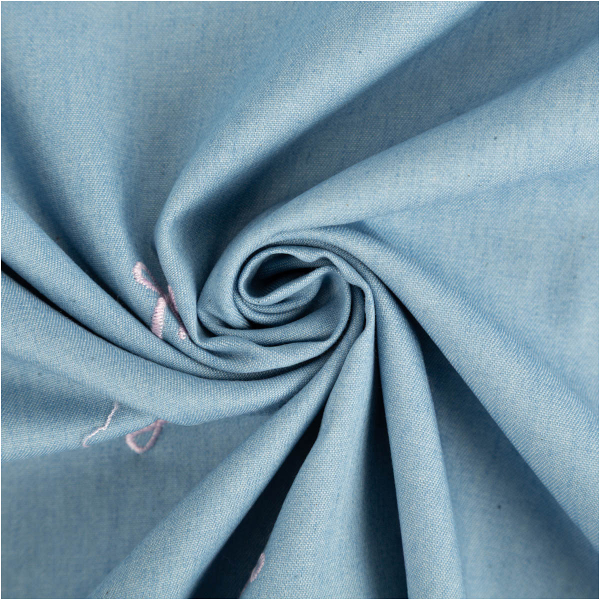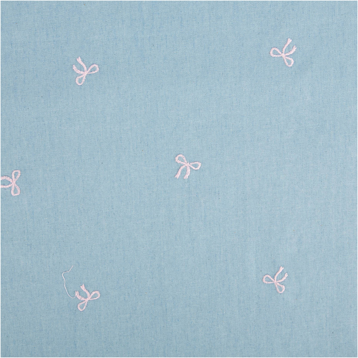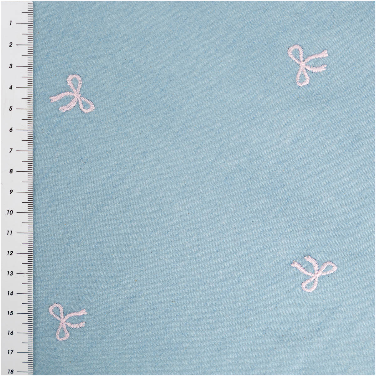 Dieser garngefärbte Jeansstoff aus Chambray überzeugt durch seine sommerlich-leichte Qualität und die liebevolle Stickerei mit kleinen rosa Schleifen. Der hellblaue Grund wirkt frisch und ruhig, während die feinen Stickdetails dem Stoff eine besondere, hochwertige Ausstrahlung verleihen.