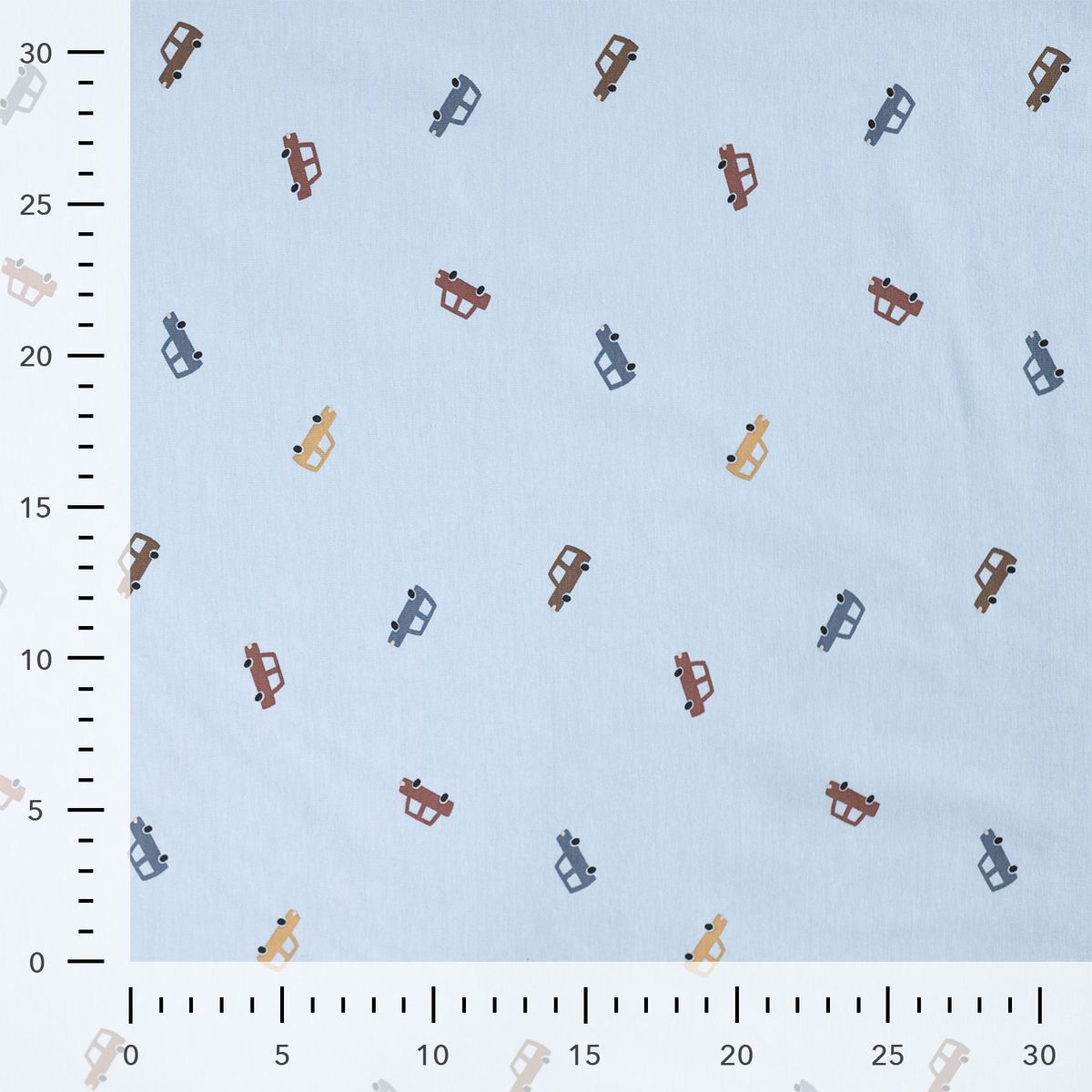 Die kleinen Autos sind locker verteilt und bleiben dezent. Dadurch passt der Stoff wunderbar zu Unis und Bündchen in Blau, Sand, Braun oder Rostrot.